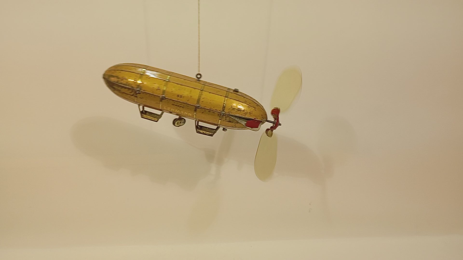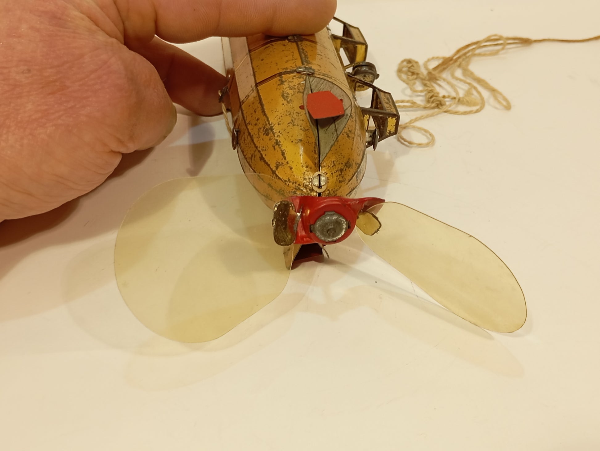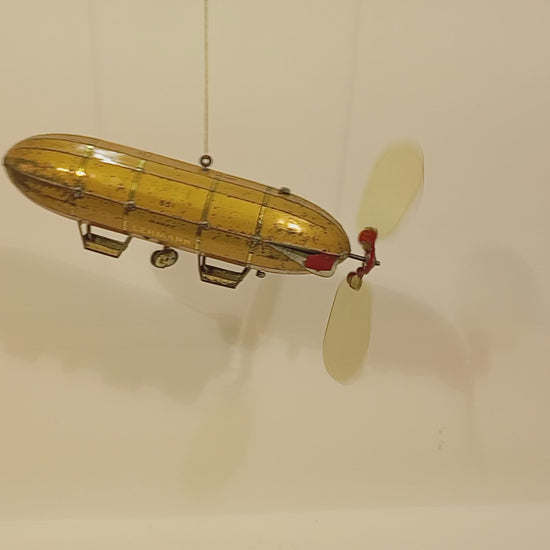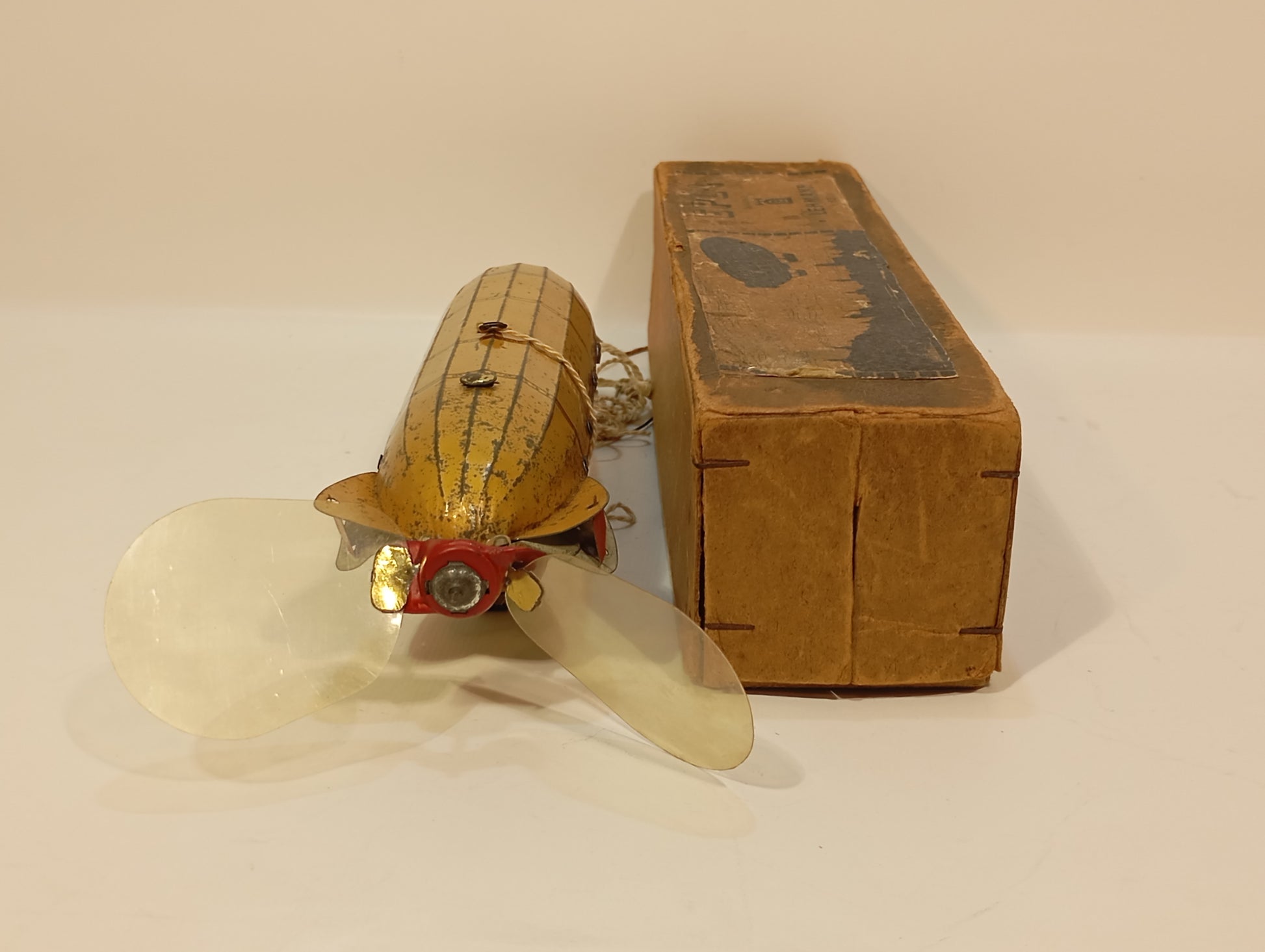 In edlem Chromgold lithographiert, mit funktionierendem Uhrwerk und originalem Propeller. Geliefert im Originalkarton, der altersbedingt übliche Gebrauchsspuren aufweist. Insgesamt, gemessen am Alter von 1925, in sehr gutem und gepflegtem Zustand. Der Originalkarton misst 24 cm.