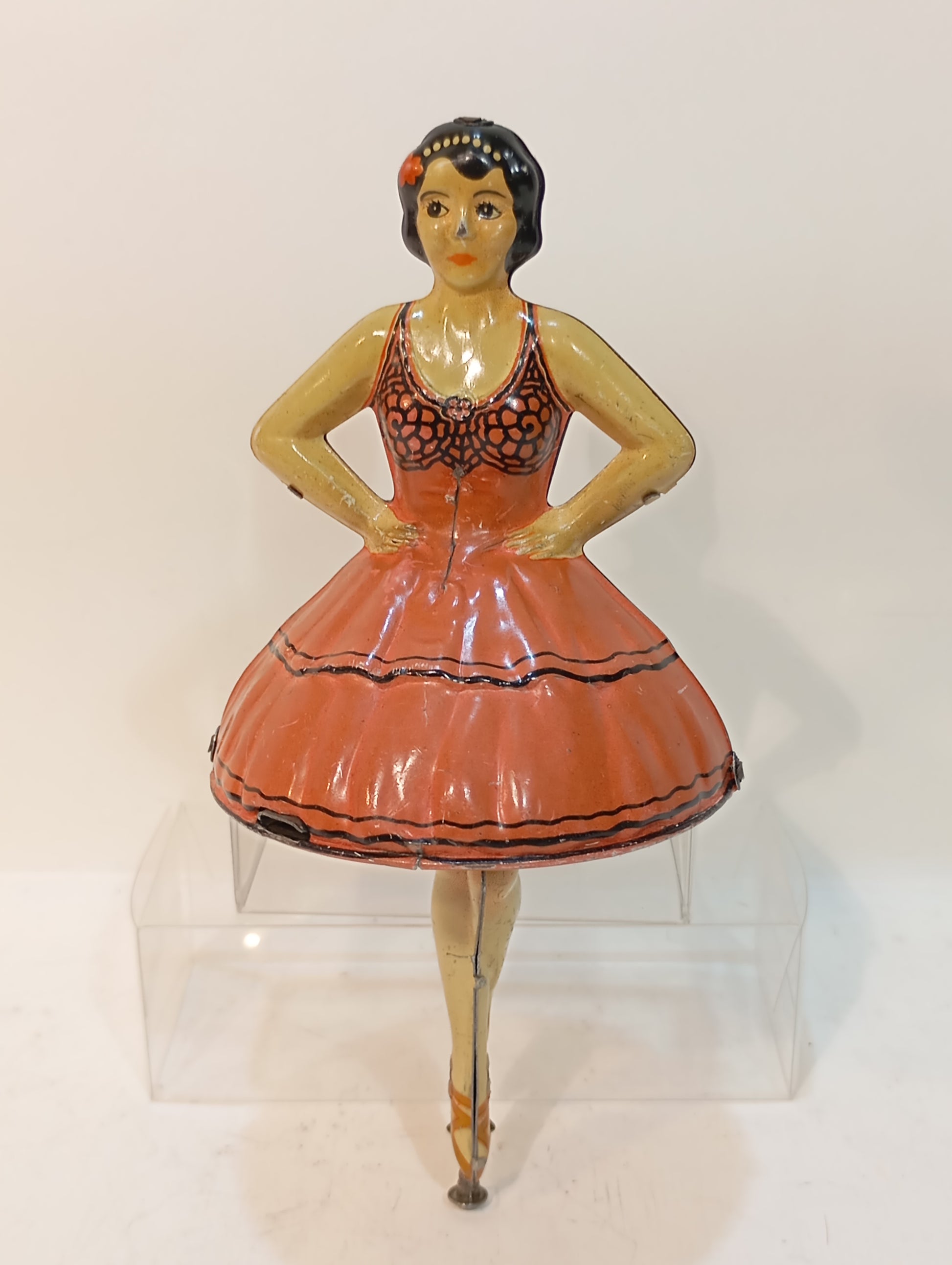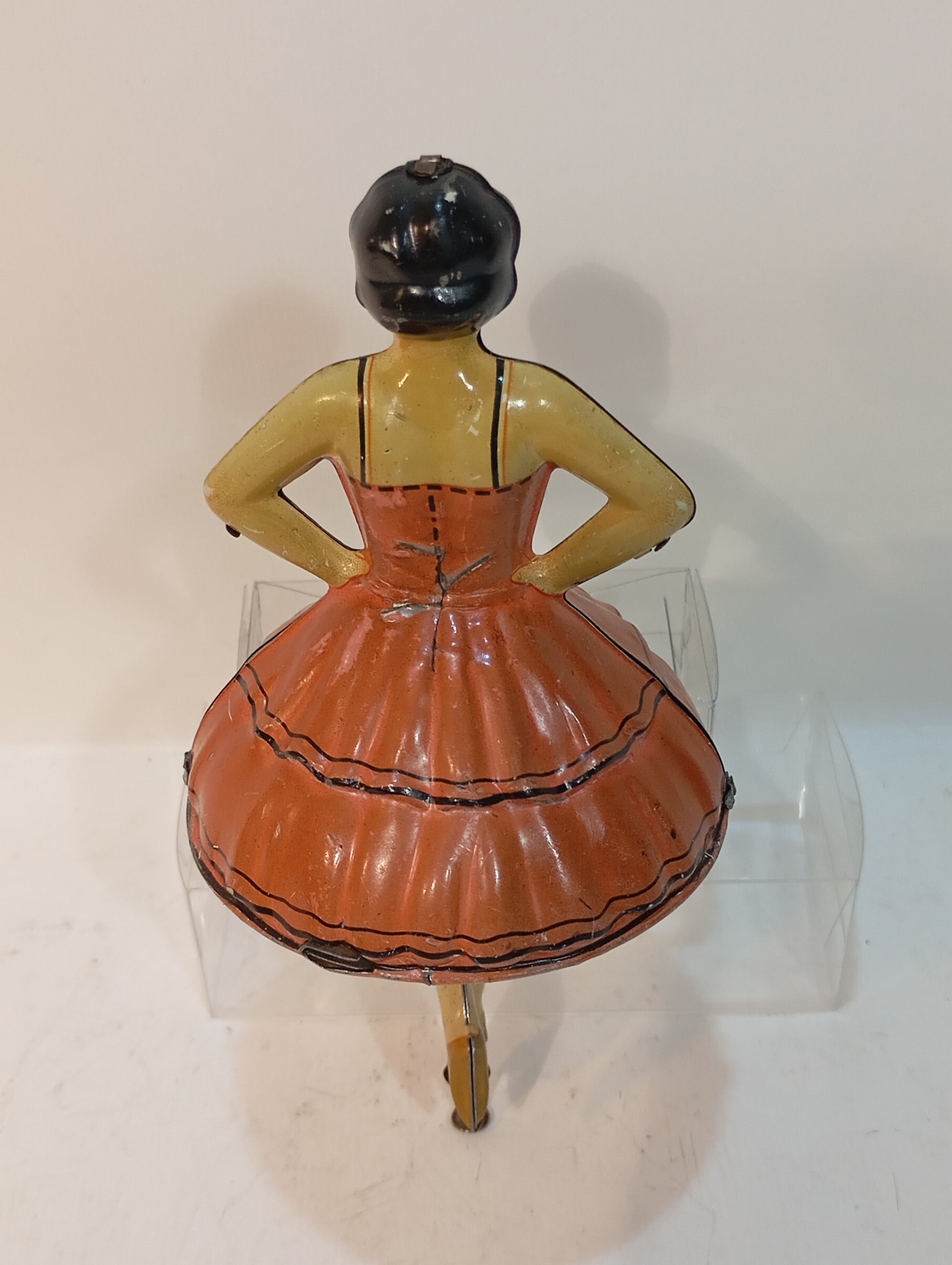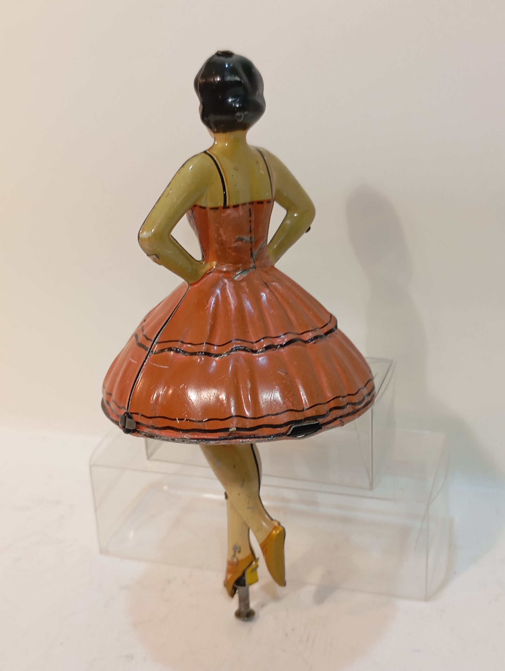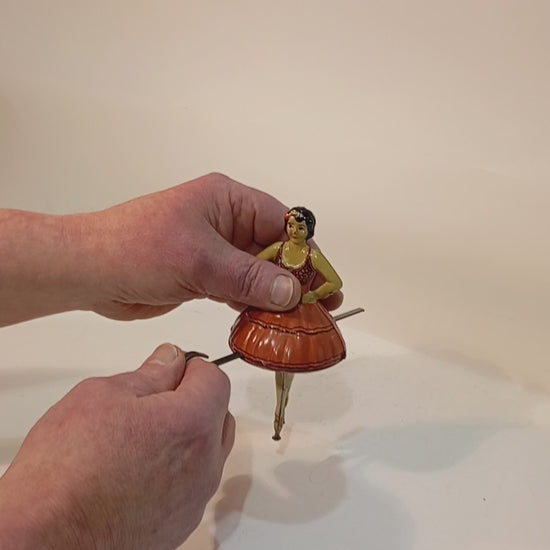 Außergewöhnlich seltene Tanzfigur mit Antriebsstange, sorgfältig im Originalkarton aufbewahrt. Es handelt sich um eine sogenannte Ballerina-Tänzerin aus der Zeit um 1920, mit einer Höhe von 15 cm. Der Antrieb funktioniert einwandfrei. Das Stück befindet sich in einem sehr schönen, originalen und fein lithographierten Zustand.