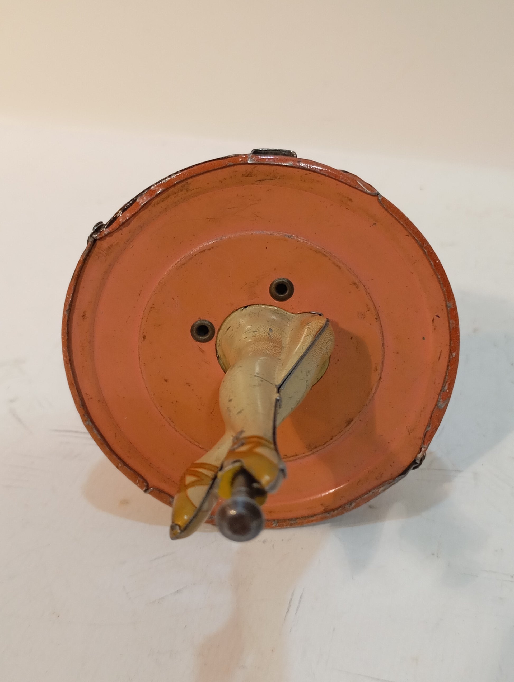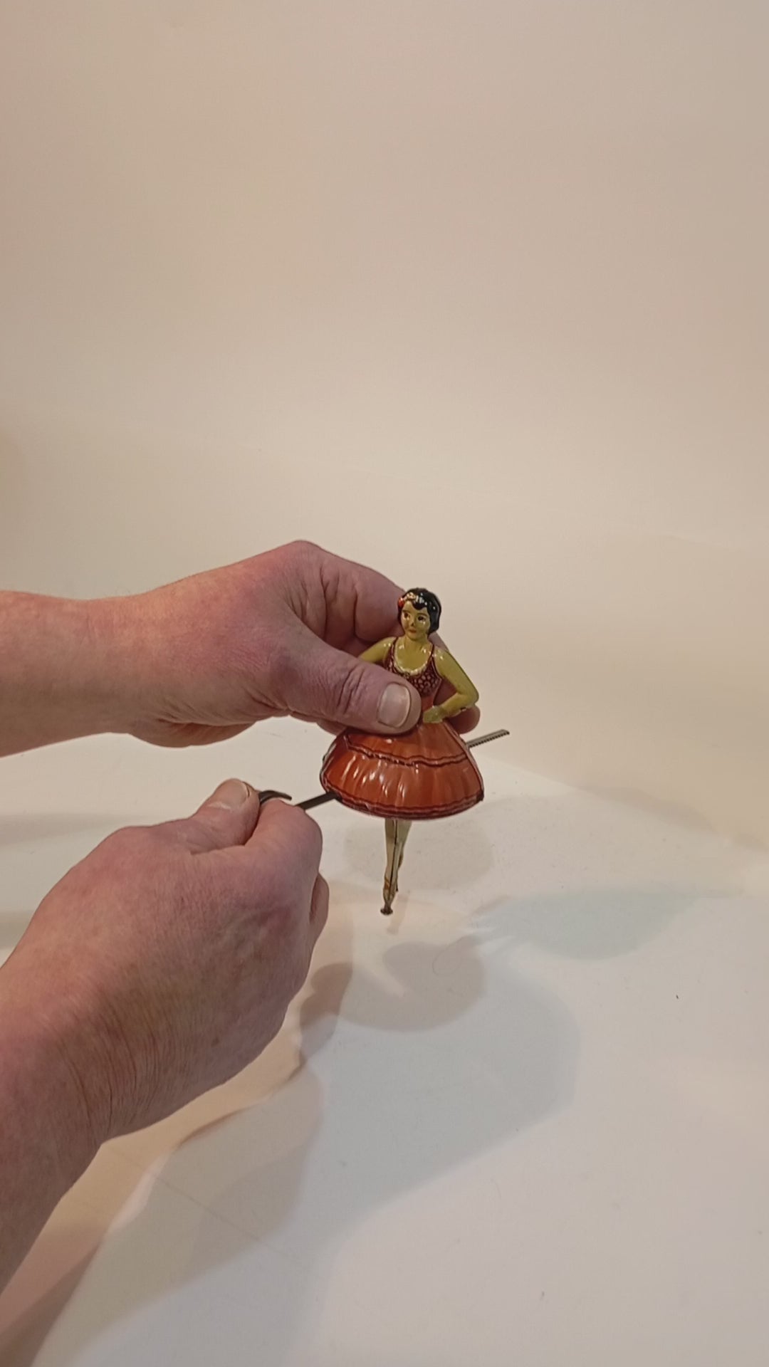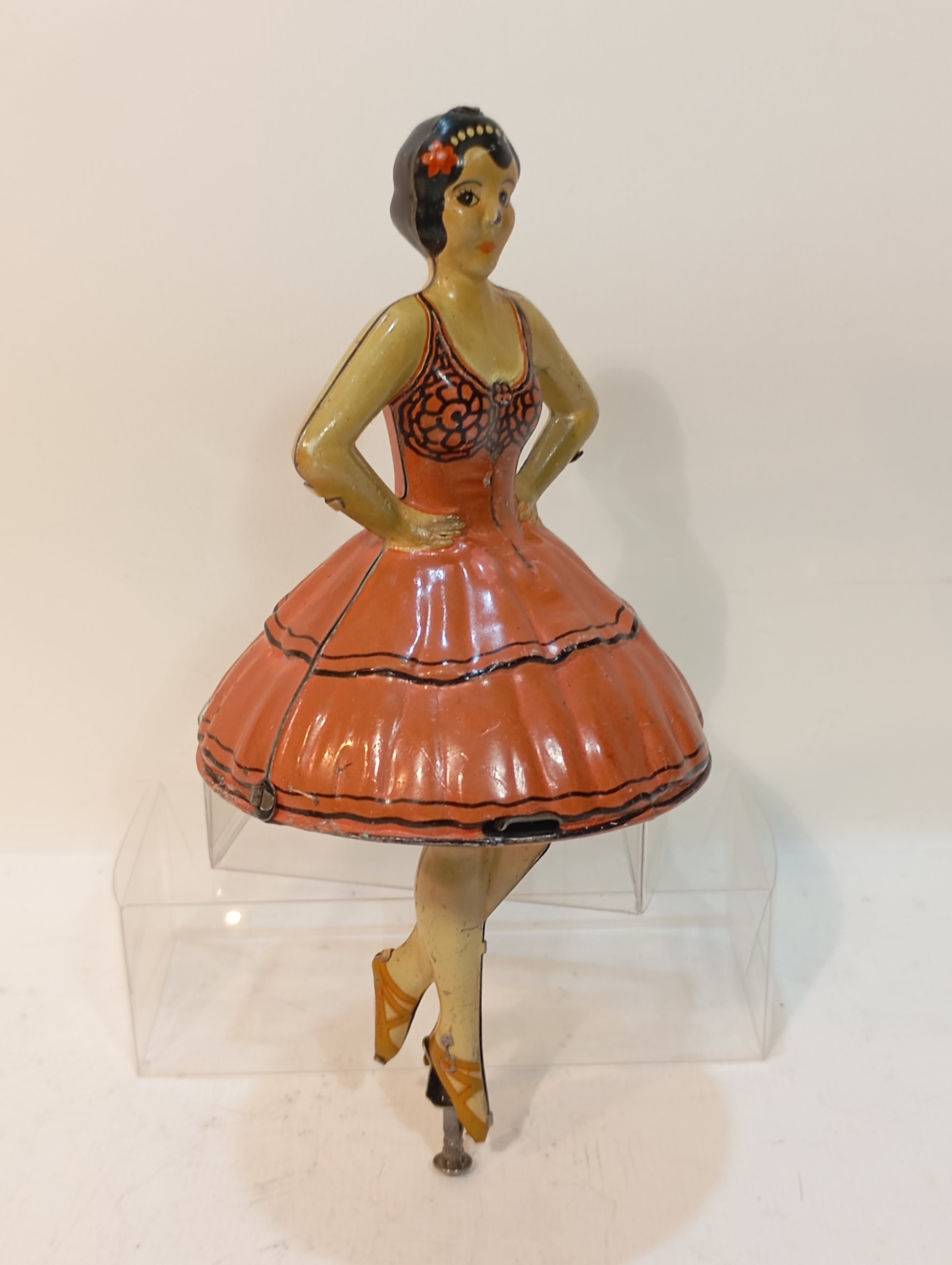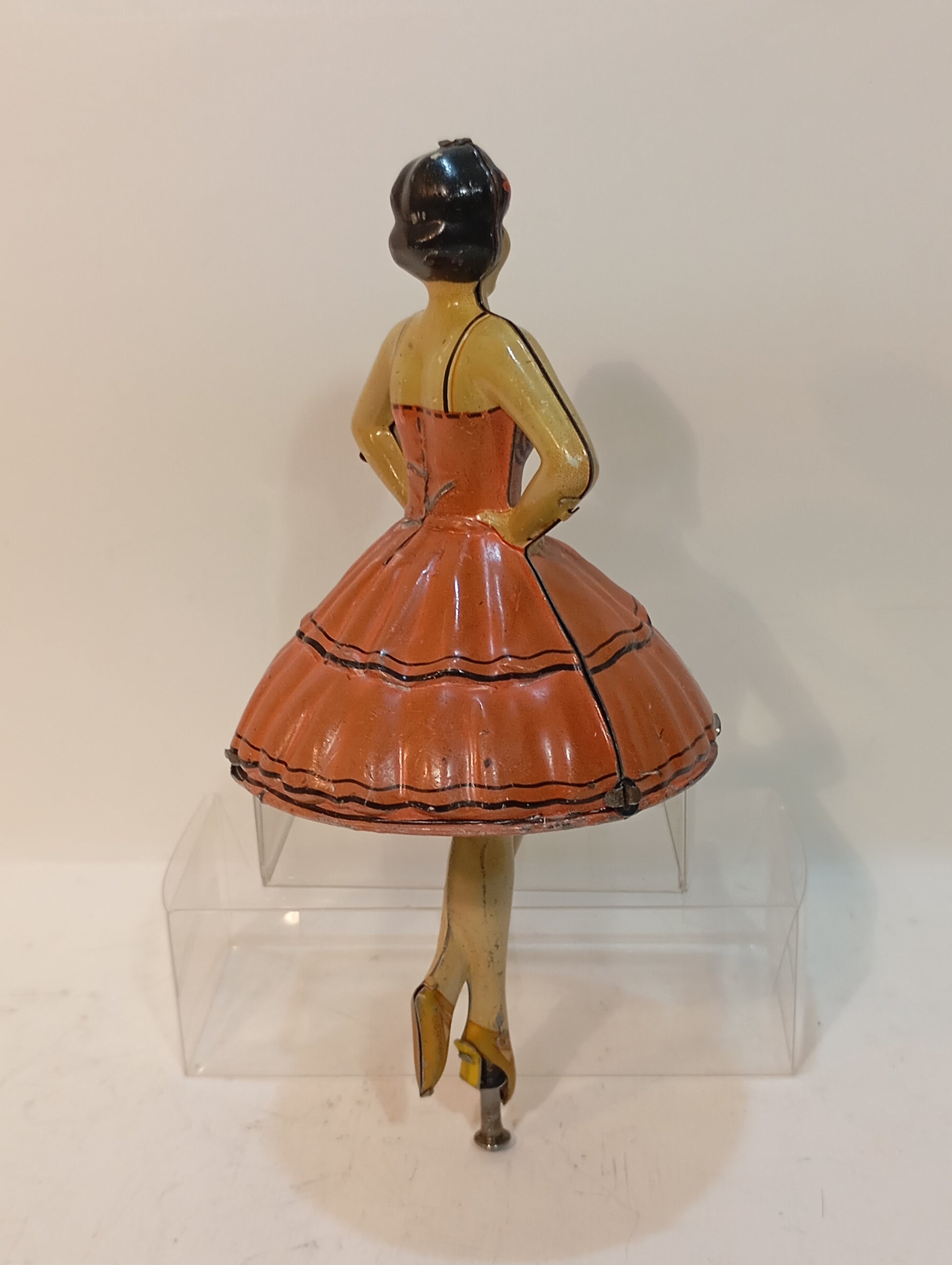 Außergewöhnlich seltene Tanzfigur mit Antriebsstange, sorgfältig im Originalkarton aufbewahrt. Es handelt sich um eine sogenannte Ballerina-Tänzerin aus der Zeit um 1920, mit einer Höhe von 15 cm. Der Antrieb funktioniert einwandfrei. Das Stück befindet sich in einem sehr schönen, originalen und fein lithographierten Zustand.