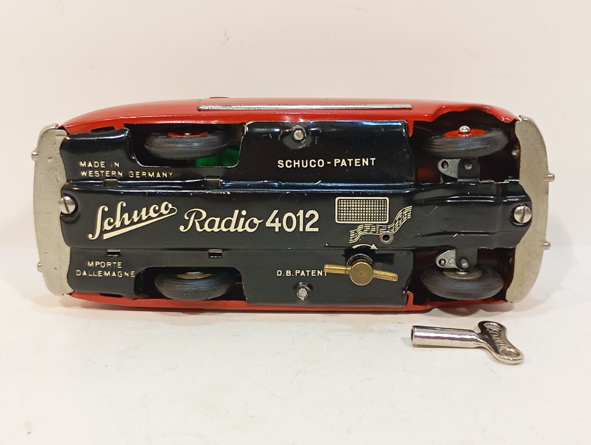 Wundervoller Originalzustand, inklusive Originalkarton und passendem Originalschlüssel. Das Uhrwerk läuft einwandfrei, ebenso das Musikwerk. Aus den 1960er Jahren stammend, präsentiert sich der Originalkarton in hervorragendem Zustand. Das Fahrzeug misst 16 cm und besitzt eine außergewöhnliche Besonderheit, die mir bislang noch nie begegnet ist: Der Aufziehschlüssel des Musikwerks lässt sich aufziehen und anschließend abnehmen. Dies deutet auf eine besonders frühe und rare Version hin.