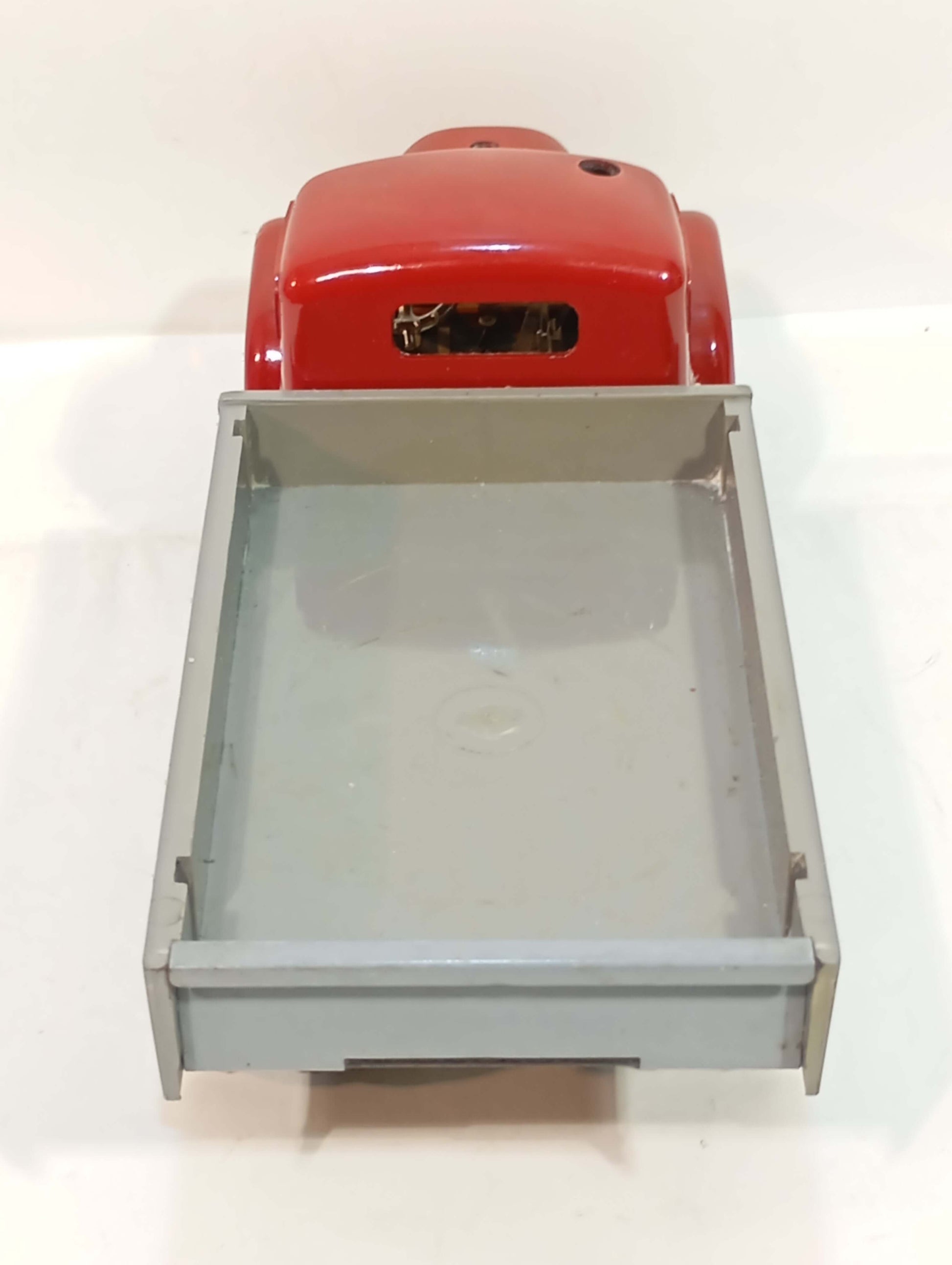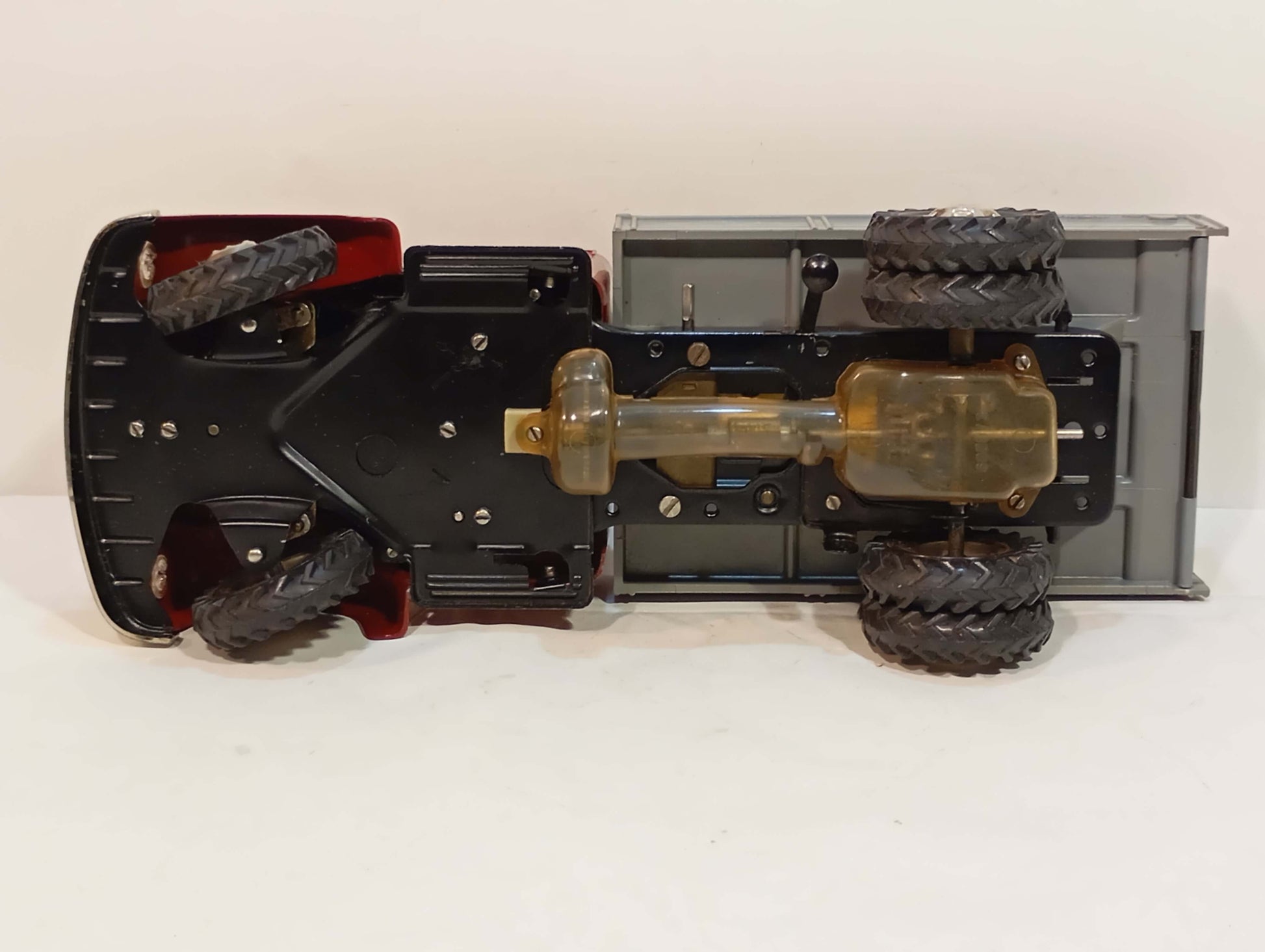 With its original box, complete accessories, and the radiator alignment arrow still in its original packaging, this model presents itself as the last version of the Schuco Constructions truck. It is characterized by two special features: the elegant dark red paintwork and the sheet metal/chrome rims. The original workshop loading, which was only included for a short time in 1965, is an exceptional rarity. The electric drive works perfectly. With a length of 27 cm and an almost flawless condition (the original box only shows minimal stains), this piece is hard to beat.