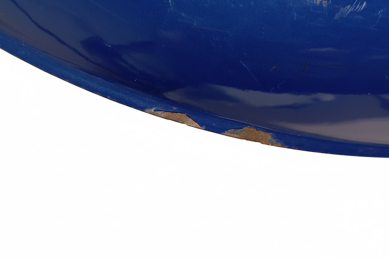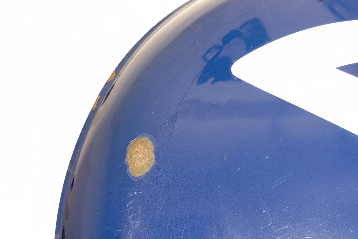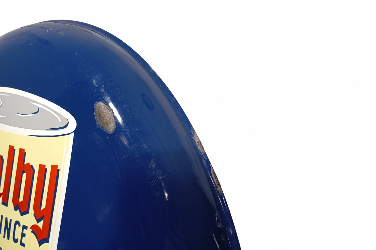 Emailschild, gewölbt mit markantem, dickbauchigem Profil, schablonierte Gestaltung, um 1950, Durchmesser 90 cm. Rückseitig befinden sich vier große Montageösen, von denen zwei ausgebrochen sind; die Befestigung ist dennoch problemlos möglich. Das Schild besitzt eine Ausstrahlung, die an Pop Art erinnert, und ist besonders in dieser Größe ein beeindruckender Blickfang.