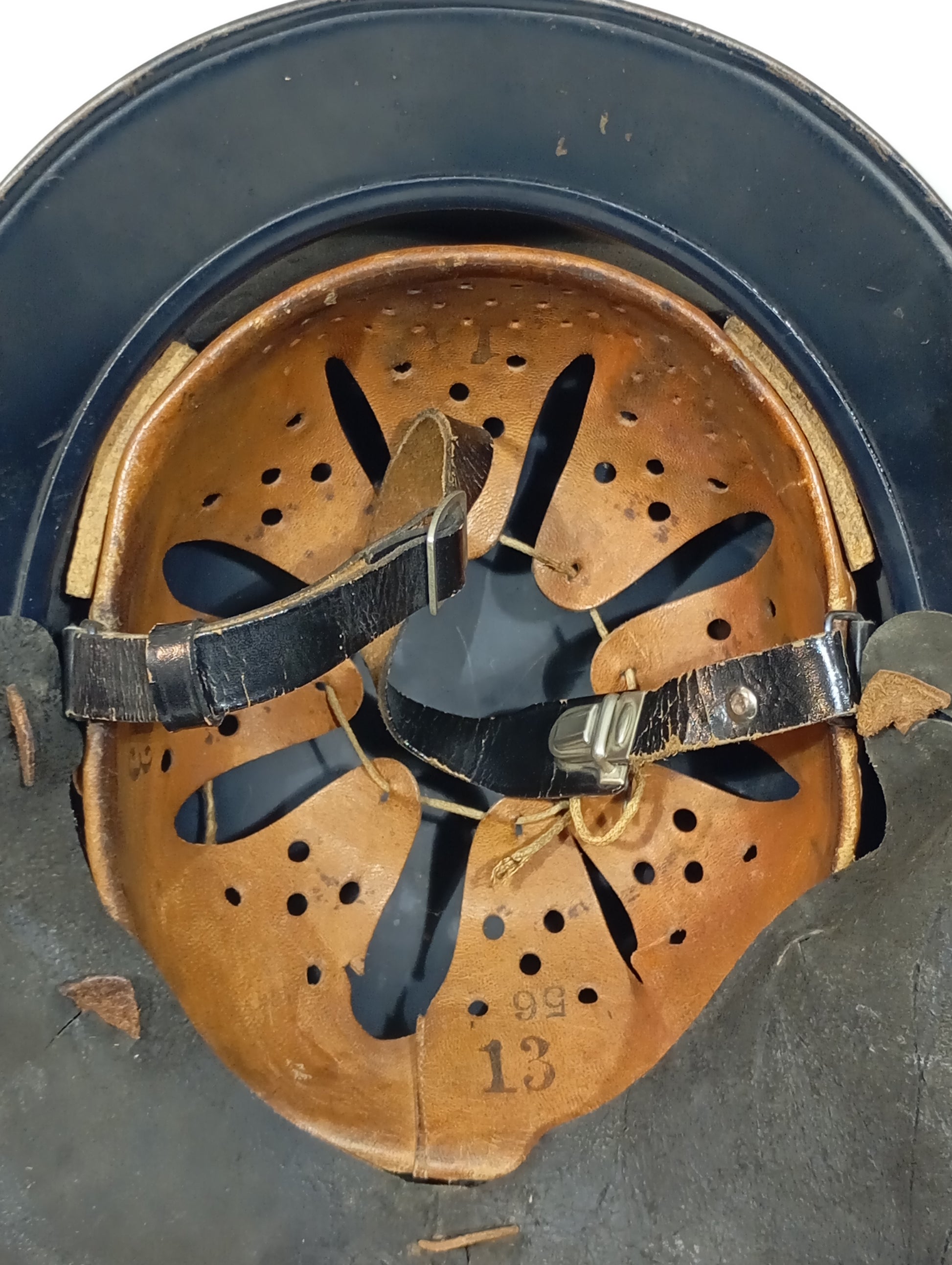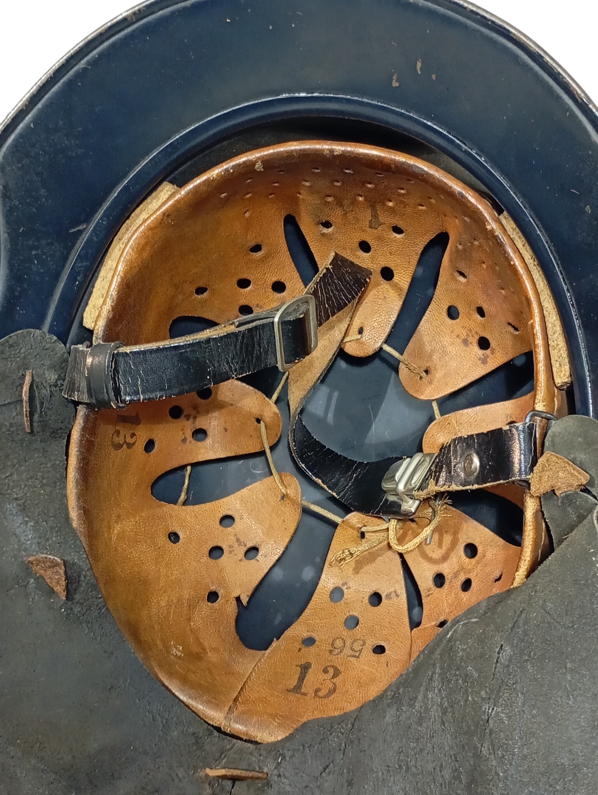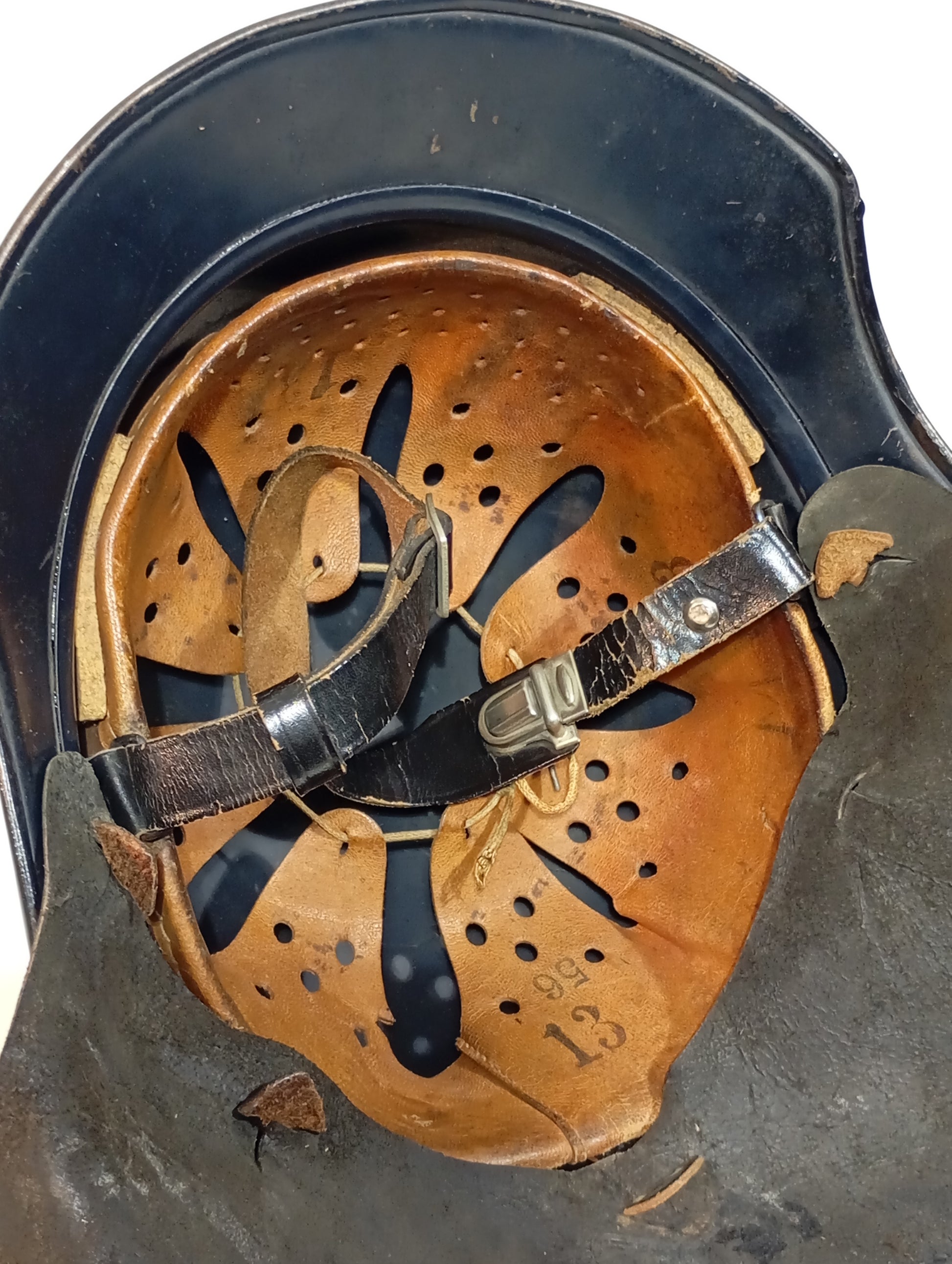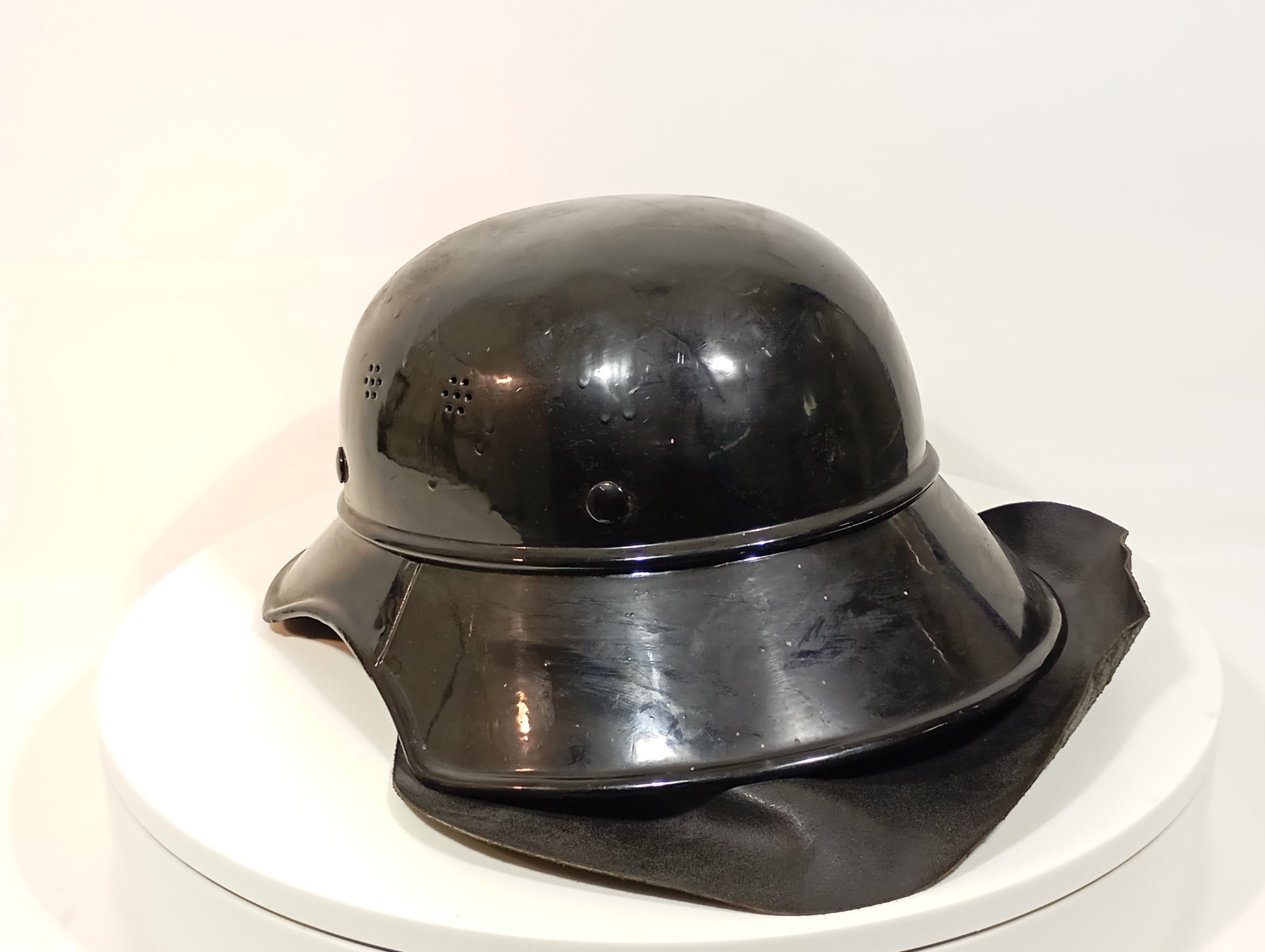 Dieser originale Steiff Stahlhelm der Werksfeuerwehr aus den 1930er Jahren wurde in Deutschland gefertigt und präsentiert sich in klassischem Schwarz mit normalen Alters- und Gebrauchsspuren. Die Abkürzung RL 2-39/11 verweist auf einen deutschen Luftschutz-Stahlhelm aus der Zeit des Zweiten Weltkriegs, der von der Firma Bath & Wagara in Dresden hergestellt wurde und eine entsprechende Herstellerkennzeichnung trägt. Es handelt sich um einen originalen Helm der ehemaligen Werksfeuerwehr (Werksluftschutz) von Steiff. Das Innenleben ist original erhalten, während die Außenseite vermutlich nachträglich von Steiff übermalt wurde, um Hoheitszeichen zu überdecken, was gegen Ende des Zweiten Weltkriegs üblich war. Der Innendurchmesser beträgt 15,5 cm.