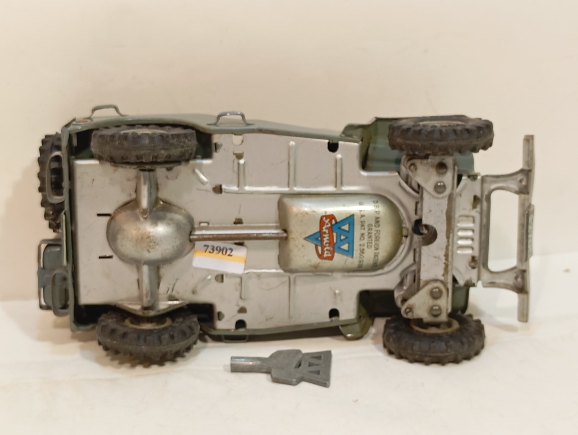 Extrem seltene, graue Zivilversion aus den 1950er-Jahren, inklusive Originalkarton. Das Uhrwerk ist voll funktionsfähig, mit originalem Arnold-Schlüssel und Fahrerfigur. Das Modell verfügt über ausklappbare Spiegel und befindet sich in einem sehr schönen, nur minimal bespielten Originalzustand. Am Originalkarton fehlte ein Stück, das sorgfältig ergänzt wurde (auf den Fotos gut zu erkennen). Auch die seitlichen Laschen sowie eine innere Lasche wurden ergänzt. Länge: 17 cm.