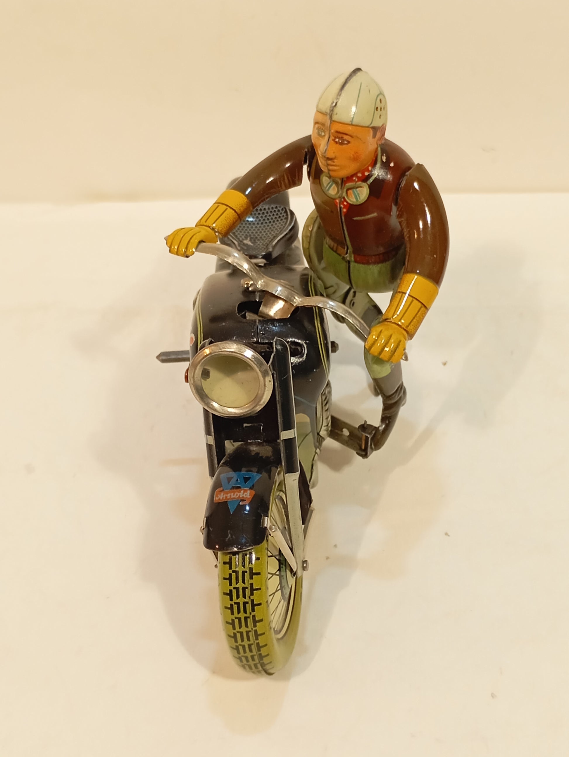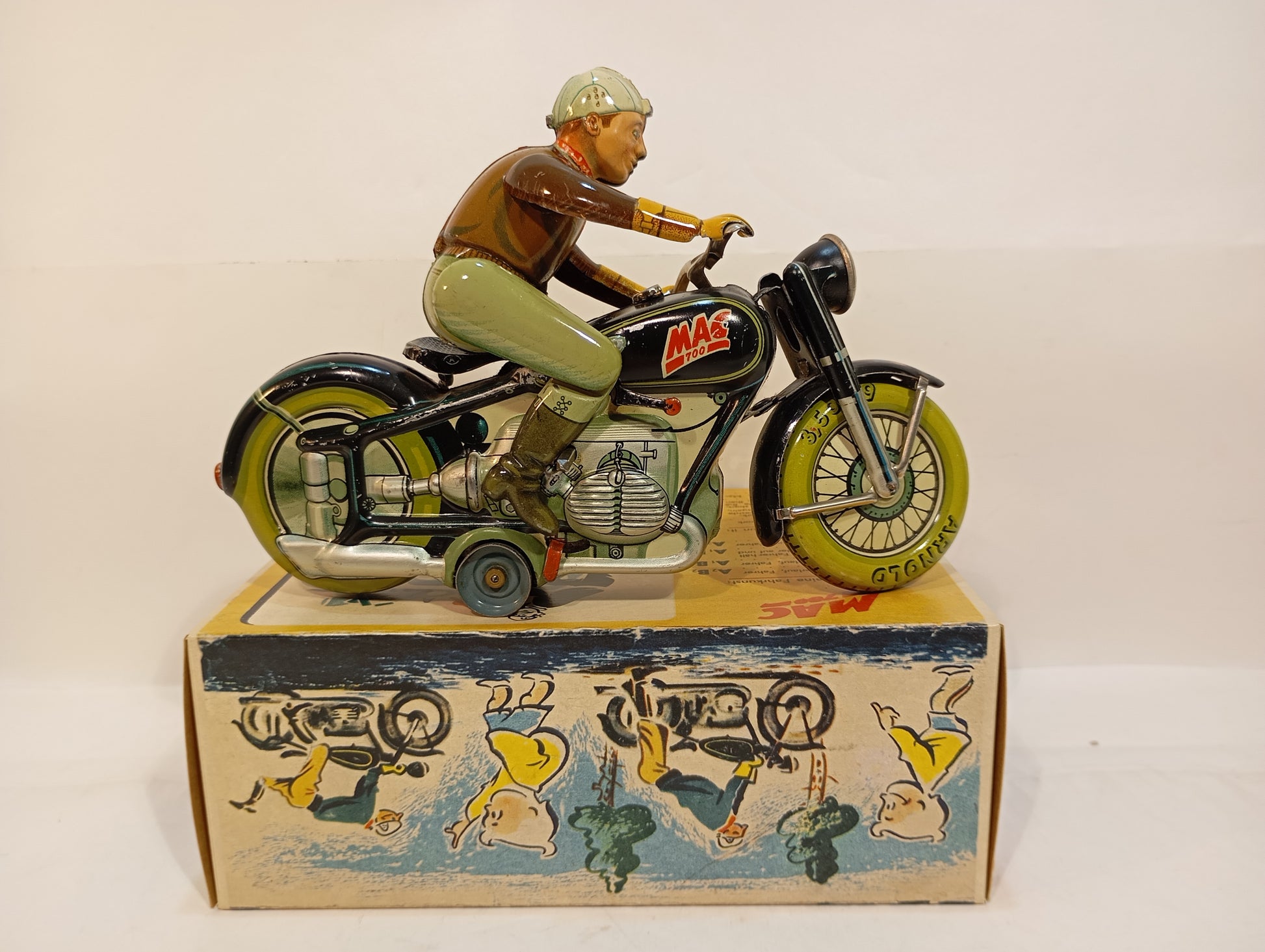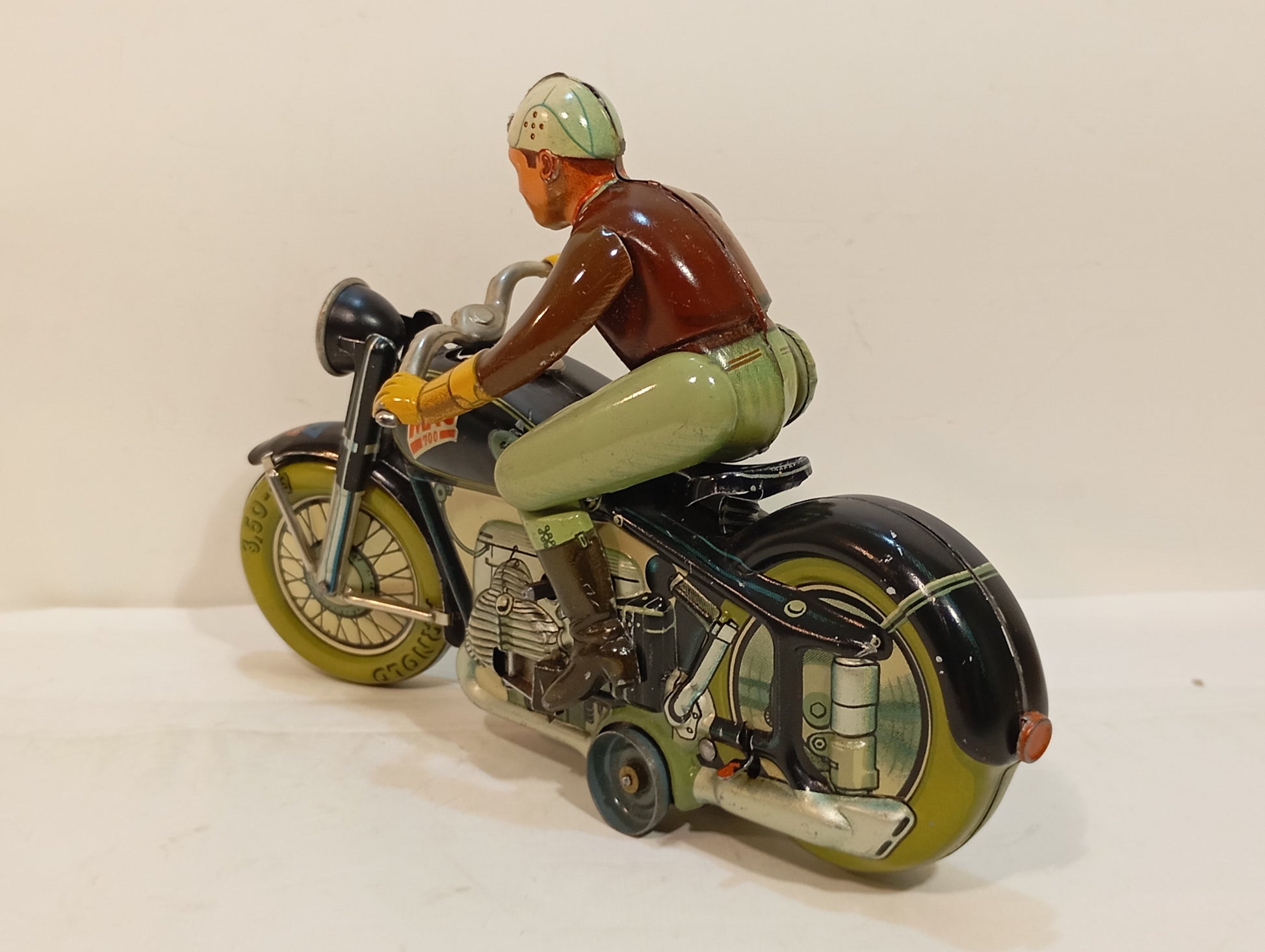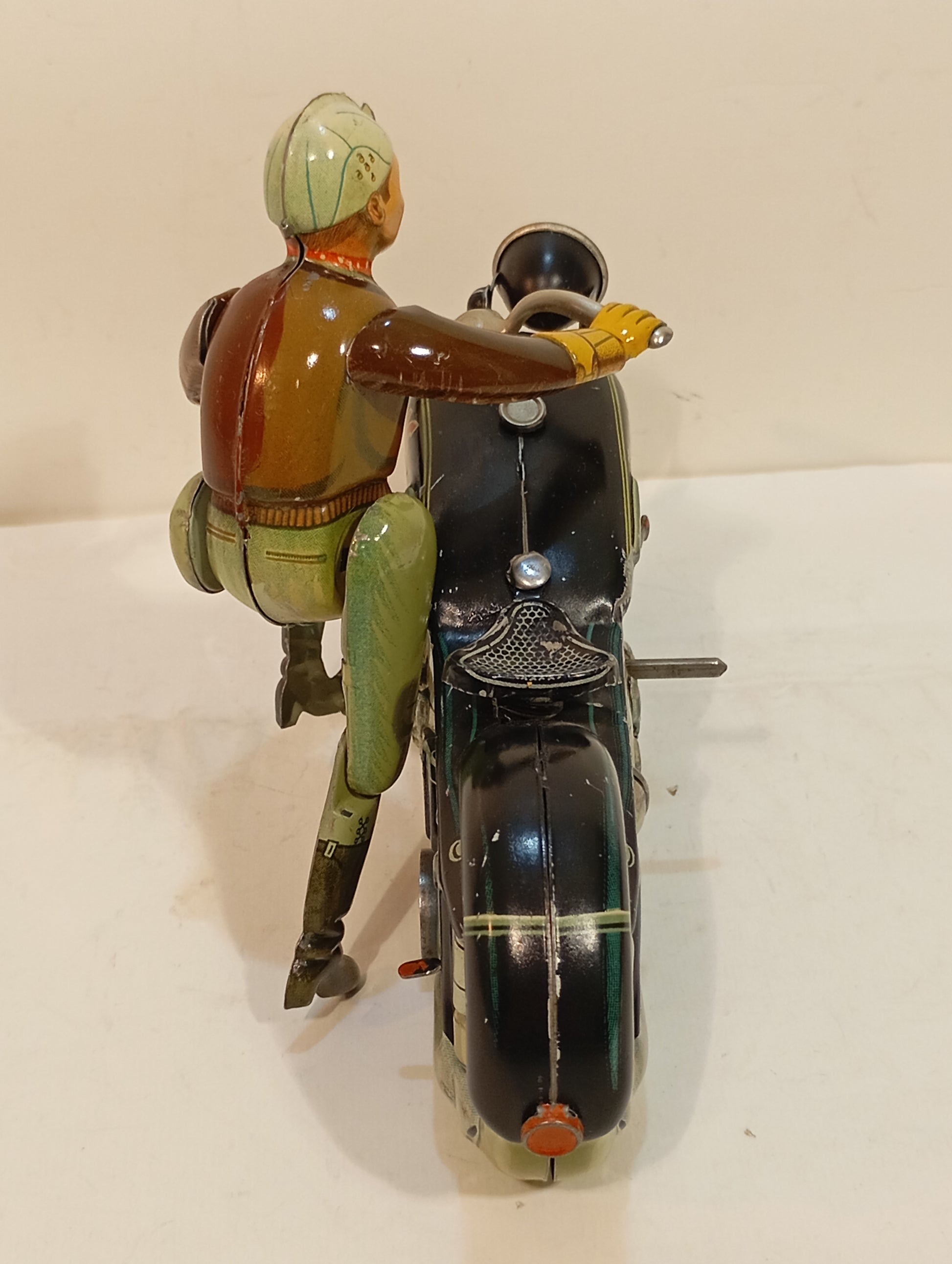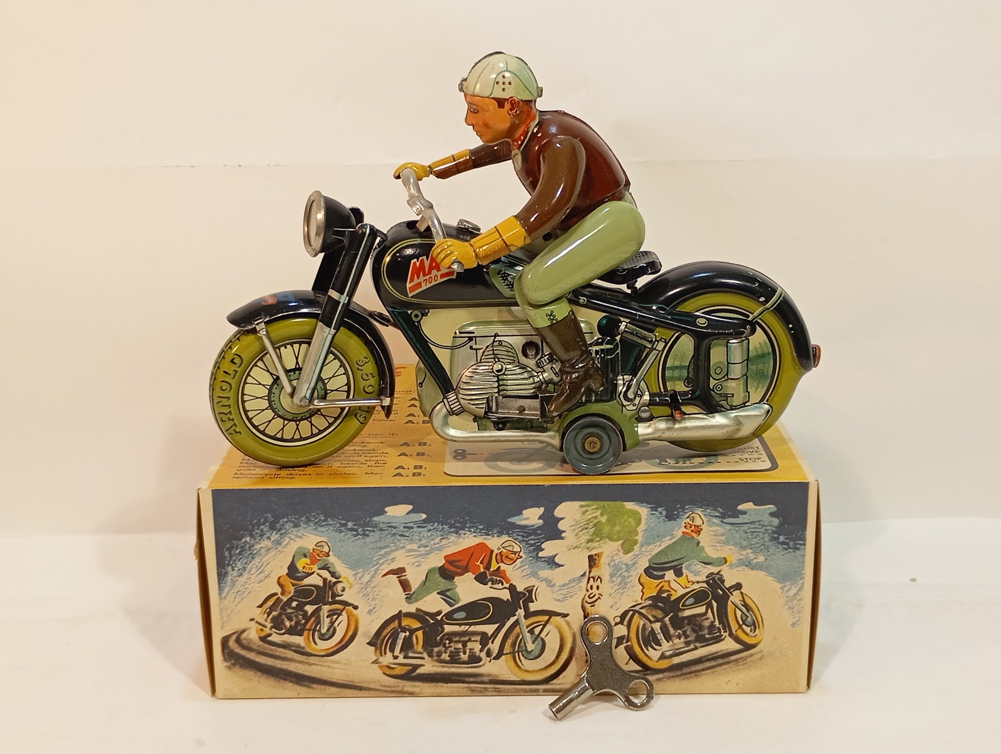 Sehr schöner Originalzustand mit lediglich minimalen Alters- und Gebrauchsspuren, hauptsächlich vom Auf- und Absteigen. Sämtliche Funktionen sind voll gegeben. Die Lithografie zeigt sich nahezu makellos, der Fahrer weist bis auf geringste Spielspuren keinerlei Mängel auf. Beiliegt: Replika-Schachtel mit Anleitung. Originaler Schlüssel vorhanden. Länge: 19 cm. Eines der beliebtesten Motorräder der 50er/60er Jahre.