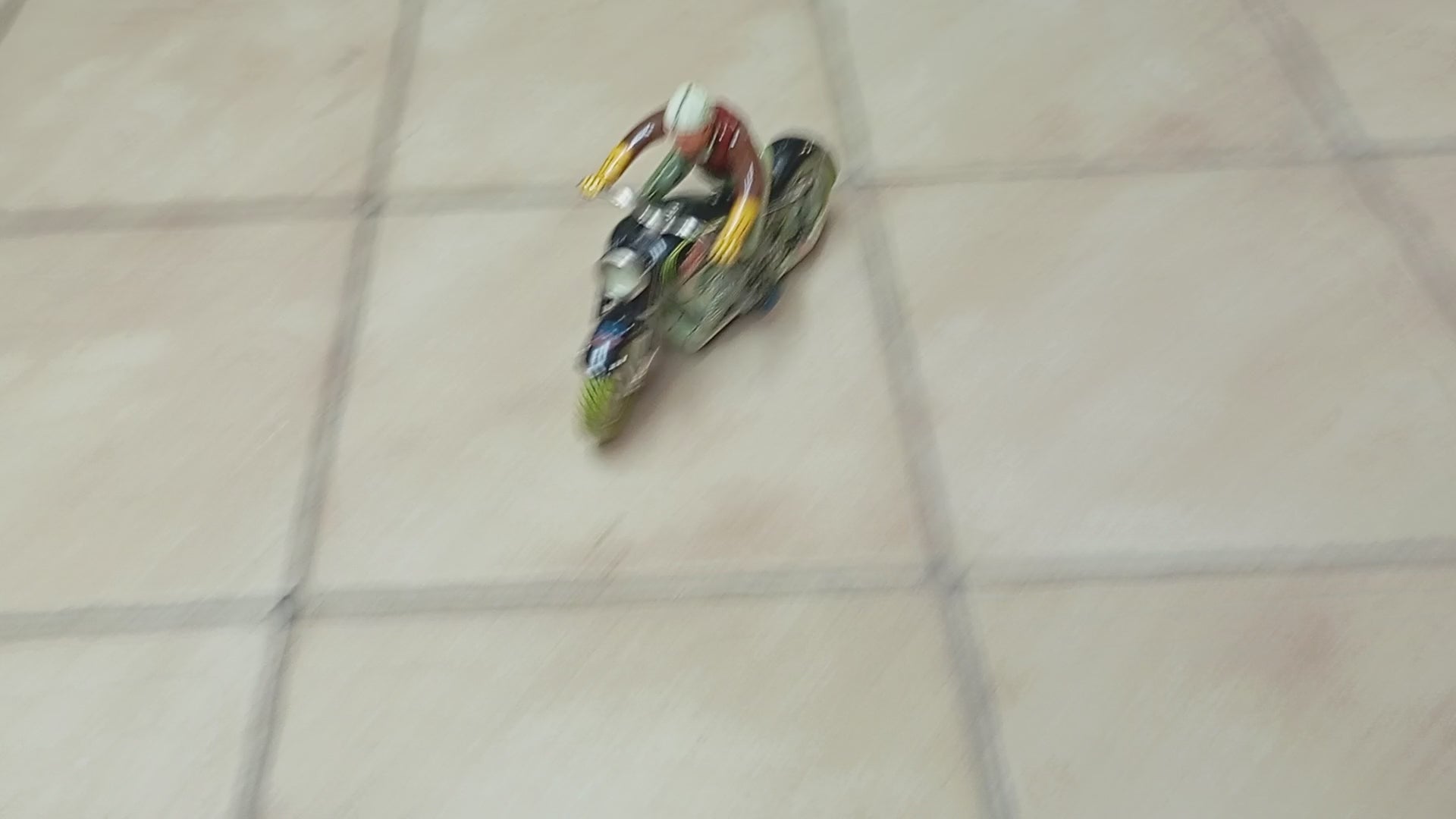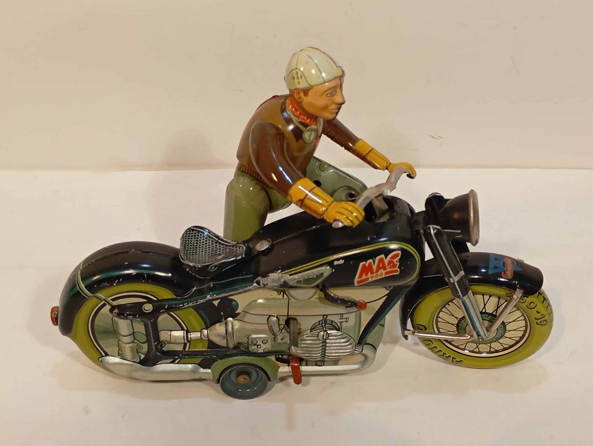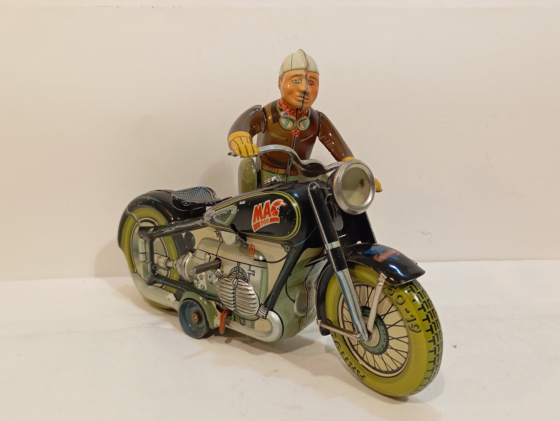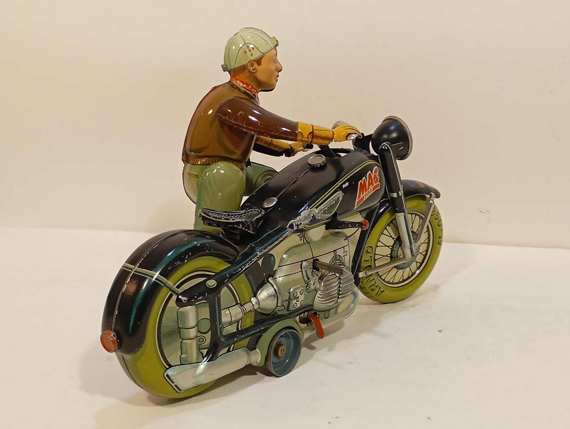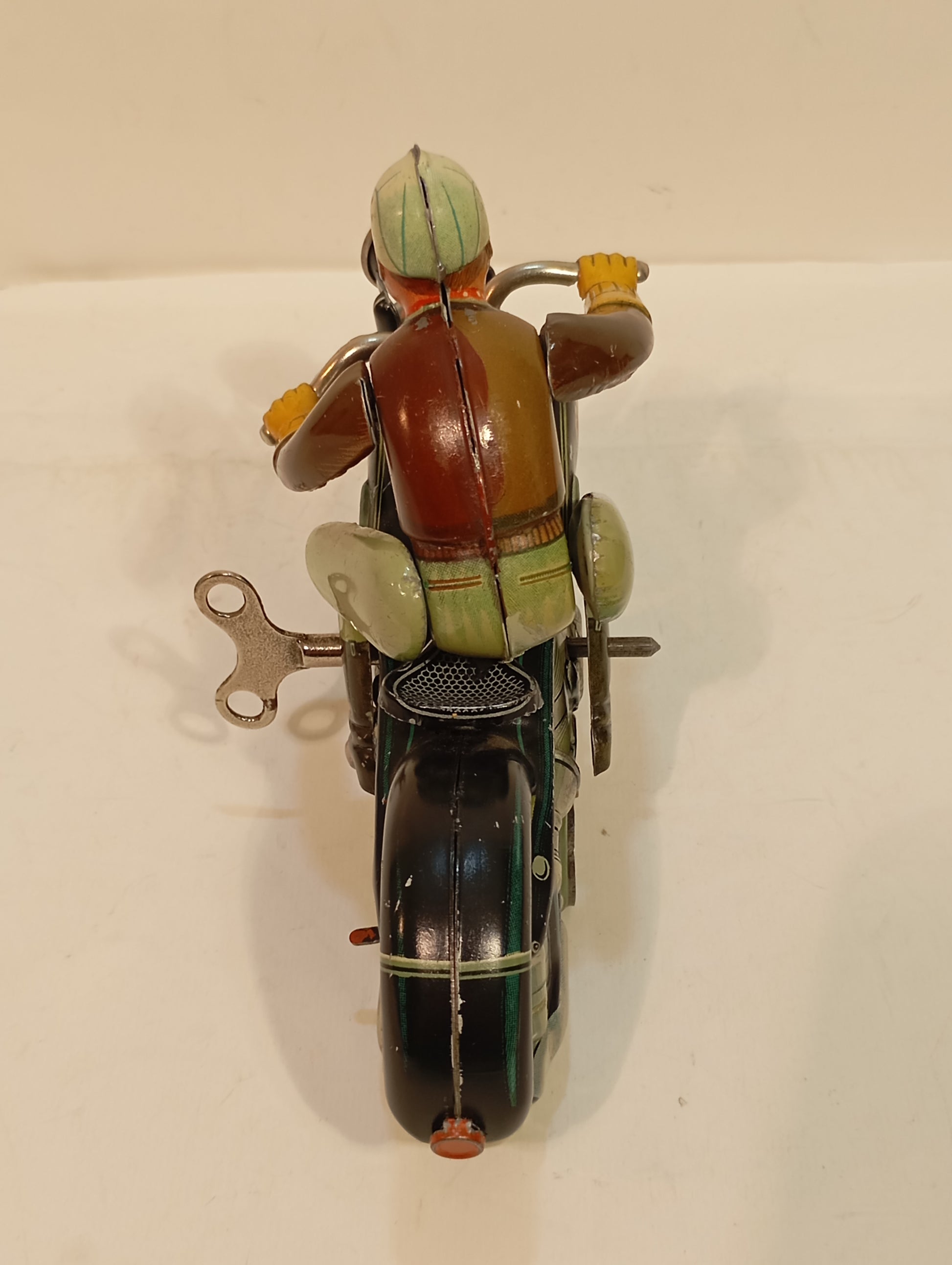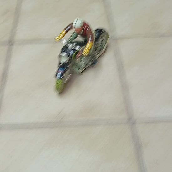 Sehr schöner Originalzustand mit lediglich minimalen Alters- und Gebrauchsspuren, hauptsächlich vom Auf- und Absteigen. Sämtliche Funktionen sind voll gegeben. Die Lithografie zeigt sich nahezu makellos, der Fahrer weist bis auf geringste Spielspuren keinerlei Mängel auf. Beiliegt: Replika-Schachtel mit Anleitung. Originaler Schlüssel vorhanden. Länge: 19 cm. Eines der beliebtesten Motorräder der 50er/60er Jahre.