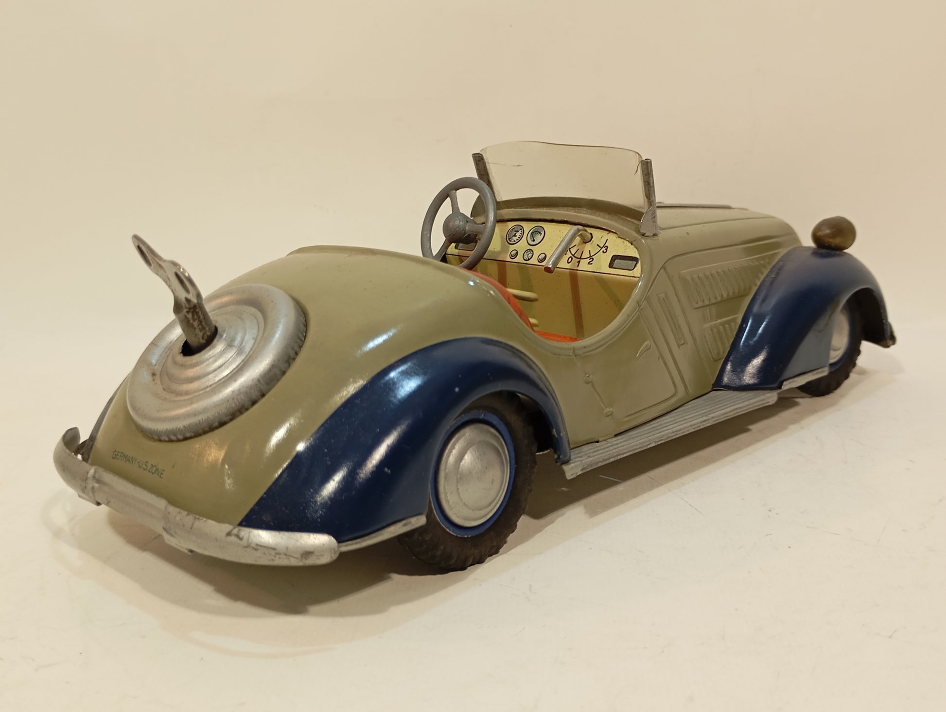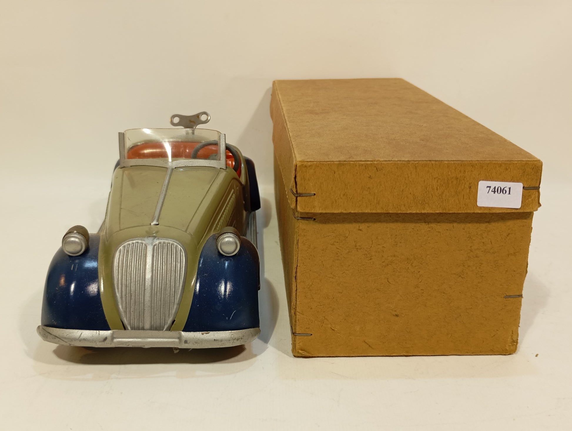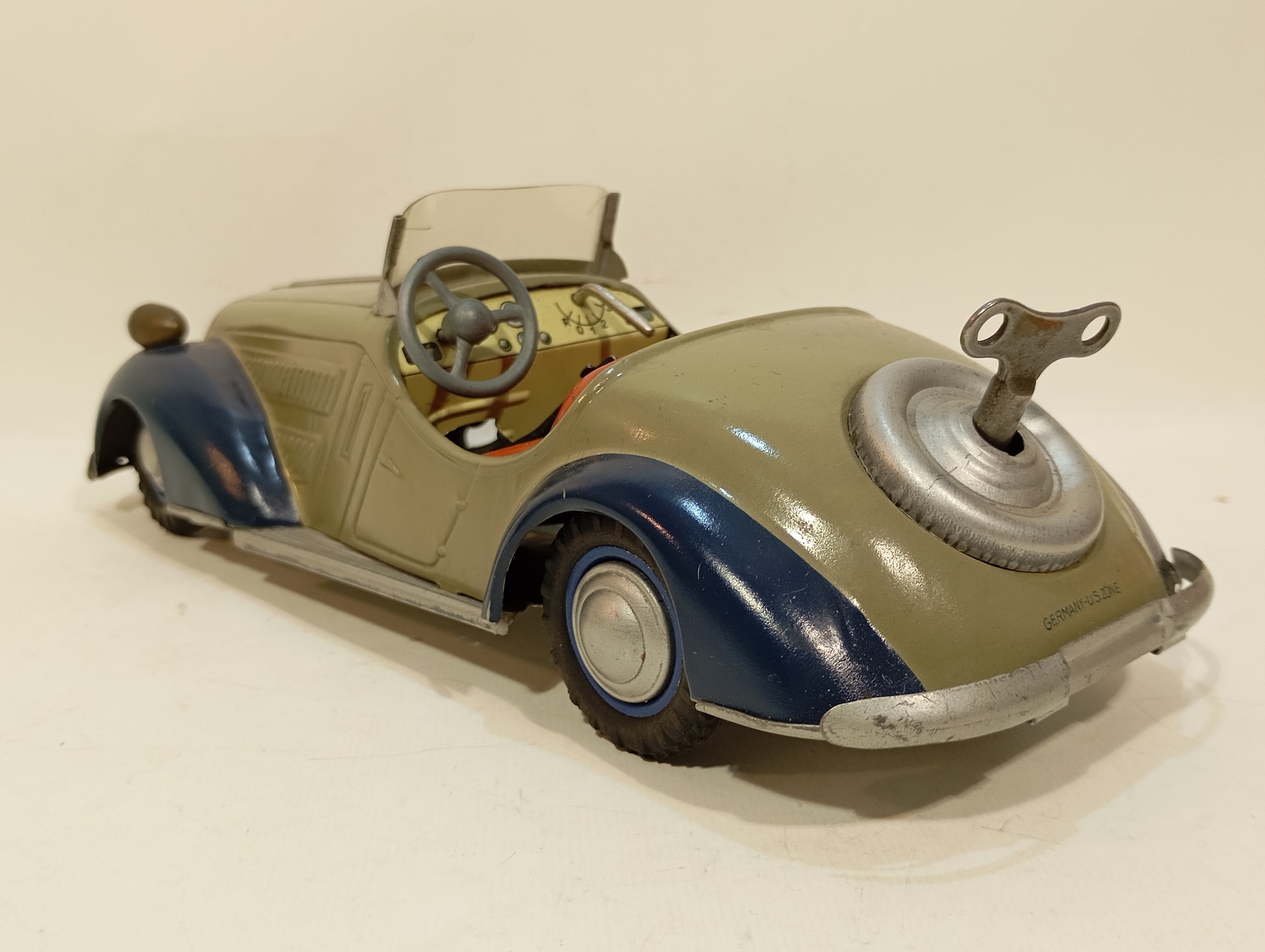 US-Zone-Ausführung, in graublau lithographiert. Nahezu neuwertiger Originalzustand, ausgestattet mit originalem Schlüssel und funktionierender Gangschaltung. Keine Spielspuren erkennbar. Die originale Celluloidscheibe weist lediglich einen minimalen Einriss auf. Geliefert in einer neutralen Schachtel, wie sie in den frühen 1950er-Jahren üblich war. Länge: 25 cm. Uhrwerk voll funktionsfähig.