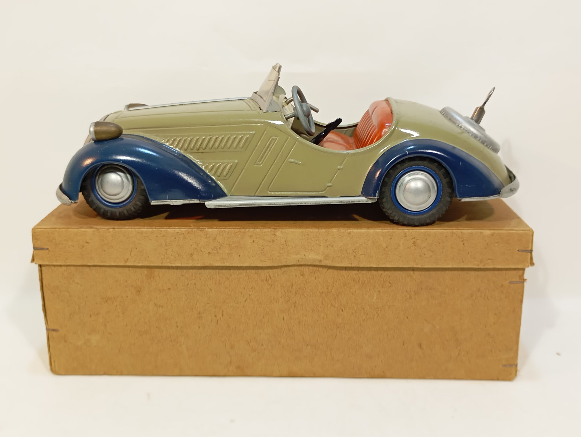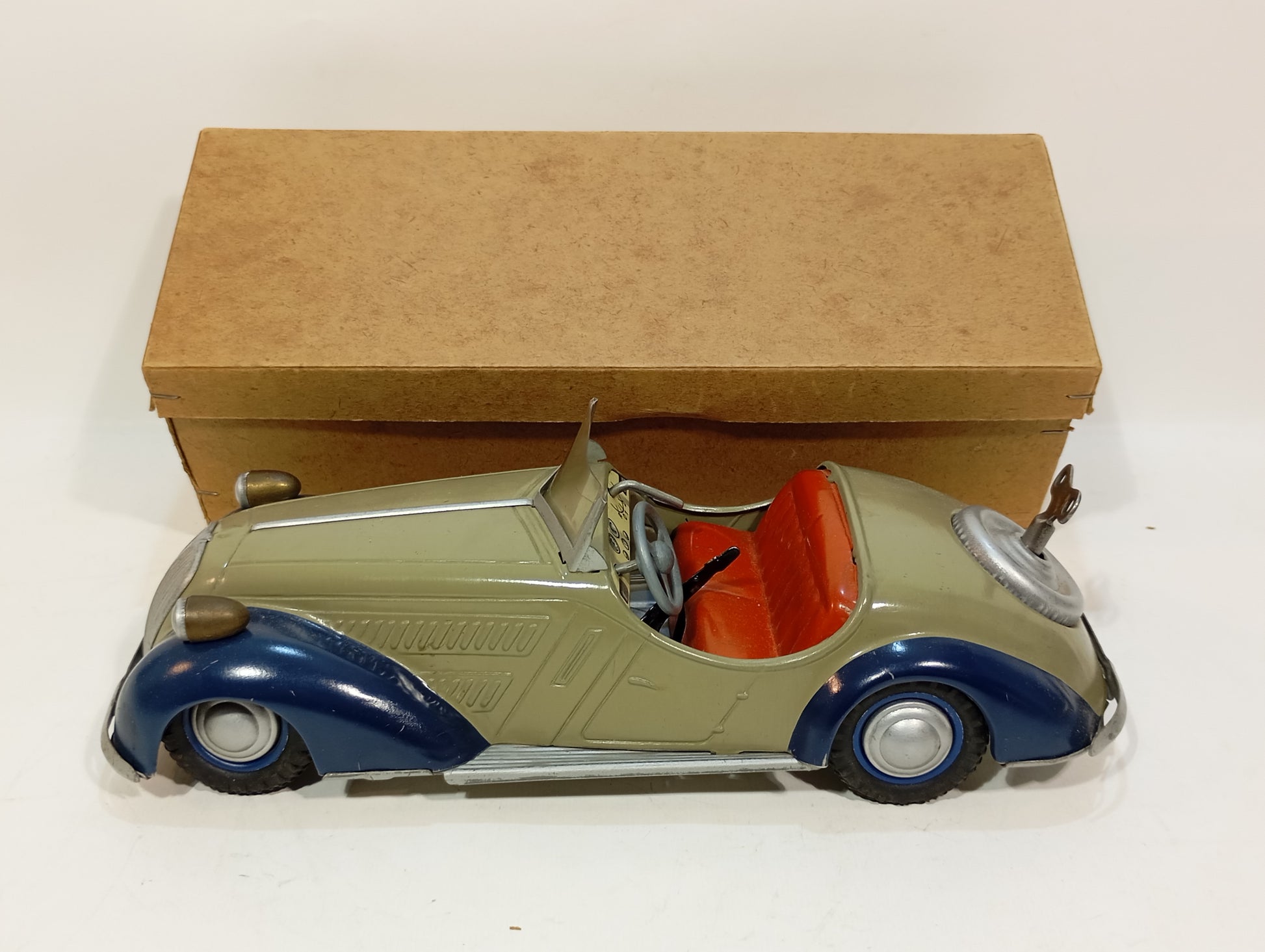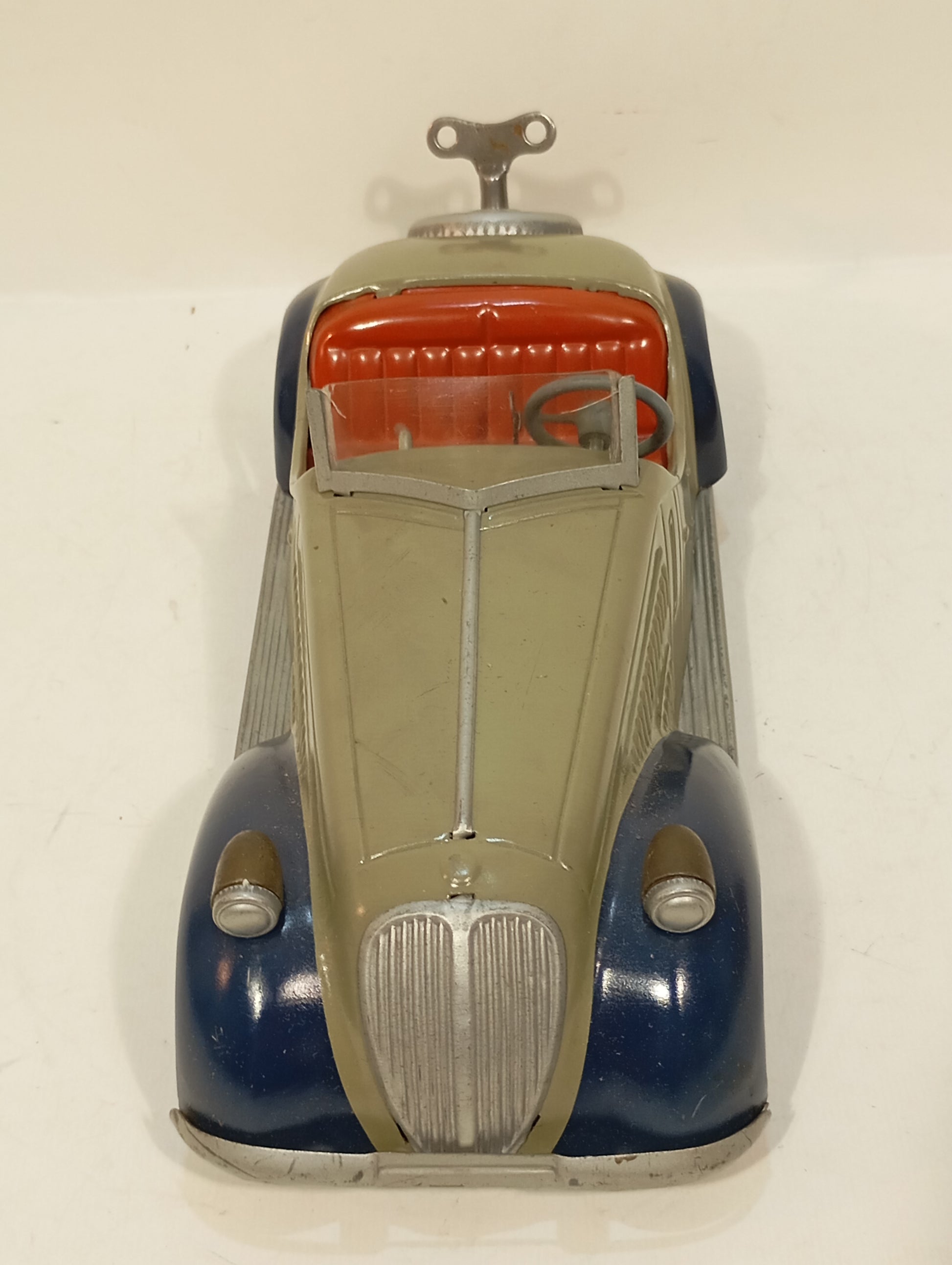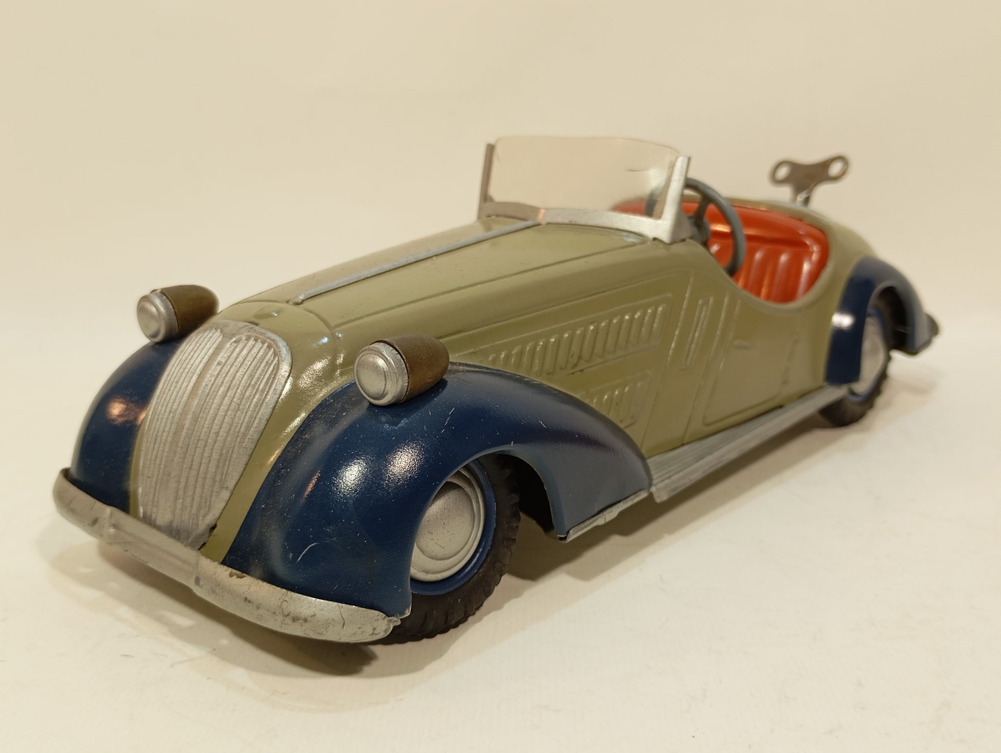 US-Zone-Ausführung, in graublau lithographiert. Nahezu neuwertiger Originalzustand, ausgestattet mit originalem Schlüssel und funktionierender Gangschaltung. Keine Spielspuren erkennbar. Die originale Celluloidscheibe weist lediglich einen minimalen Einriss auf. Geliefert in einer neutralen Schachtel, wie sie in den frühen 1950er-Jahren üblich war. Länge: 25 cm. Uhrwerk voll funktionsfähig.