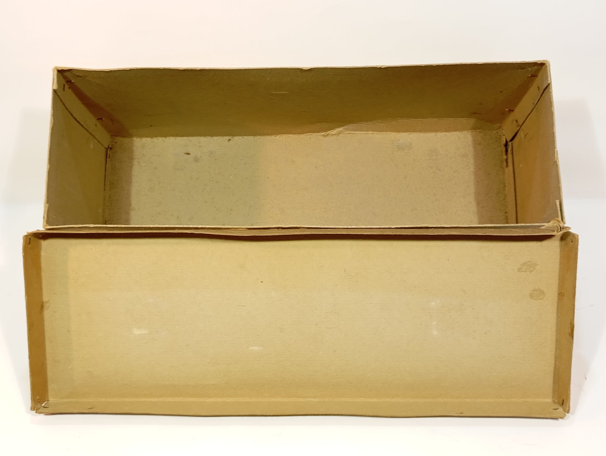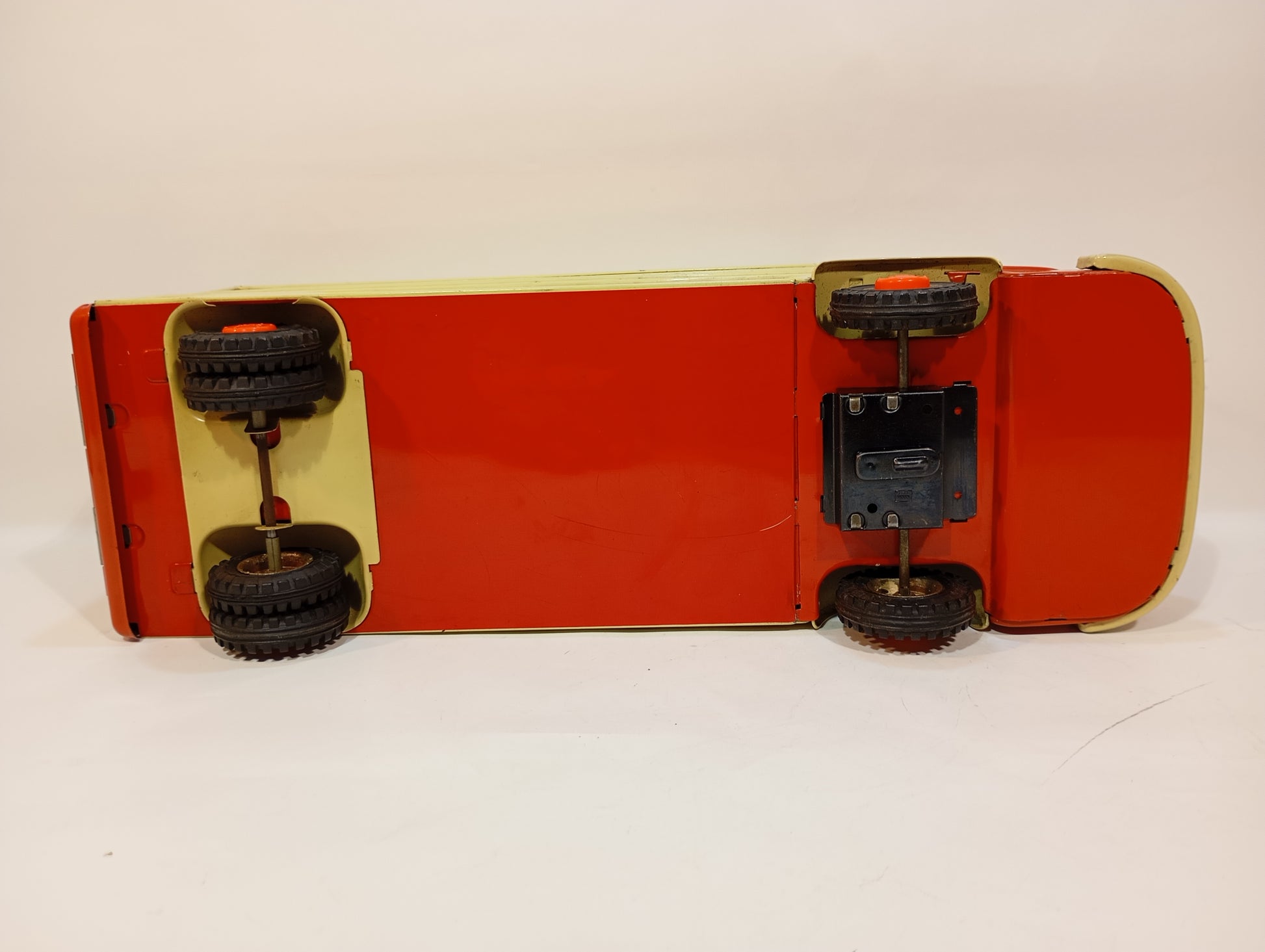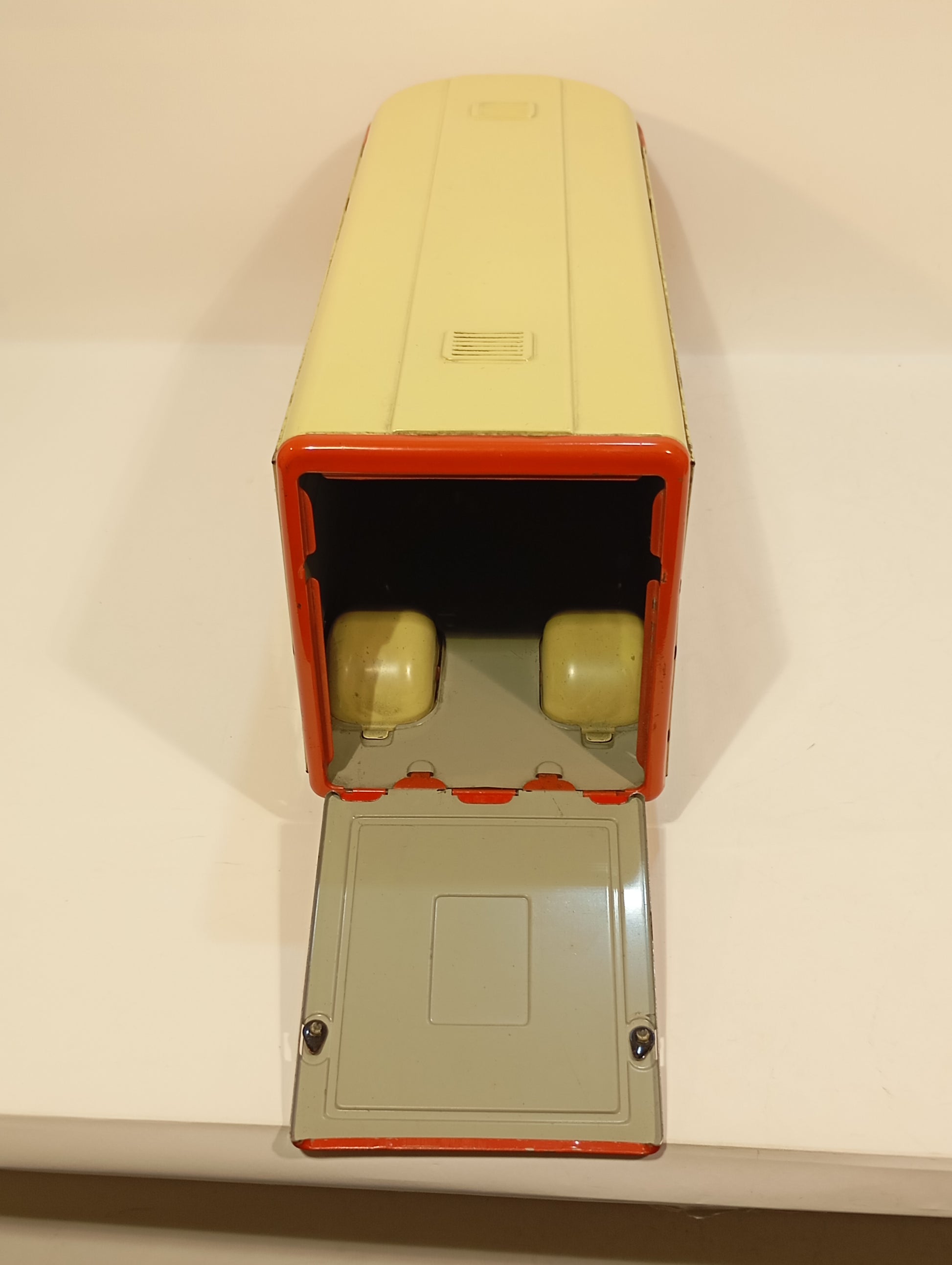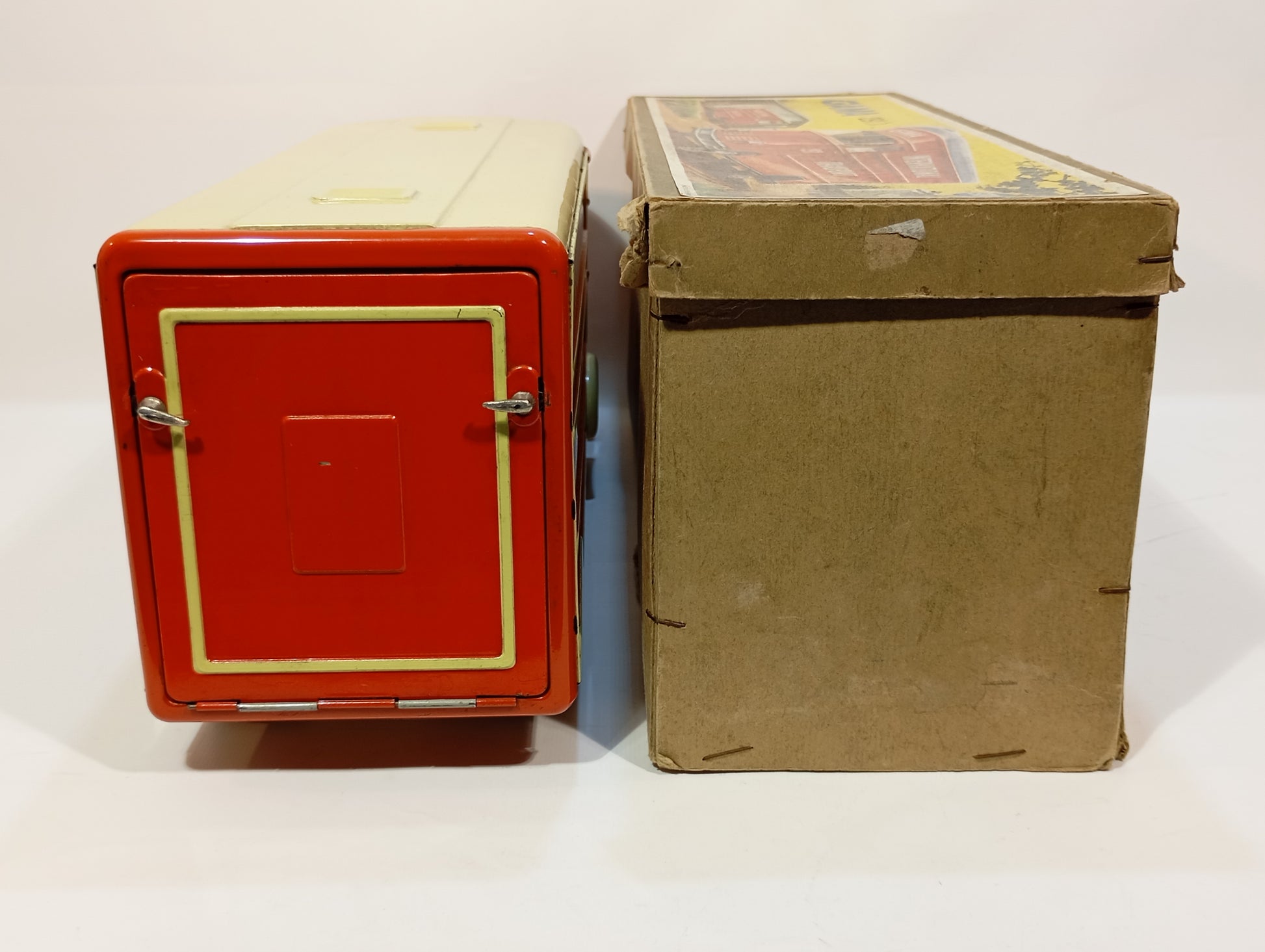 Heckklappe zum Öffnen, im nahezu neuwertigen Originalzustand. Das Schwungrad ist voll funktionsfähig. Aus den späten 50er Jahren, begleitet von einem wunderschönen Originalkarton mit detailreichem Deckelbild. Länge: 36 cm.