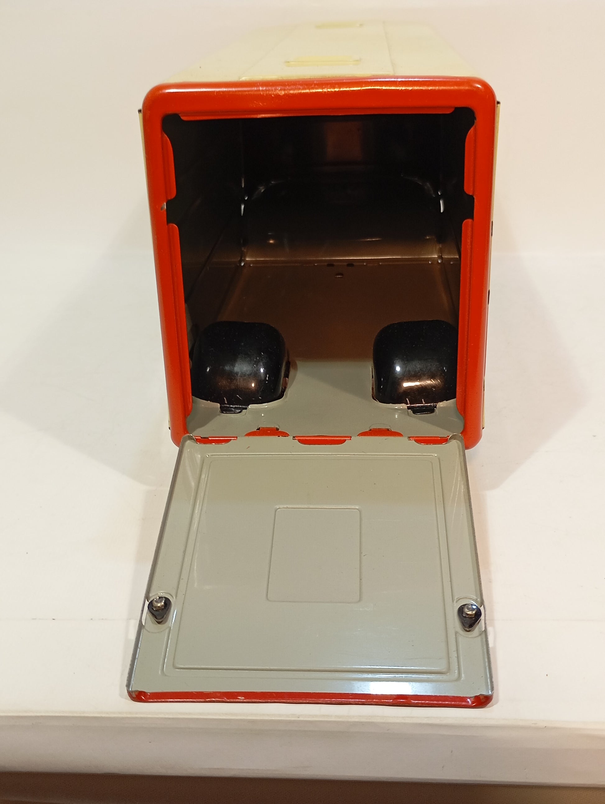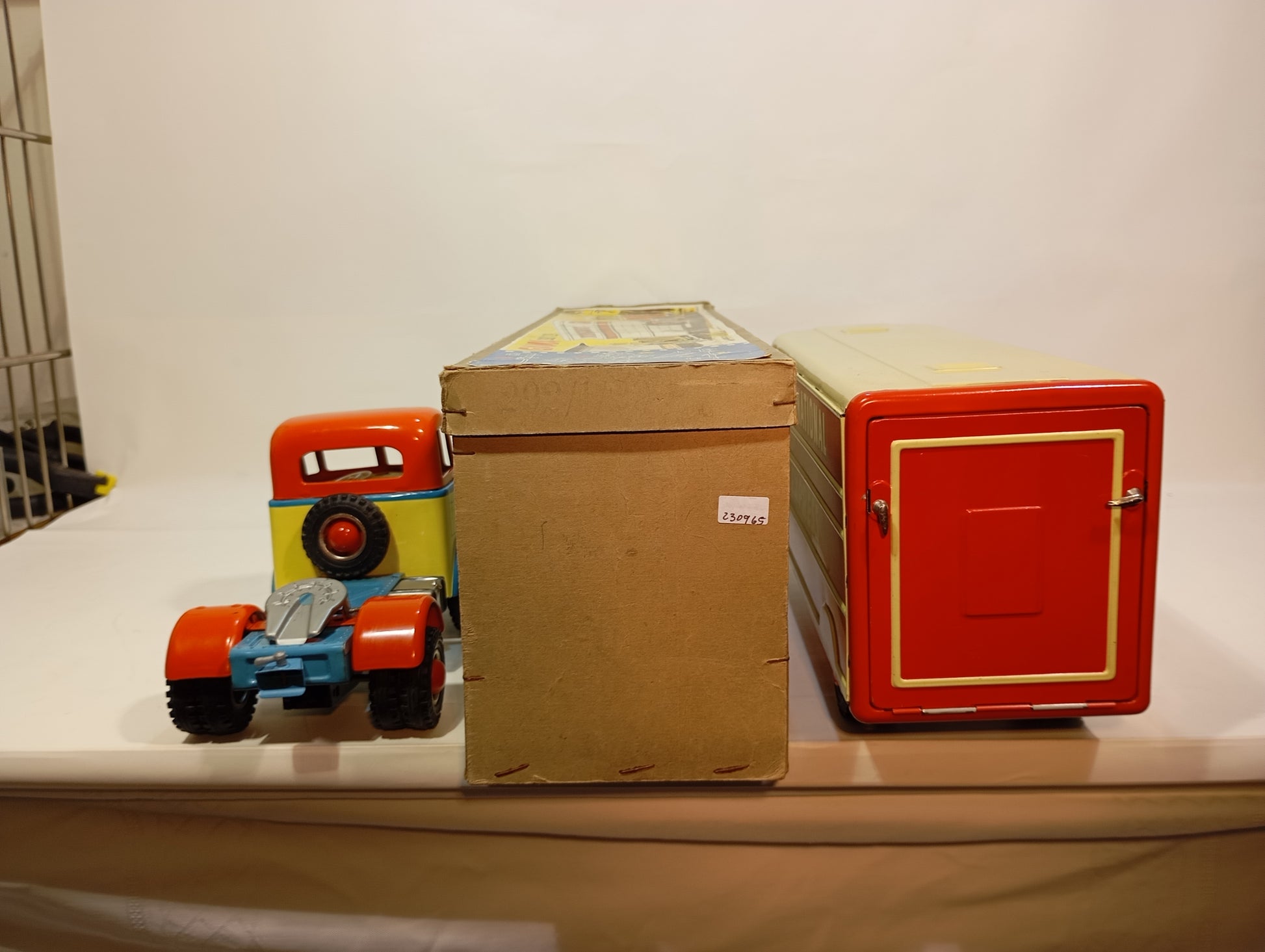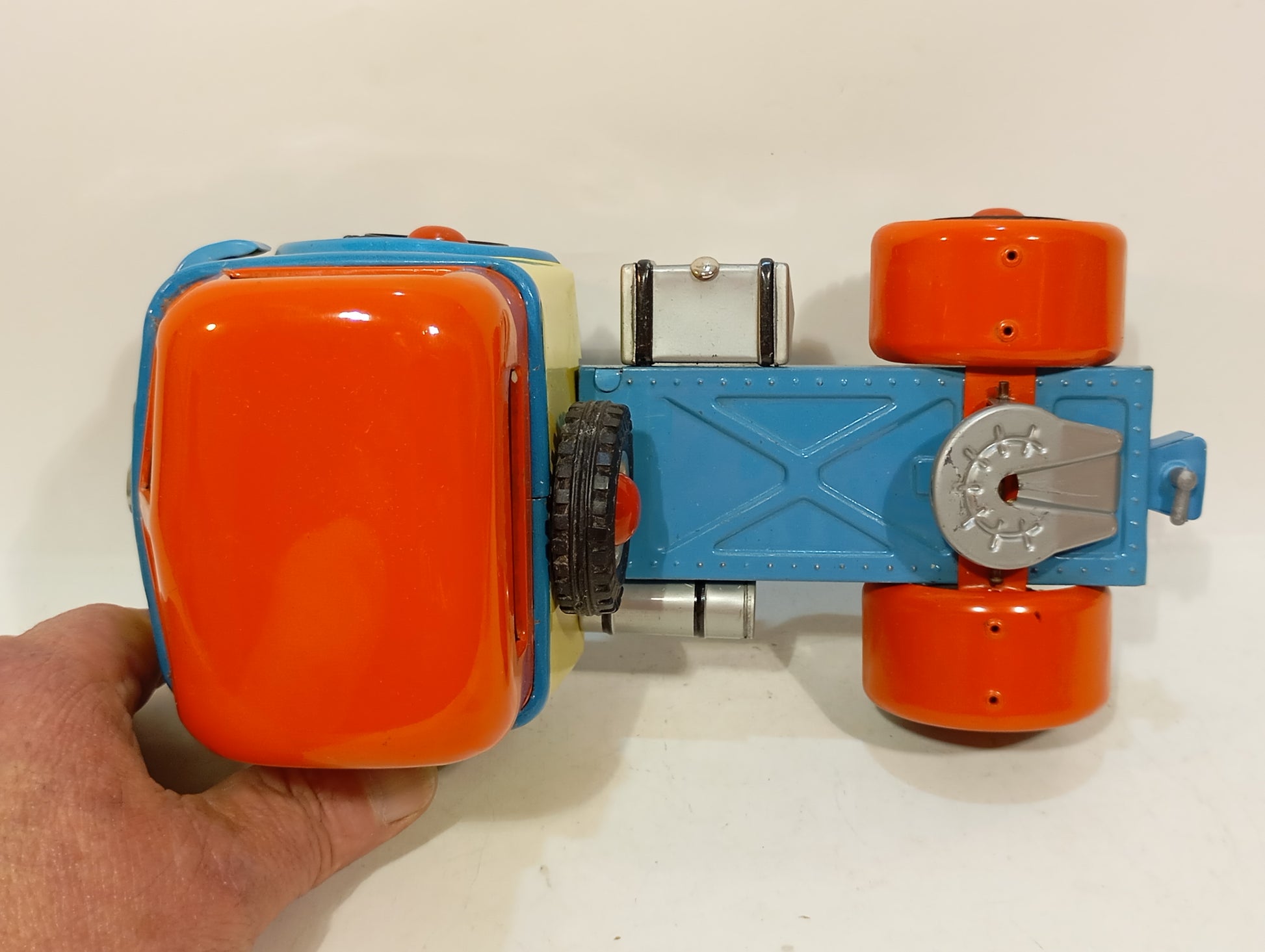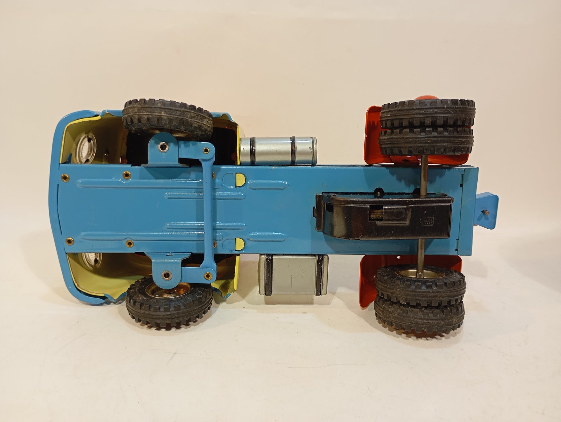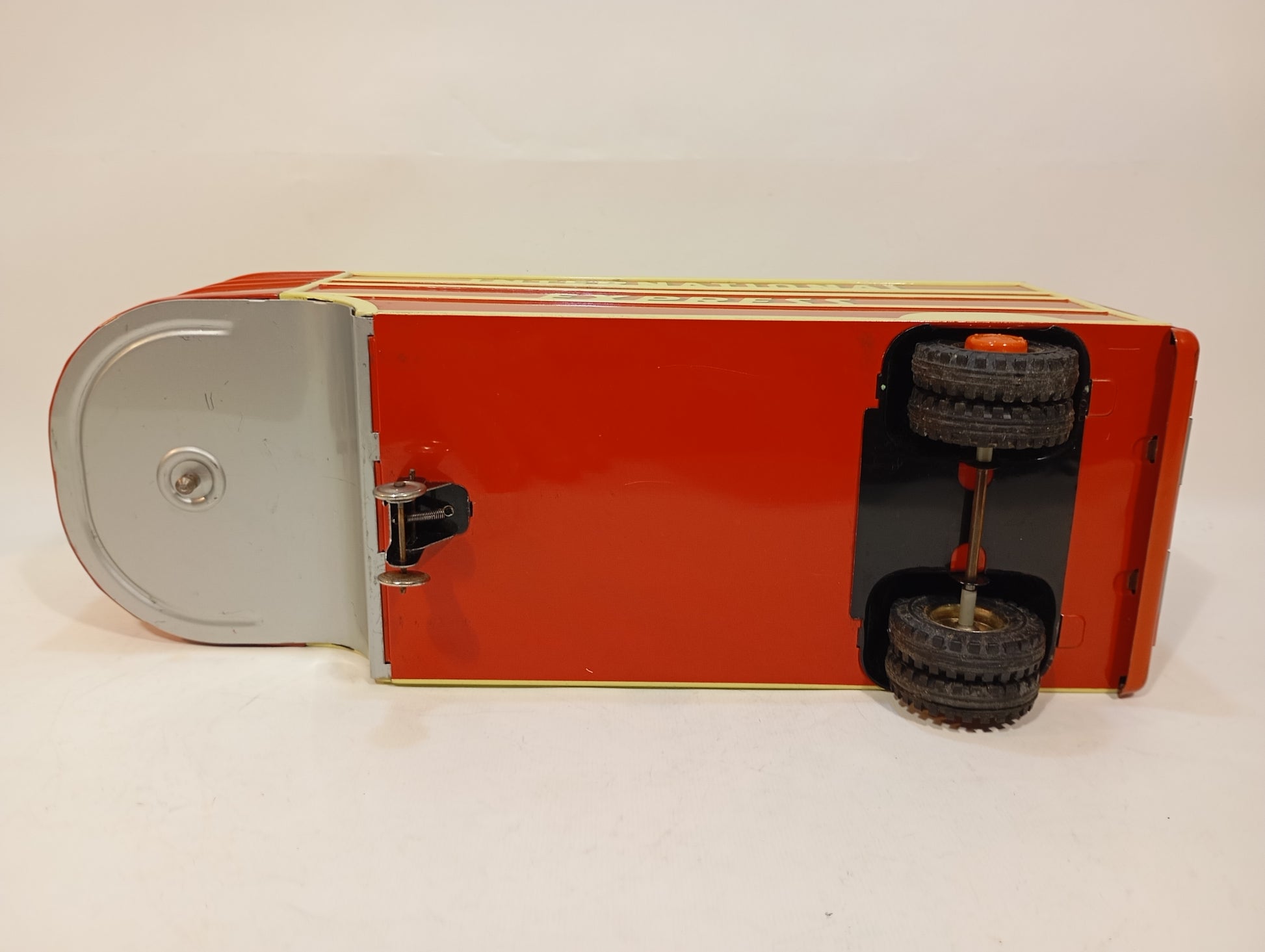 Schwungrad voll funktionsfähig, lithographiert und im nahezu neuwertigen Originalzustand. Die Heckklappe lässt sich öffnen. Das Spielzeug kommt in seiner originalen Box, die nur minimalen Kantenabrieb aufweist. Das Deckelbild ist besonders ansprechend gestaltet und macht es zu einem Highlight für den anspruchsvollen Sammler. Das Modell misst 48 cm und stammt aus den 50er/60er Jahren. Es handelt sich um einen Büssing-Lkw, der den bekannten Arnold-Modellen sehr ähnelt – ein Stück, das kaum schöner sein könnte.