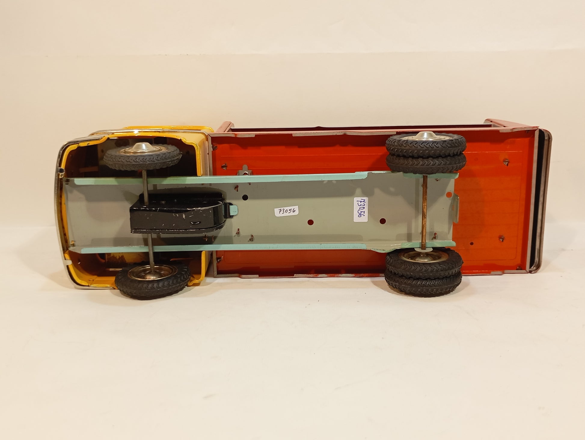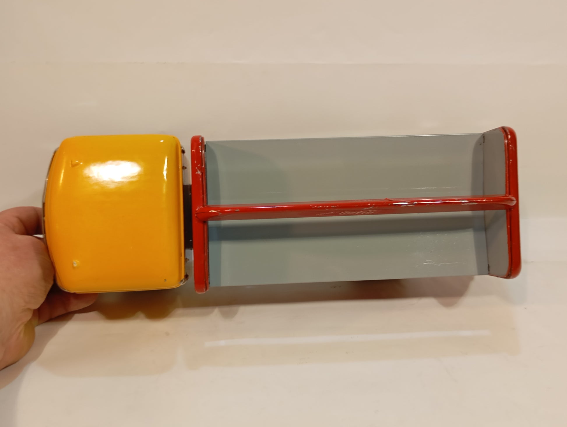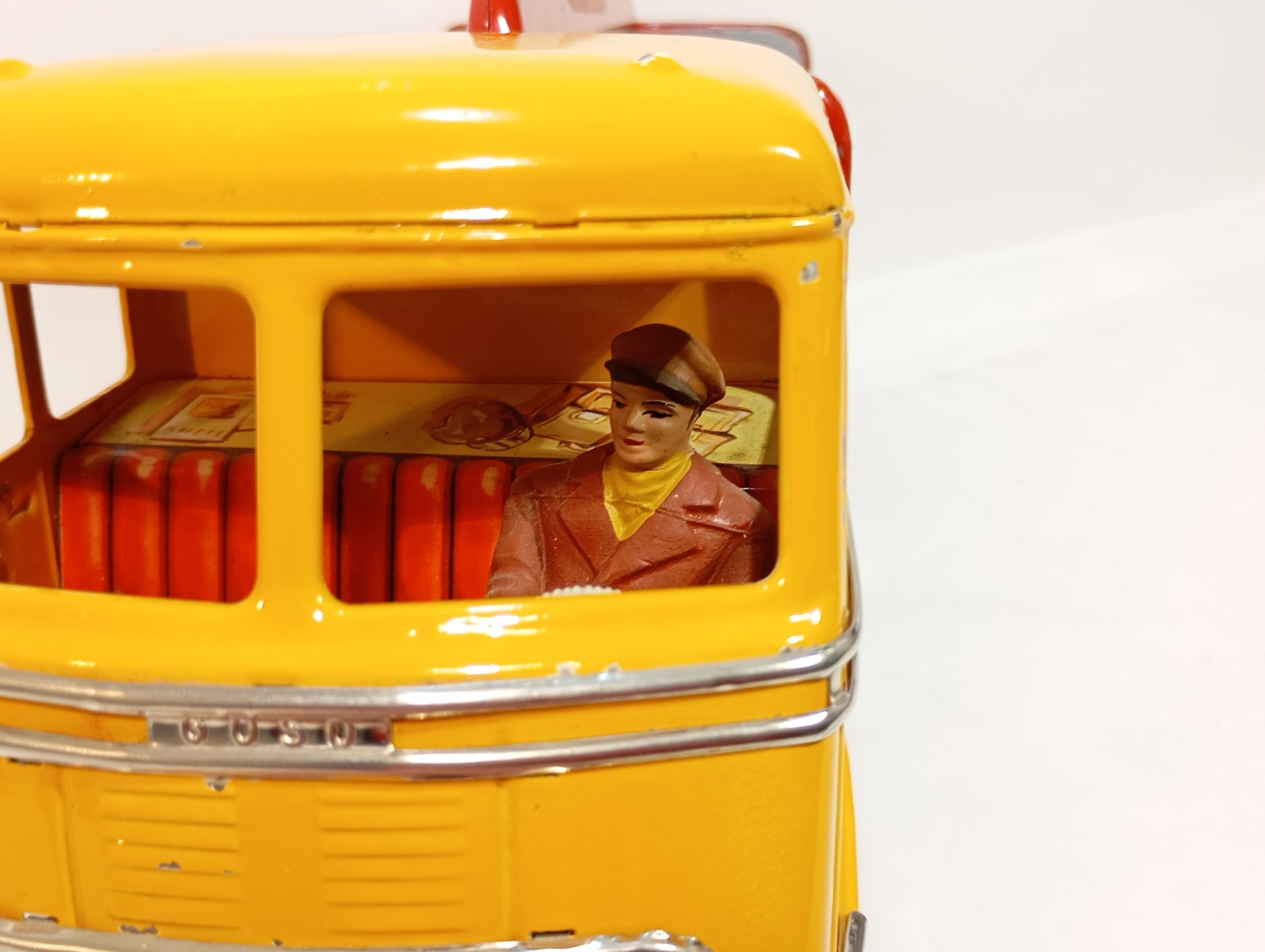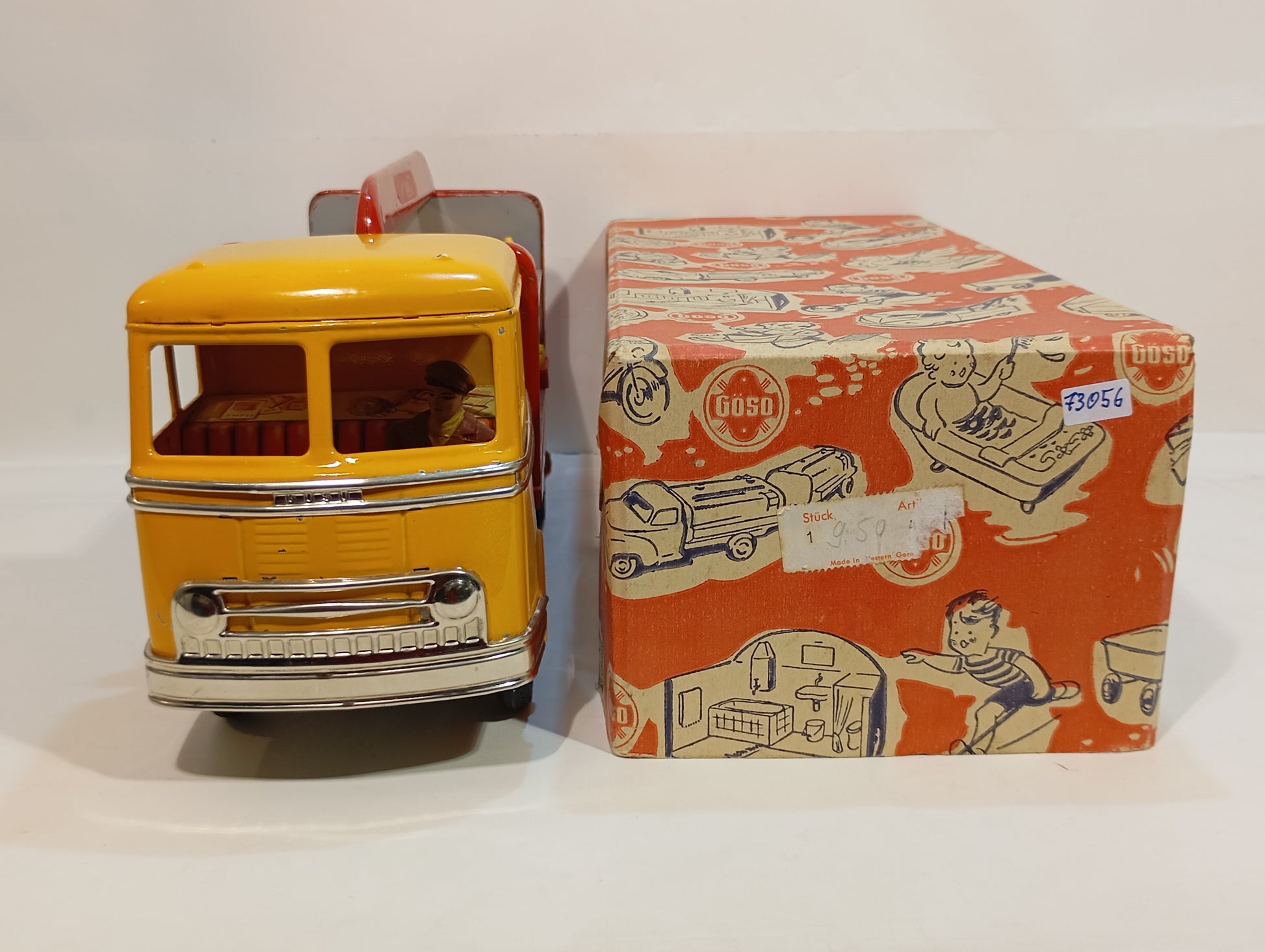 Mit originaler Werkshandlackierung aus den 1960er-Jahren und kompletter Beladung präsentiert sich dieser seltene Göso-LKW in außergewöhnlich gutem Zustand. Er ist mit intakten Coca-Cola-Aufklebern, funktionierendem Schwungrad und einer Fahrerfigur ausgestattet. Die Farbgestaltung wurde dezent angeglichen, ohne den authentischen Charakter zu beeinträchtigen. Mit einer Länge von 34 cm zählt er zu den begehrtesten Stücken von Göso – eine Rarität, die durch den originalen Karton zusätzlich aufgewertet wird.
