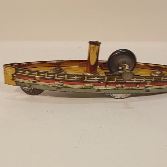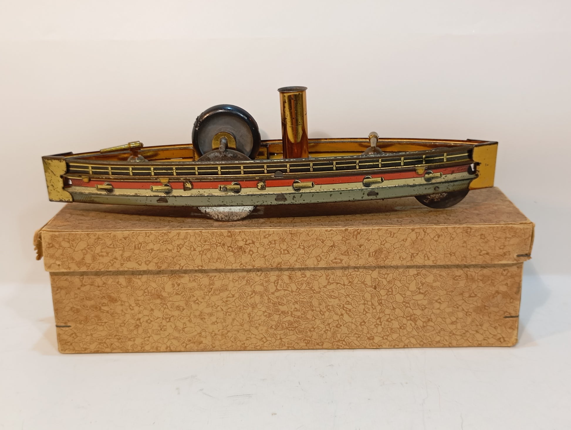 Kanonenboot um 1910 mit funktionierendem Reibradantrieb, im schönen Originalzustand mit nur leichten Alters- und Gebrauchsspuren. Komplett mit Originalkarton. In dieser Version selten zu finden. Länge: 25 cm.