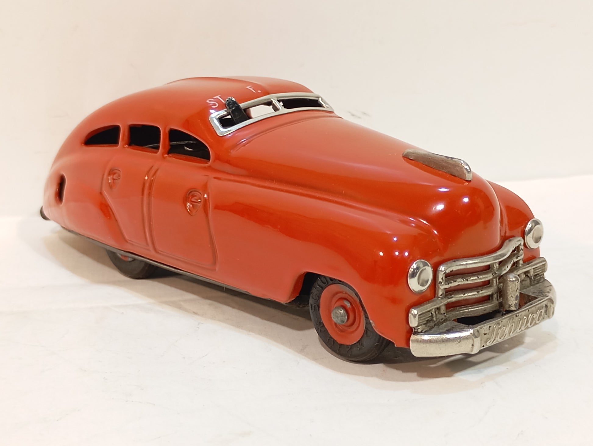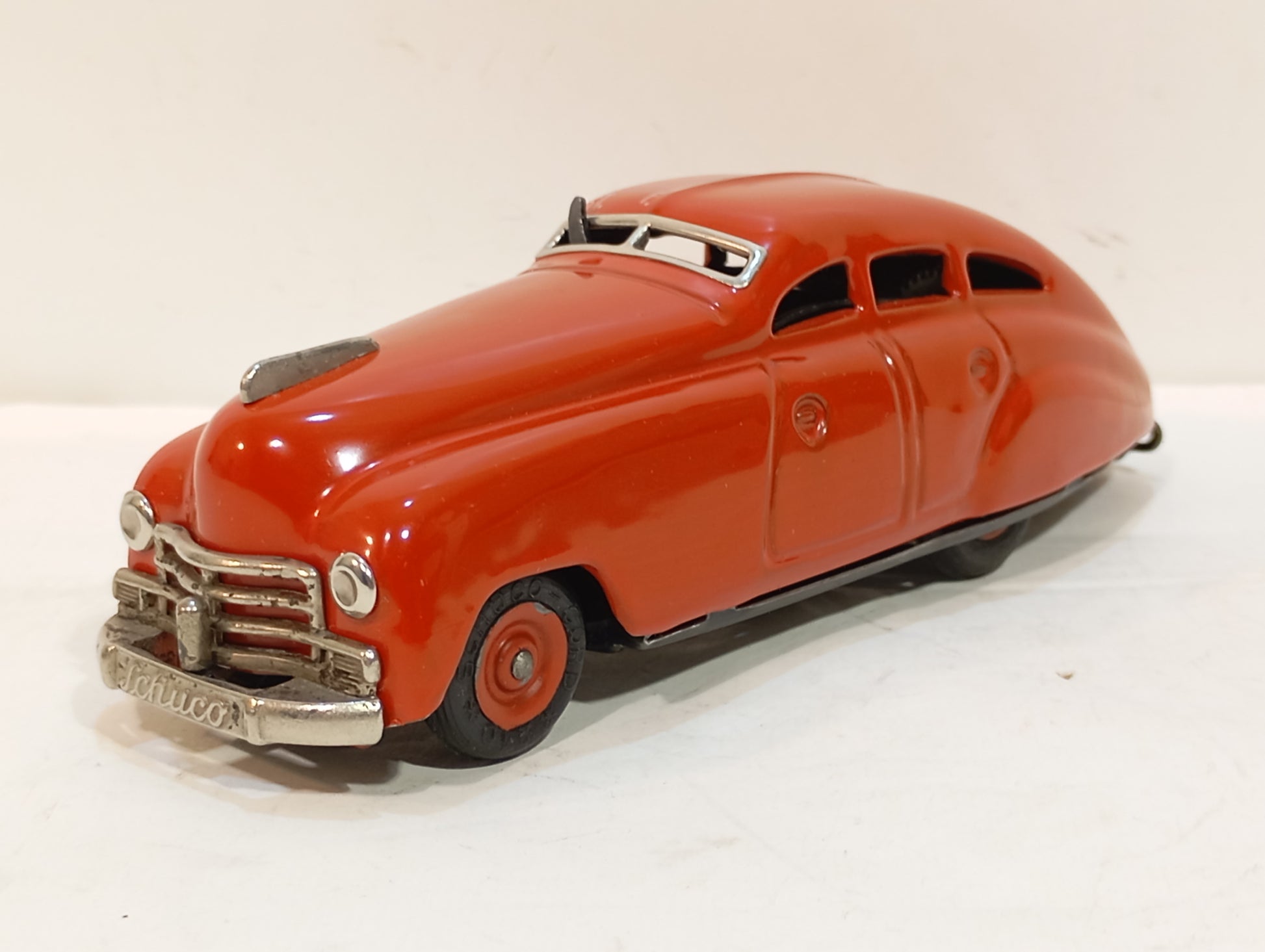 Mit allen Laschen, sehr guter Originalzustand und noch sehr fest in der Pappe, ohne Spielspuren, besser geht’s kaum, originaler Schuco Schlüssel, in hellrot, 50er Jahre, das Garagenauto, er fährt vorwärts wie rückwärts je nach Stoßstangen-Einstellung, 14 cm, Uhrwerk funkt.