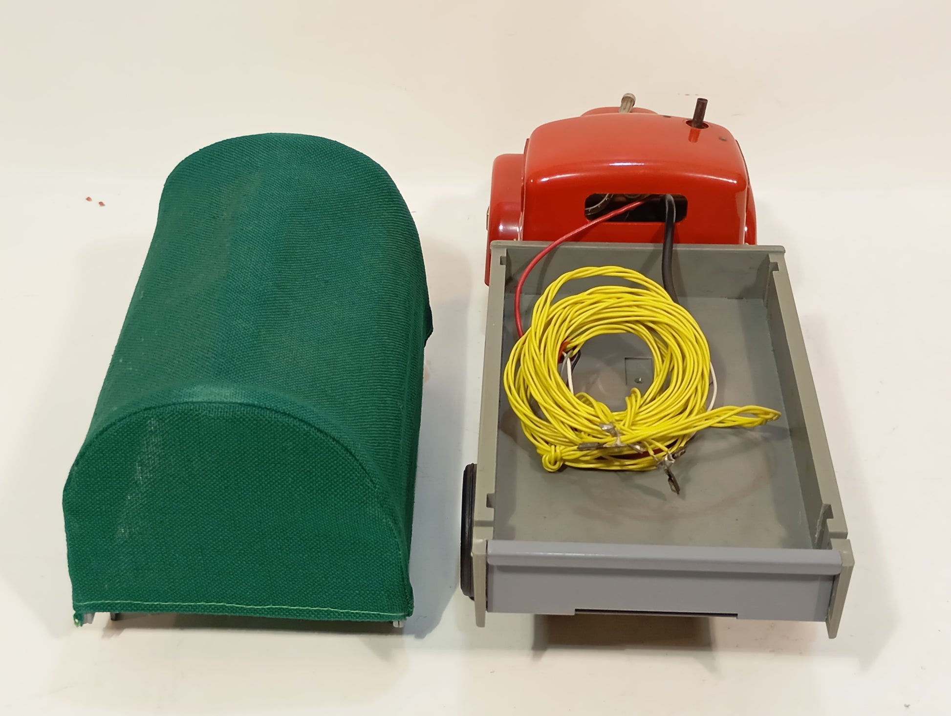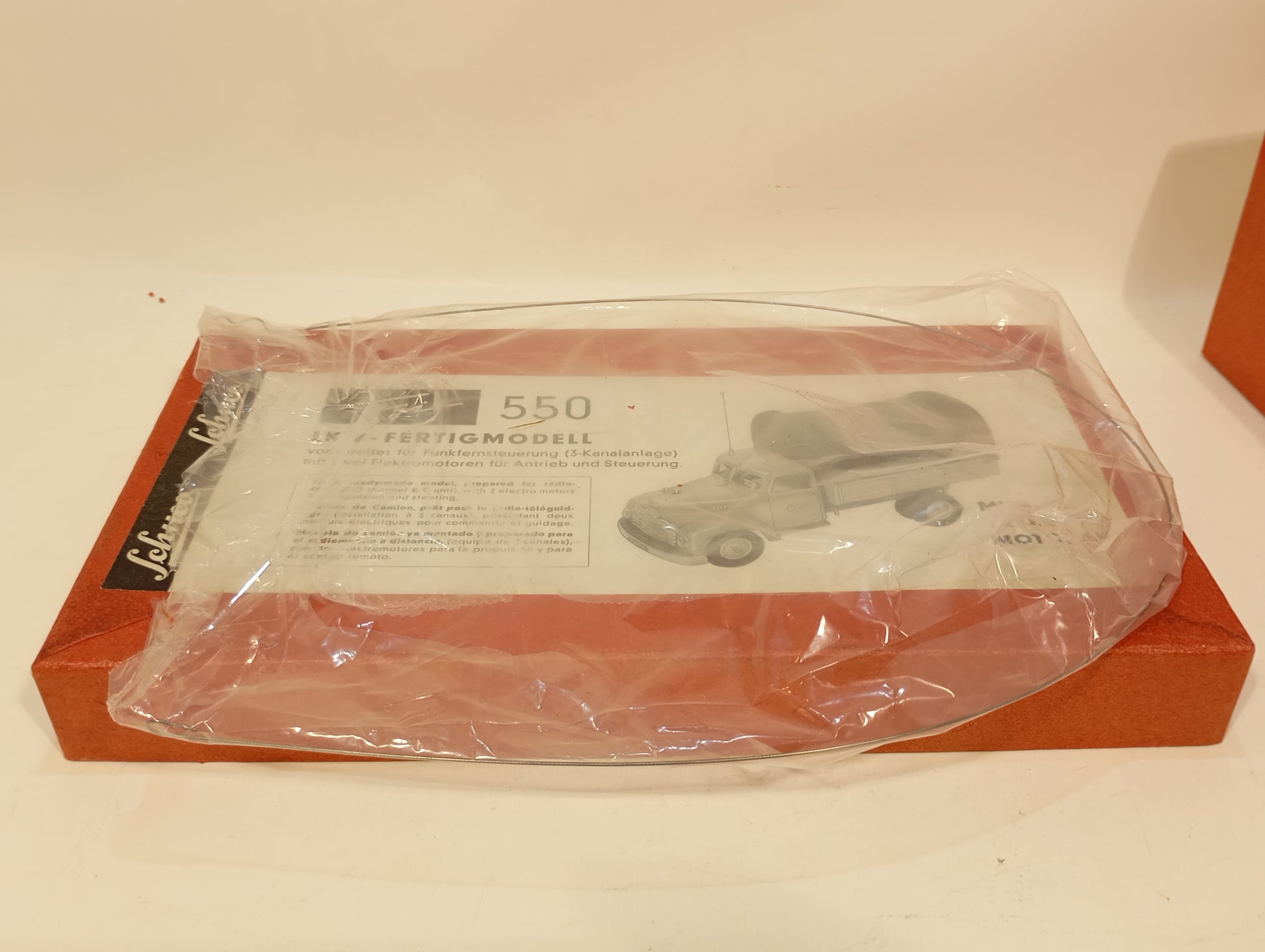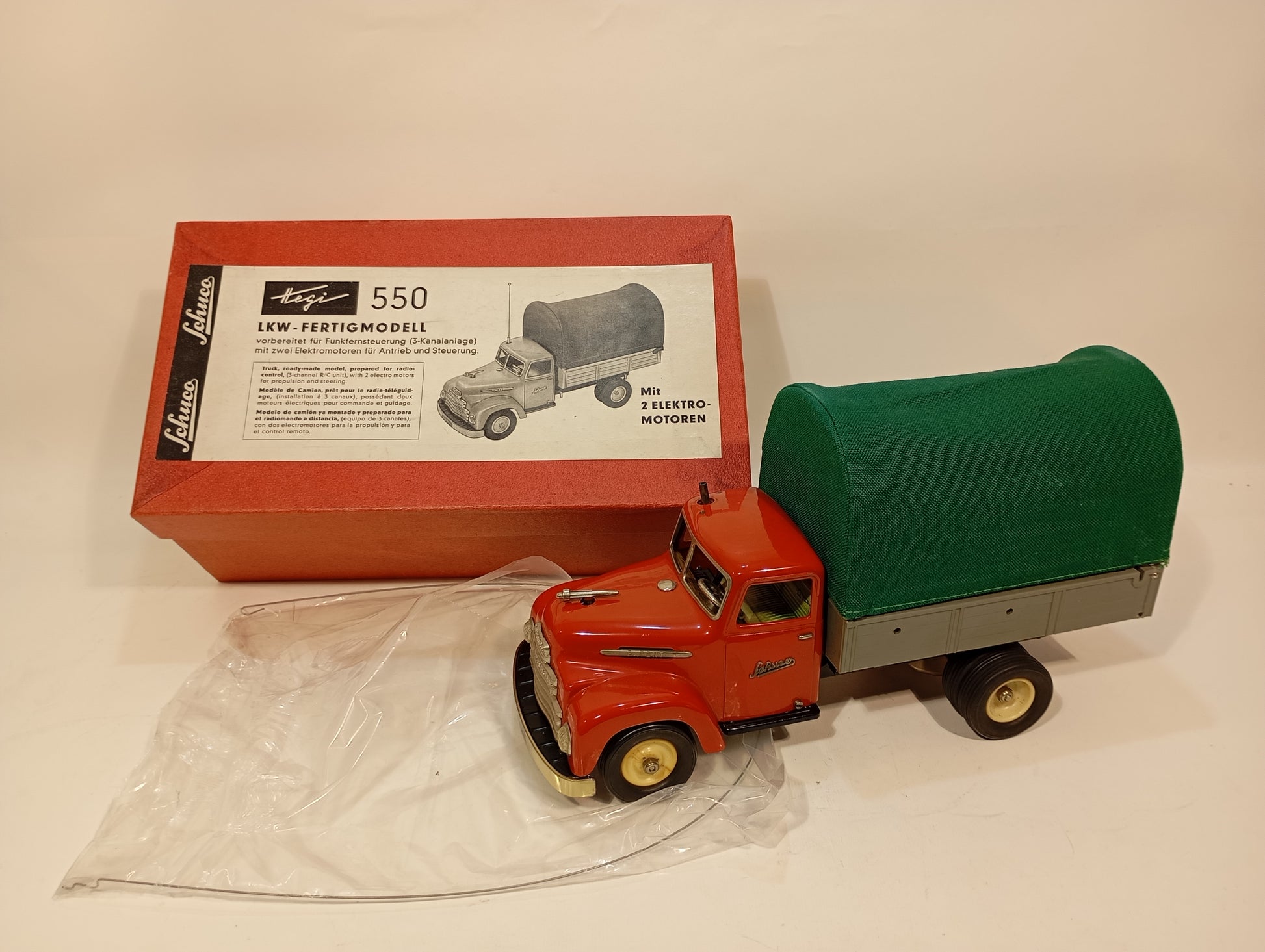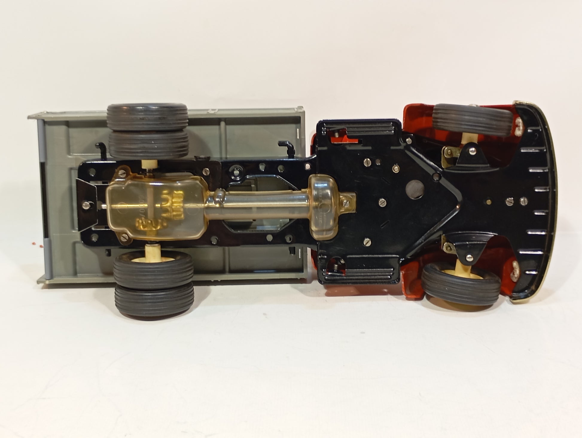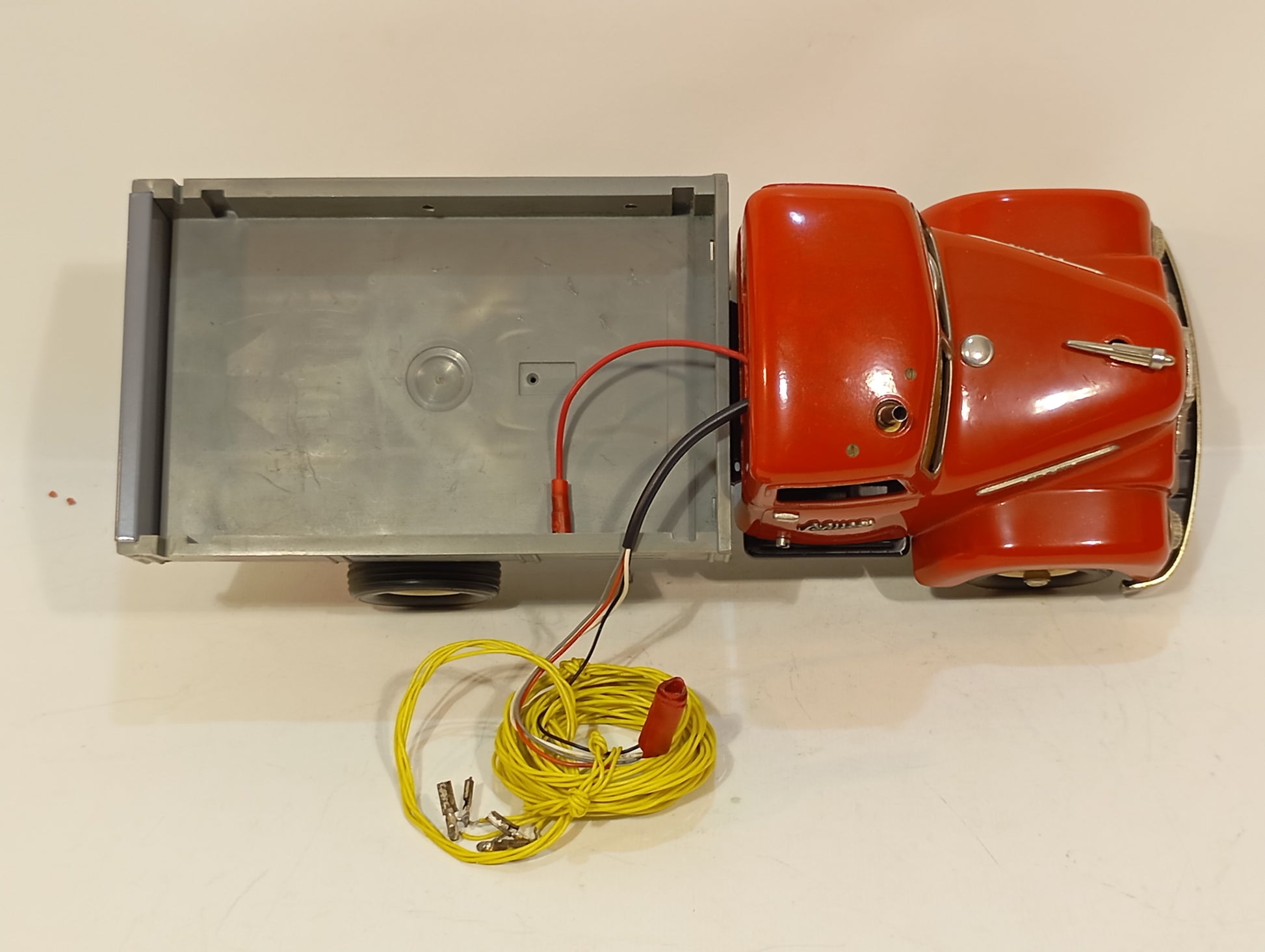 Dies ist die ursprüngliche Werksversion ohne Funkfernsteuerung, die damals separat erworben werden musste. In dieser Zeit begannen Schuco und Hegi ihre Zusammenarbeit. Nur in wenigen Exemplaren entstand eine gemeinsame Produktion, doch dieses Stück gilt als Höhepunkt dieser Kooperation. Es stammt aus den 1960er-Jahren und präsentiert sich als Auto mit Plane und Originalbox. Alles befindet sich in makellosem Zustand – besser geht es nicht. Länge: 27,5 cm, original handlackiert.