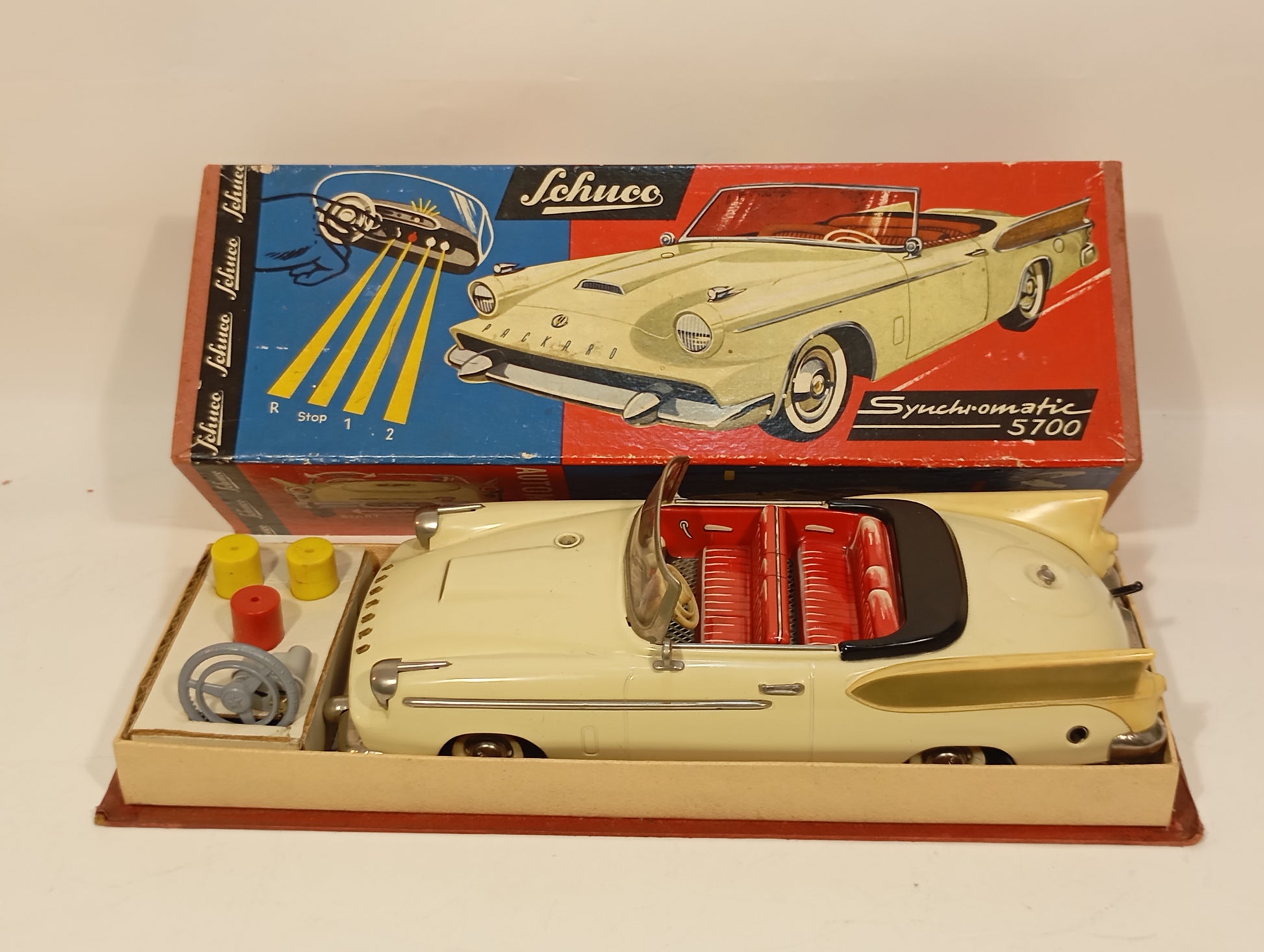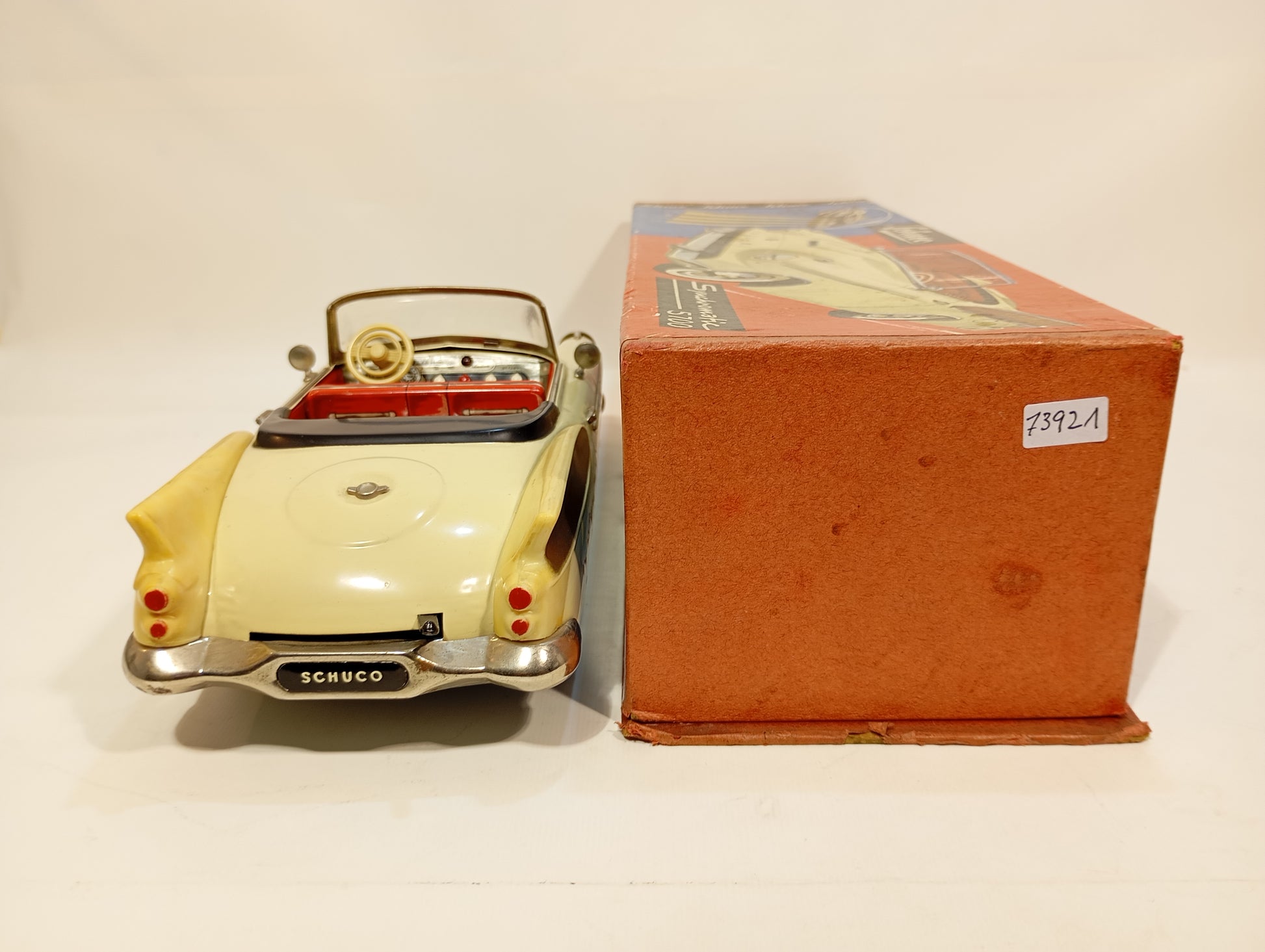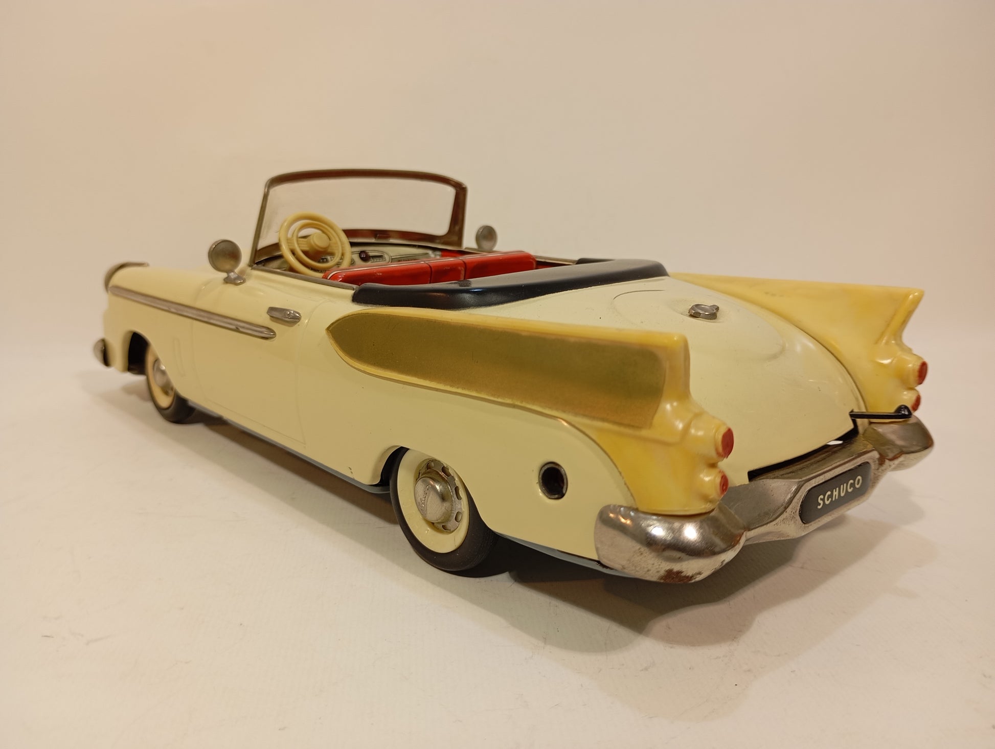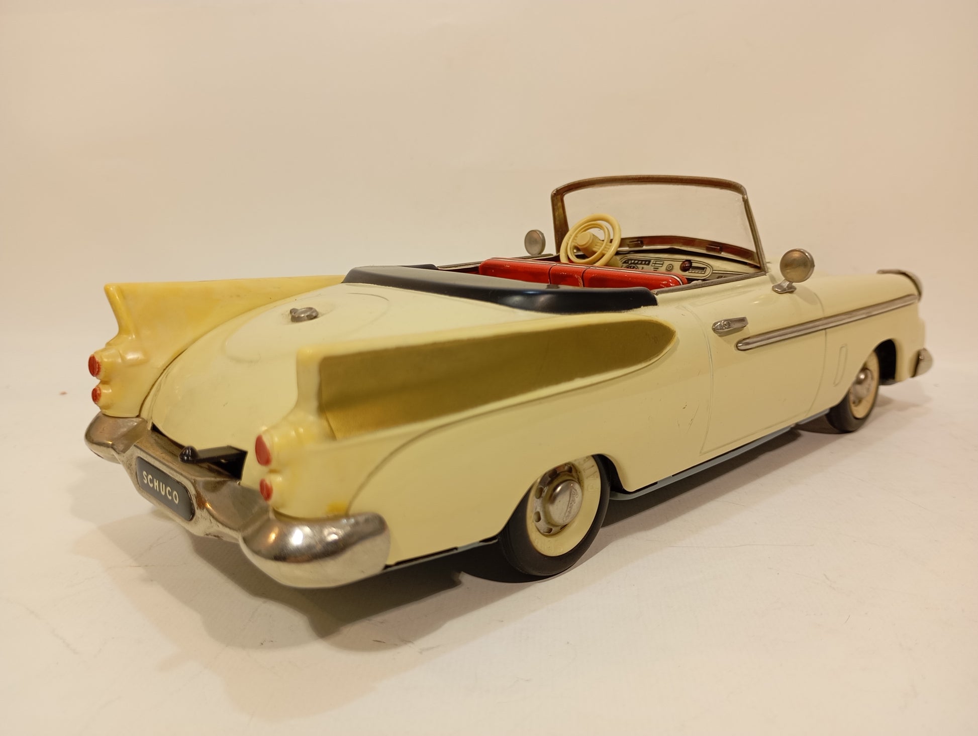 Wunderschön erhaltener Originalzustand mit nur leichten Korrosionsspuren an der Batteriefachaufnahme. Es handelt sich um die dritte Version – erkennbar daran, dass die Lampen ohne Blinker ausgeführt sind. Die elegante, beigefarbene Lackierung harmoniert perfekt mit den goldfarbenen Flossen. Der Batteriekasten präsentiert sich nahezu neuwertig. Inklusive originalem, abgeb. Zubehör, jedoch ohne Fernlenkdraht. Der gut erhaltene Originalkarton zeigt lediglich leichten Kantenabrieb.
