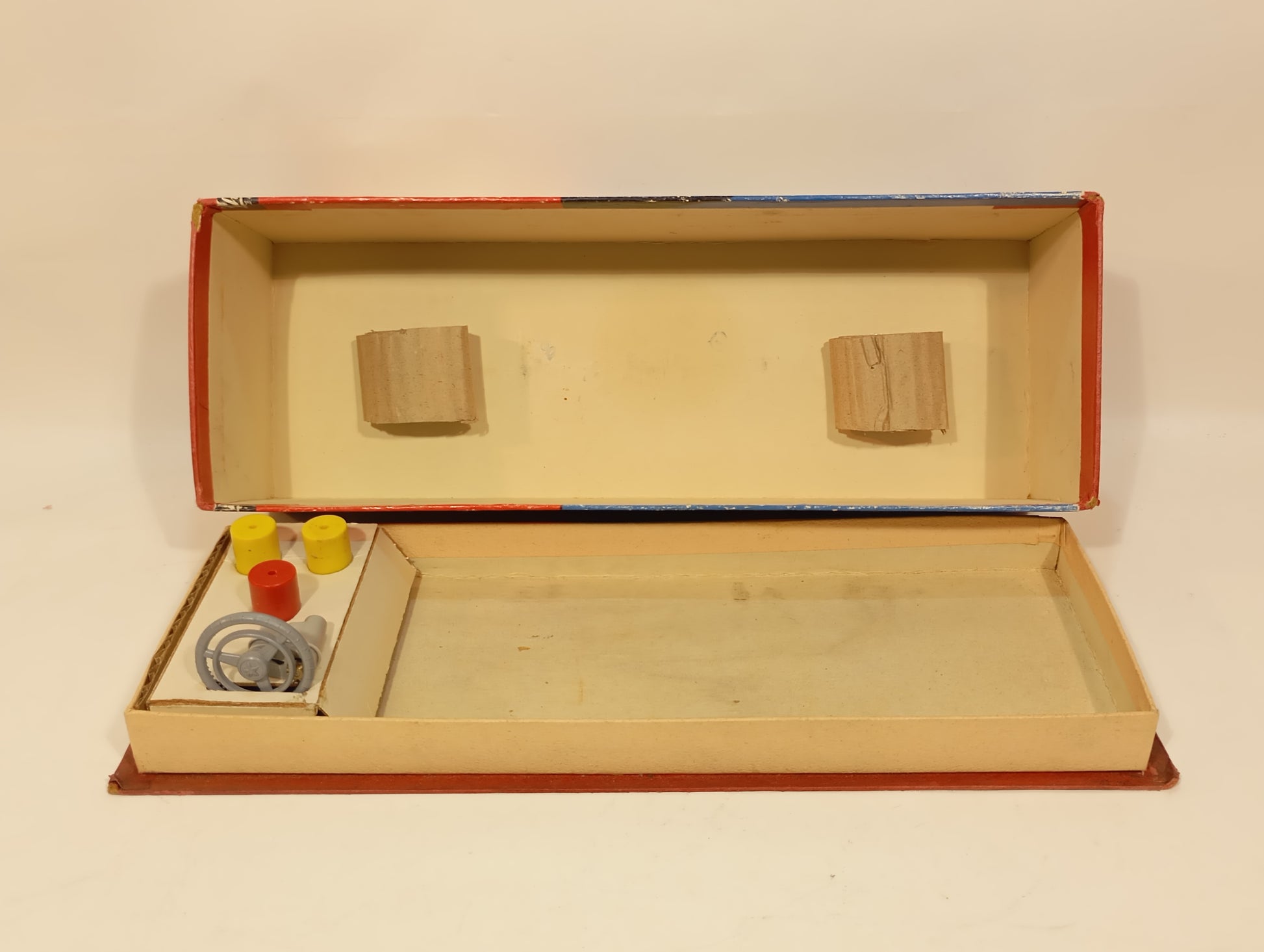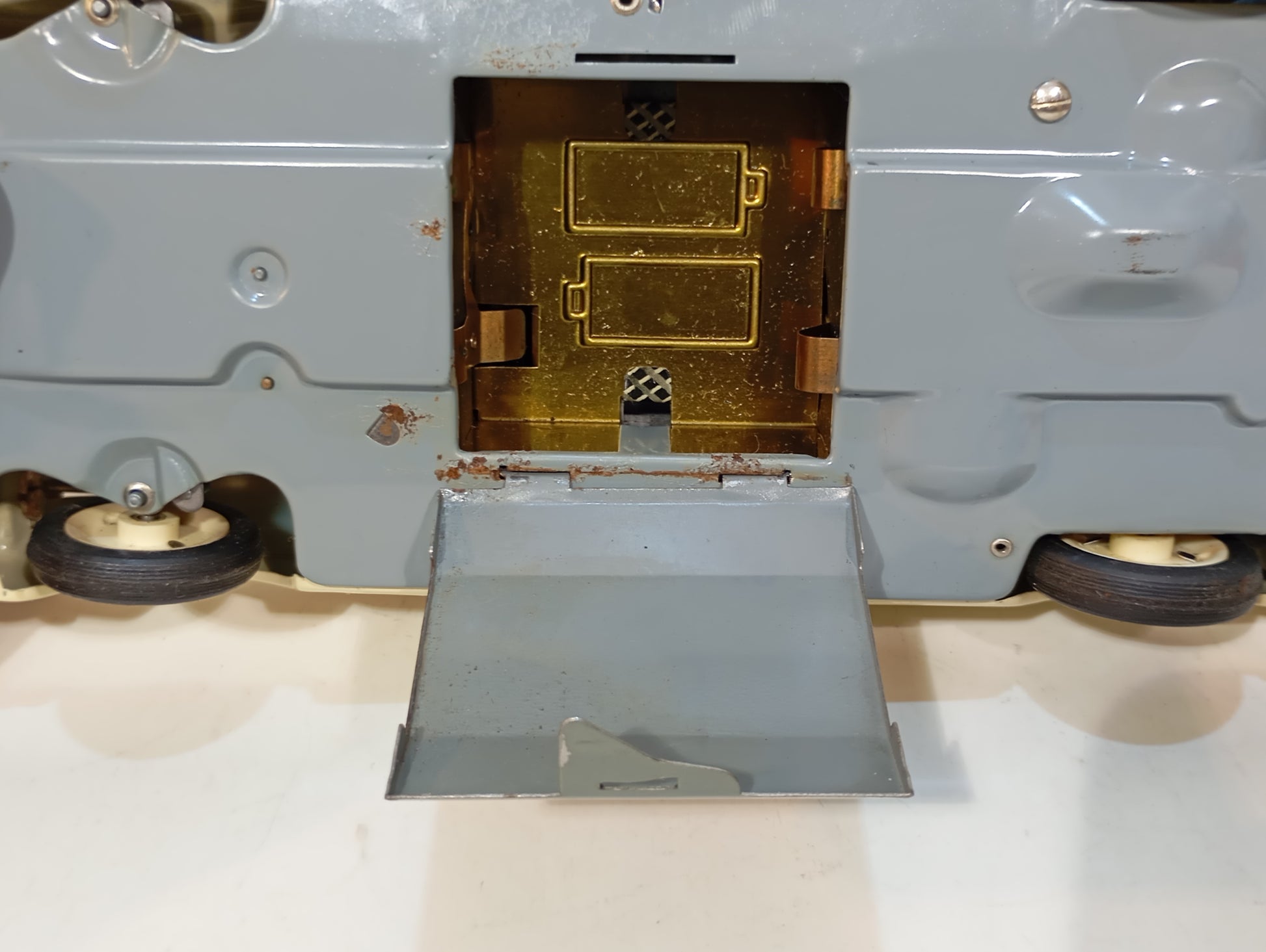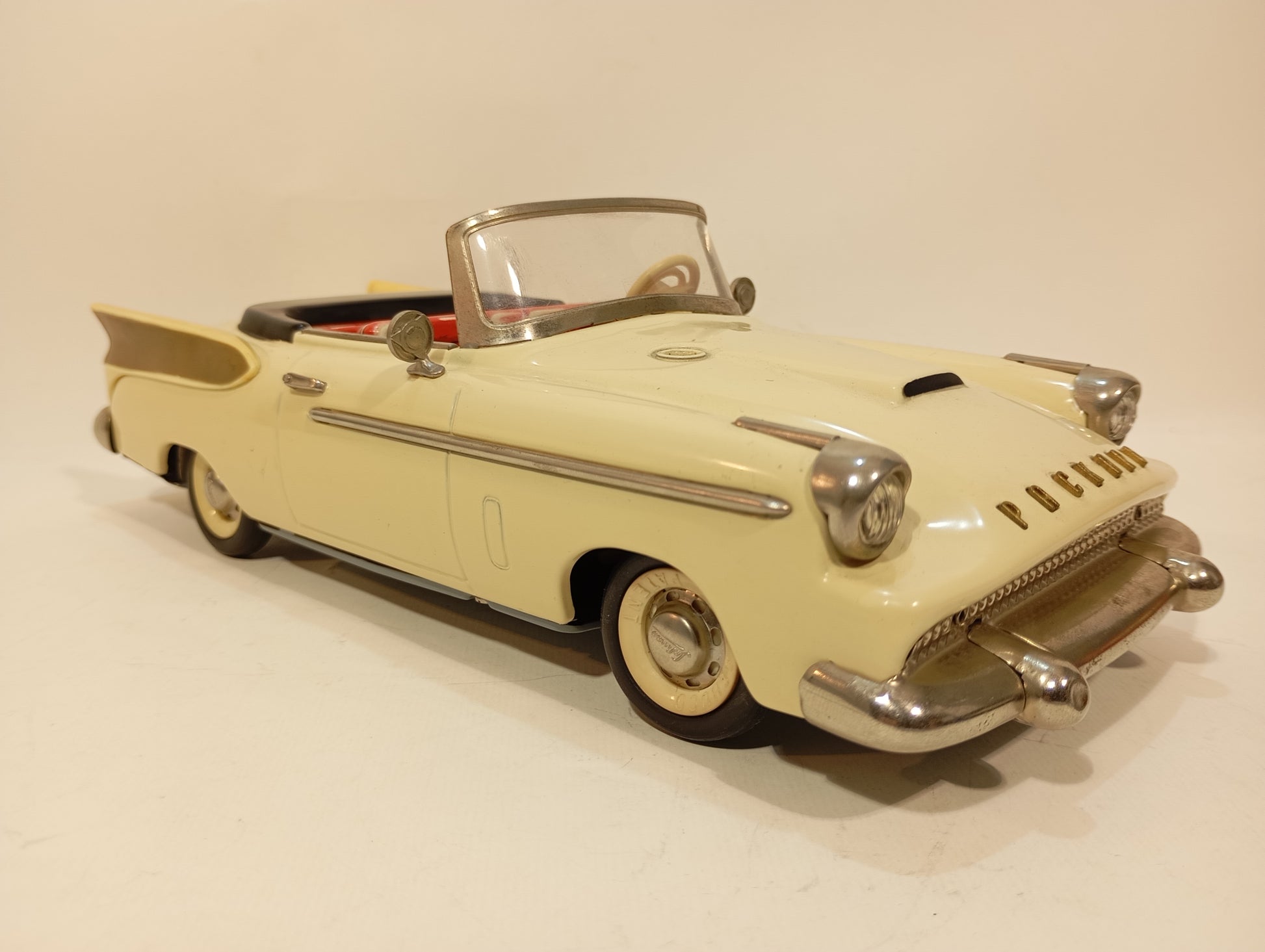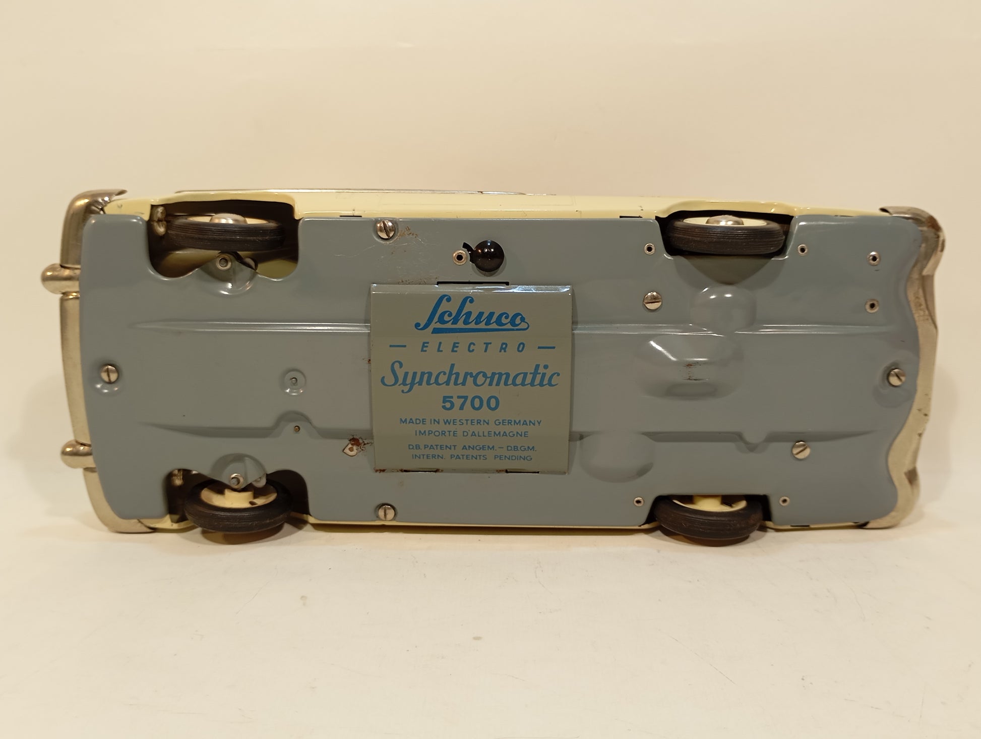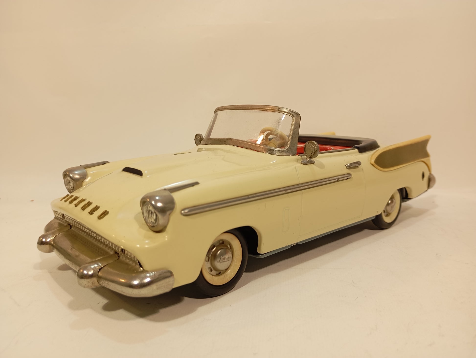 Wunderschön erhaltener Originalzustand mit nur leichten Korrosionsspuren an der Batteriefachaufnahme. Es handelt sich um die dritte Version – erkennbar daran, dass die Lampen ohne Blinker ausgeführt sind. Die elegante, beigefarbene Lackierung harmoniert perfekt mit den goldfarbenen Flossen. Der Batteriekasten präsentiert sich nahezu neuwertig. Inklusive originalem, abgeb. Zubehör, jedoch ohne Fernlenkdraht. Der gut erhaltene Originalkarton zeigt lediglich leichten Kantenabrieb.
