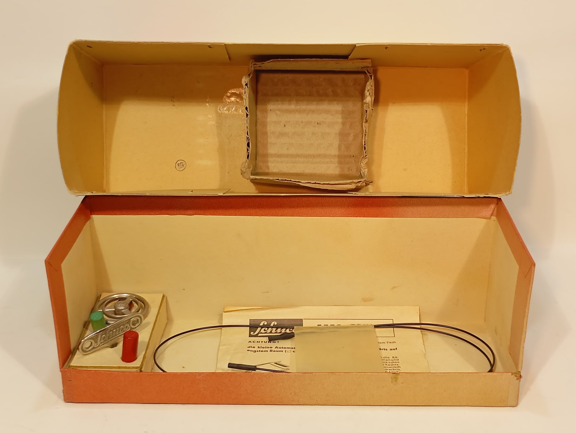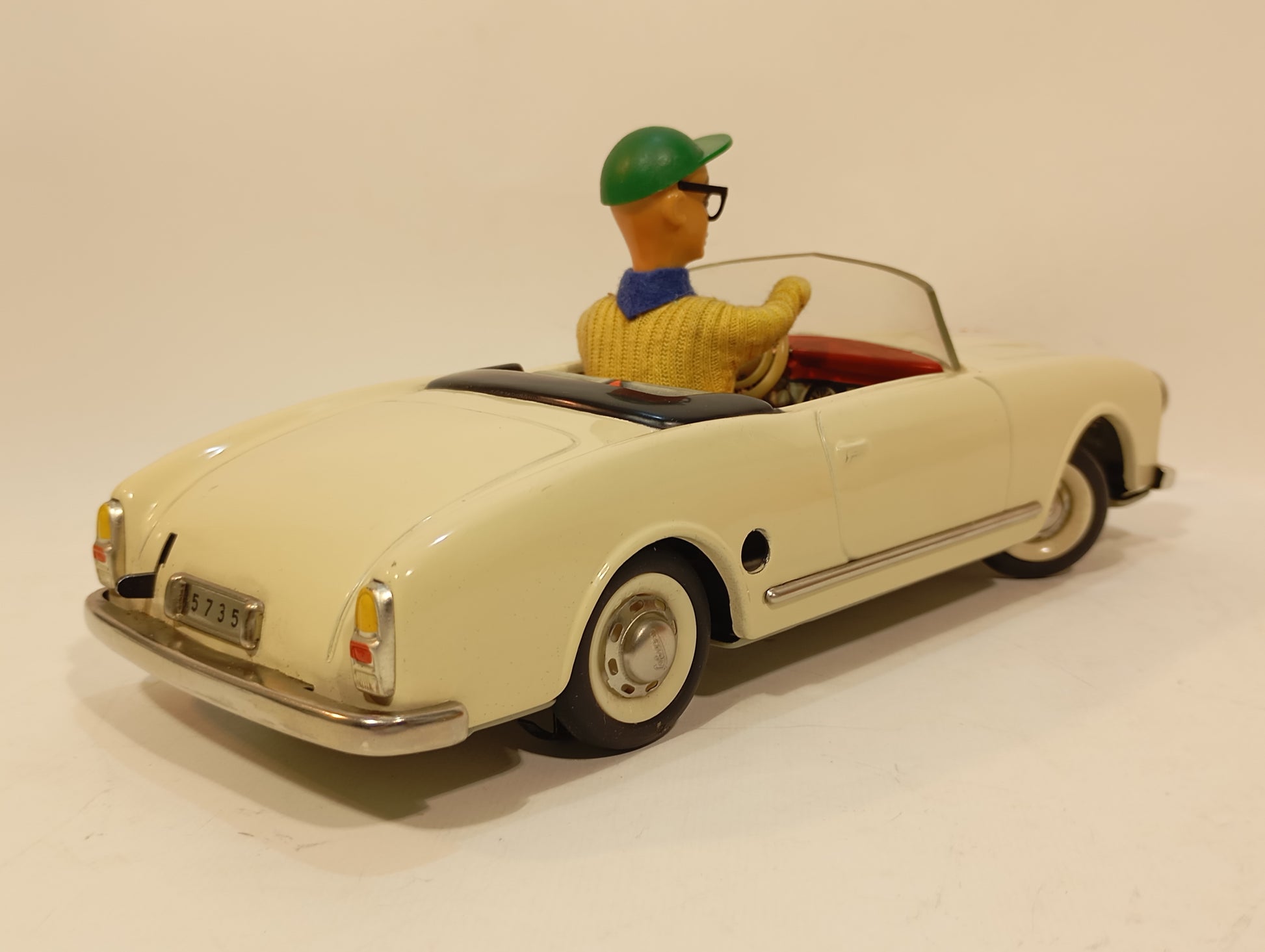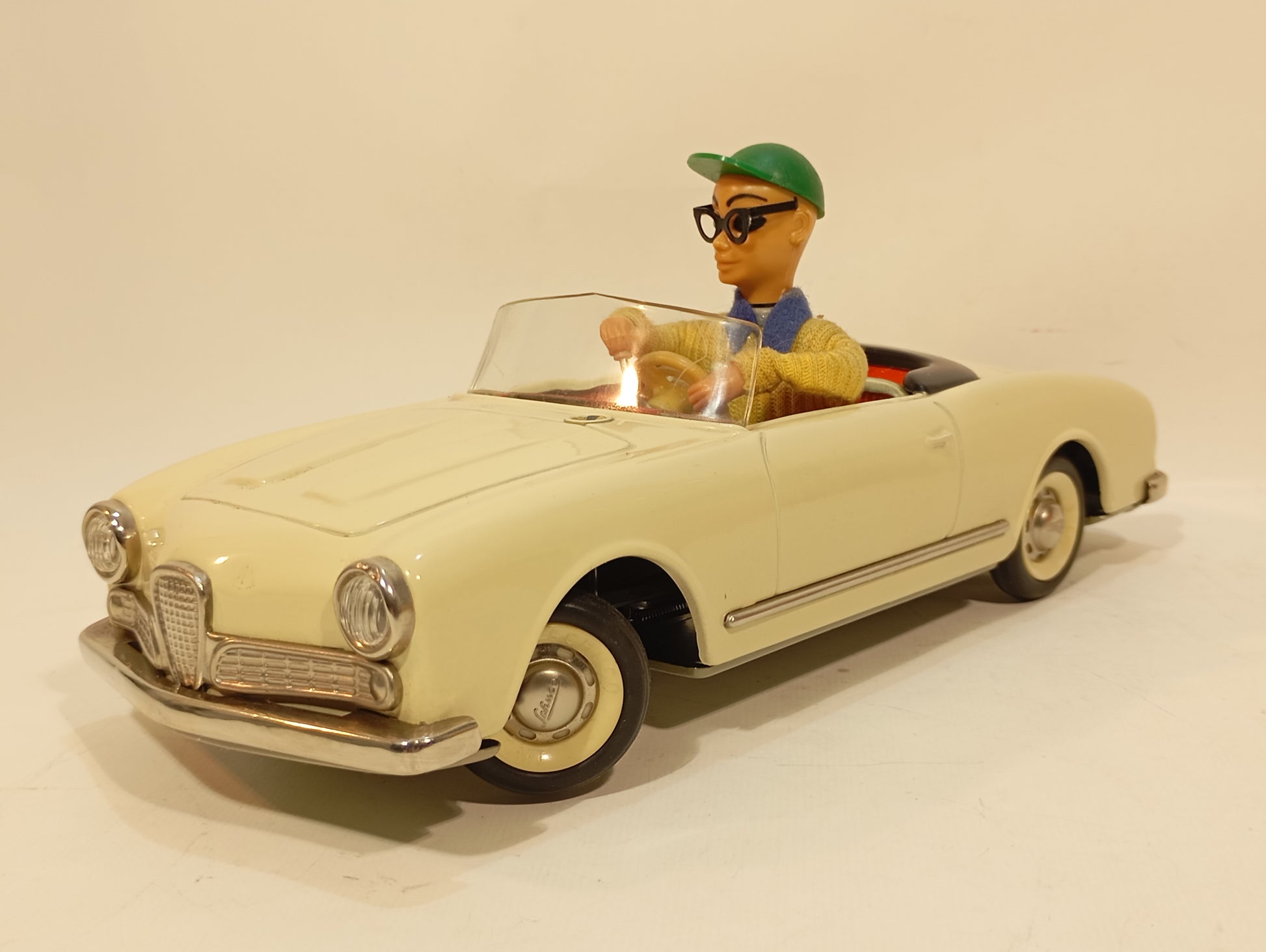 Außergewöhnliche Rarität aus den 60er Jahren: Ein Alfa Romeo Spyder (24 cm) in makellosem Originalzustand. Die Schachtel trägt ein attraktives Bildmotiv und ist inklusive der originalen Innenpappe vollständig erhalten. Das Fahrzeug selbst ist perfekt – besser geht es nicht – mit funktionierendem Uhrwerk, originalem Lenkdraht (noch verpackt) und vollständiger Beschreibung. Ein besonders gesuchtes Sammlerstück, das in allen Details überzeugt.