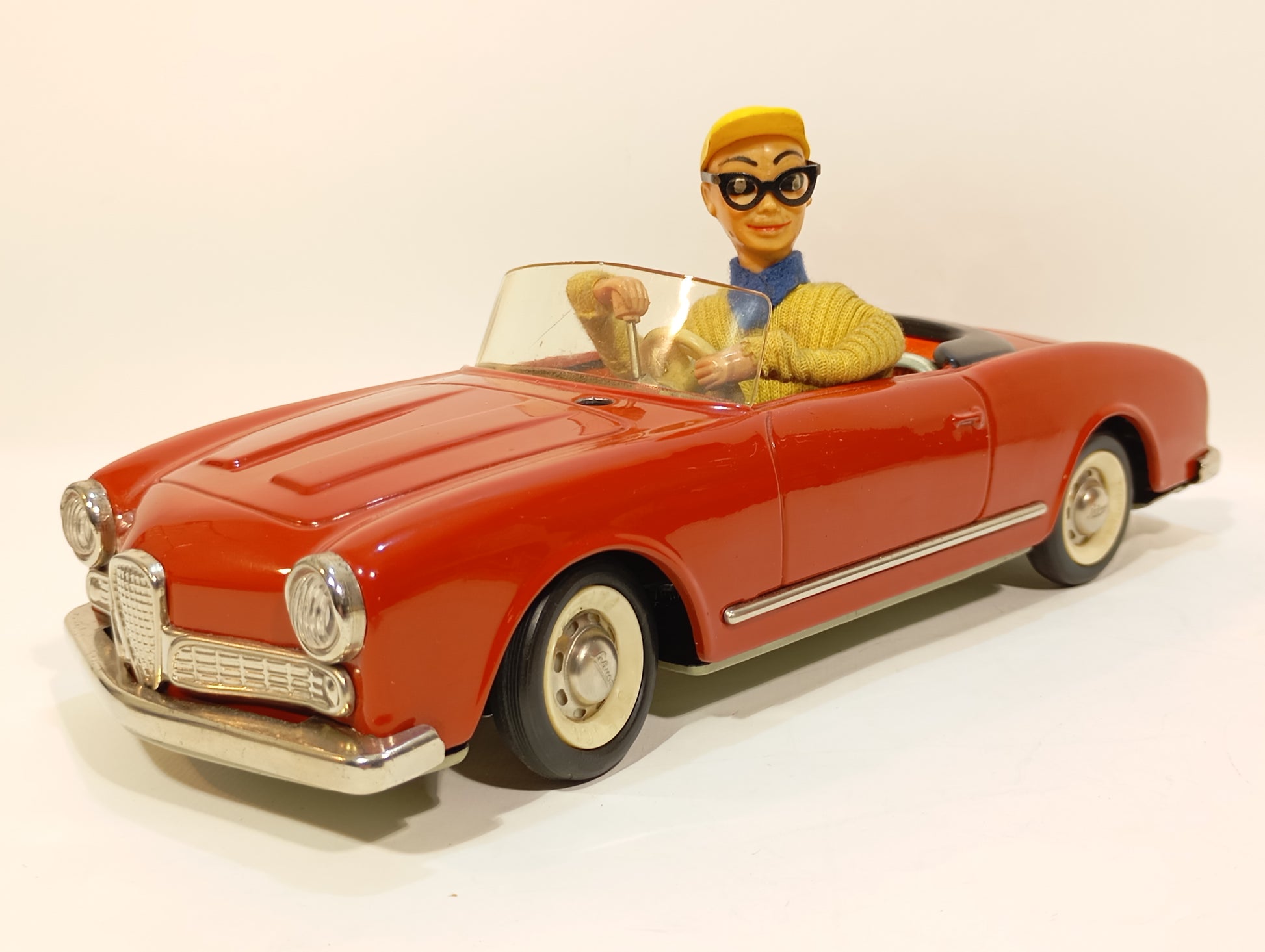 Äußerst seltene, rote Ausführung aus den 60er-Jahren: Alfa Romeo Cabriolet Spyder. Komplett mit sämtlichem Zubehör und in originalem Bestzustand – ein begehrtes Sammlerstück. Das Uhrwerk läuft einwandfrei. Der Originalkarton ist sehr gut erhalten, mit minimalem Kantenabrieb, innen an einer Seite dezent mit Tesafilm verstärkt. Dazu ein seltener Aufkleber mit der männlichen Fahrerfigur. Länge: 24,5 cm.