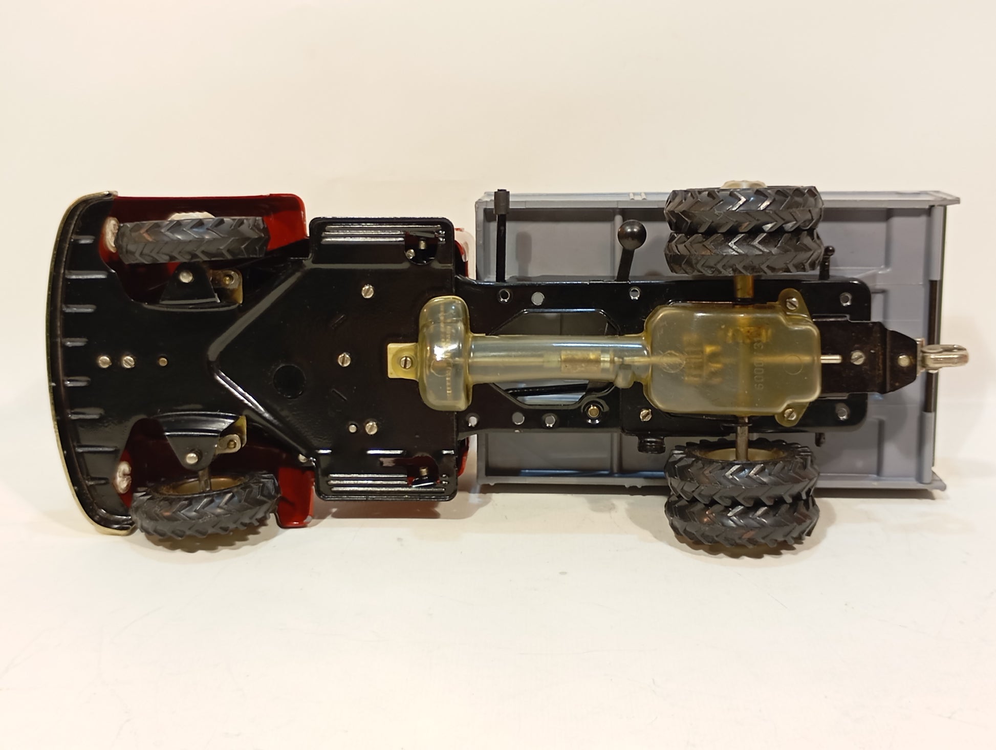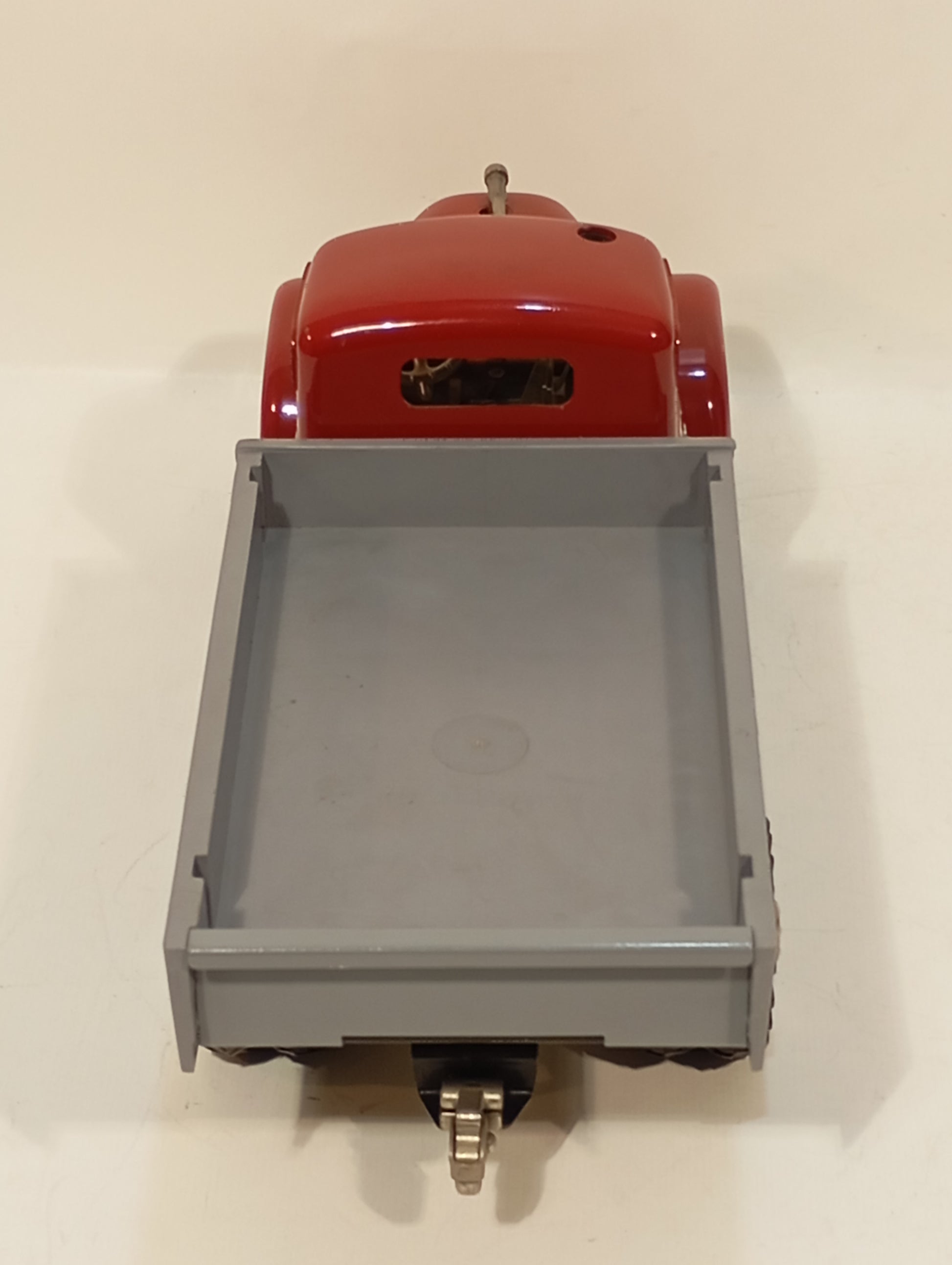 Elektrischer Antrieb voll funktionsfähig. Originalzustand neuwertig. Es handelt sich um die letzte Version des Schuco Constructions LKWs. Im Unterschied zur frühen Ausführung ist dieser LKW in dunkelrot lackiert (vormals hellrot) und mit Blechfelgen in der finalen Version ausgestattet. Herstellung Mitte der 1960er Jahre. Komplett mit sämtlichem Zubehör, inklusive originaler Beschreibung. Die Schachtel sowie das Fahrzeug wirken unbespielt, ohne Gebrauchsspuren. Länge des LKW: 26 cm.
