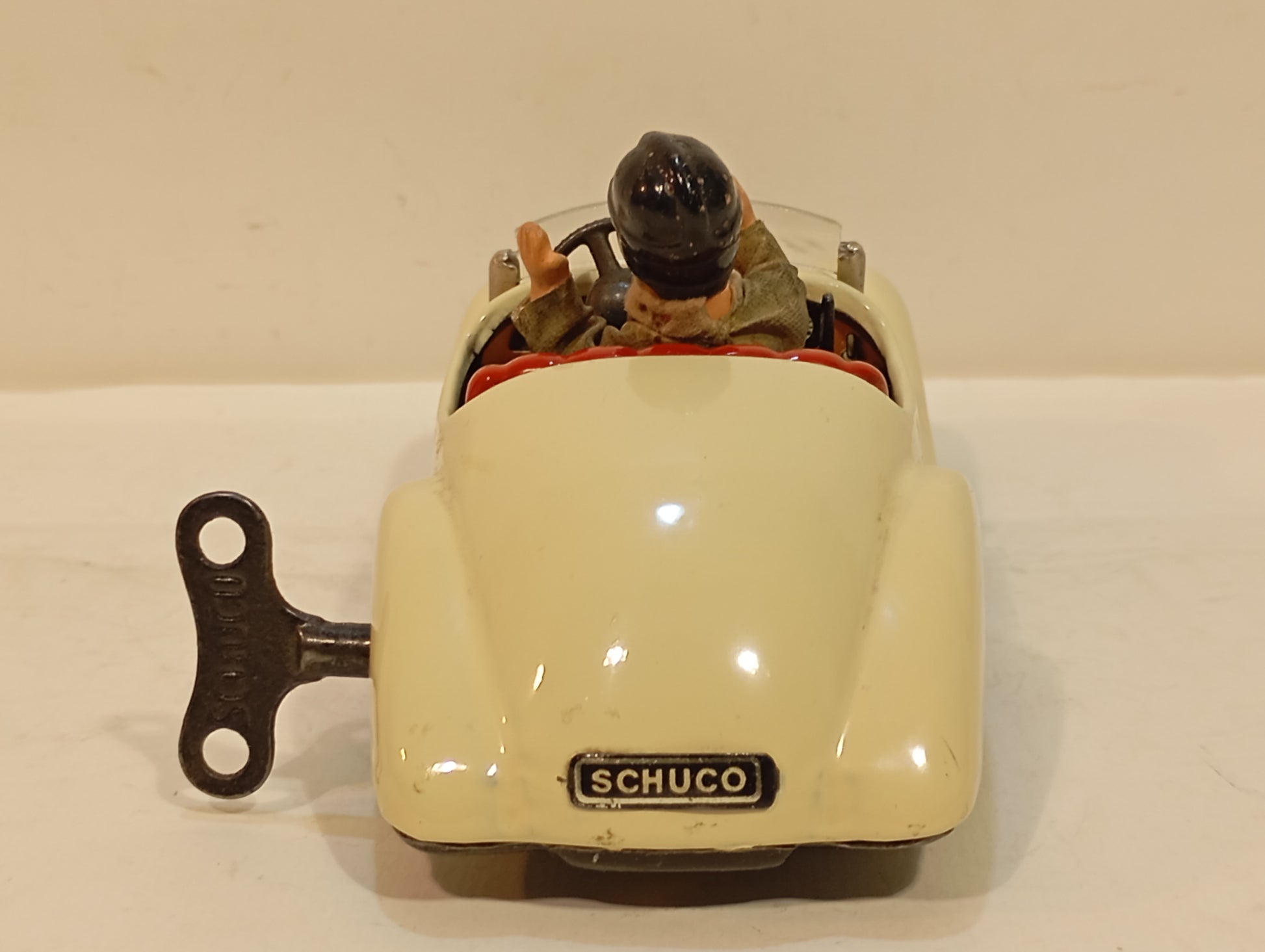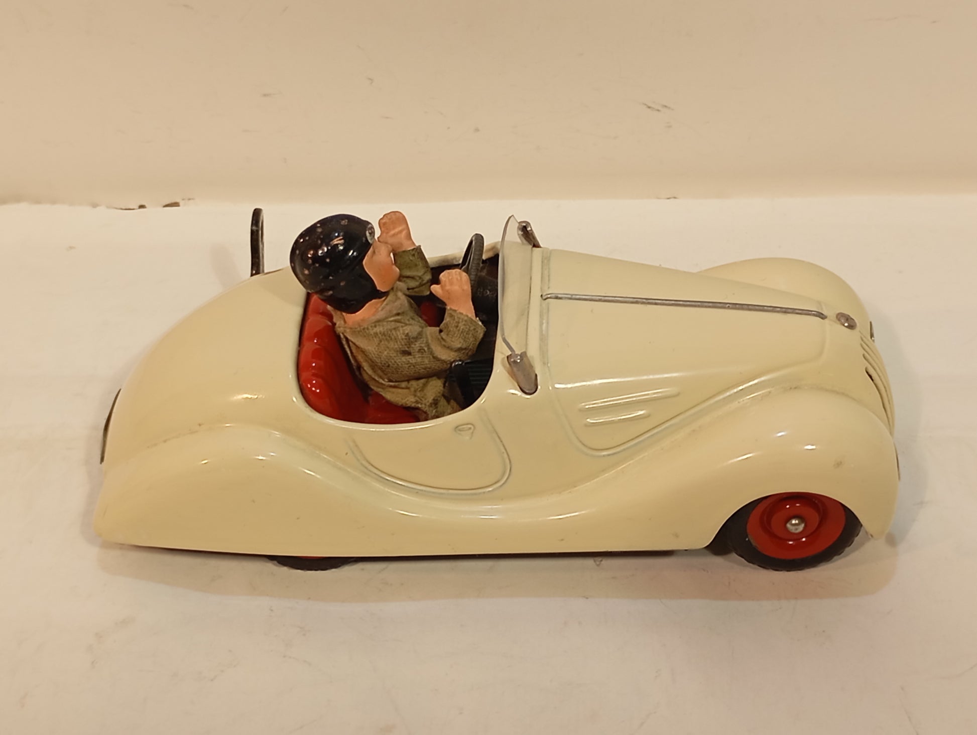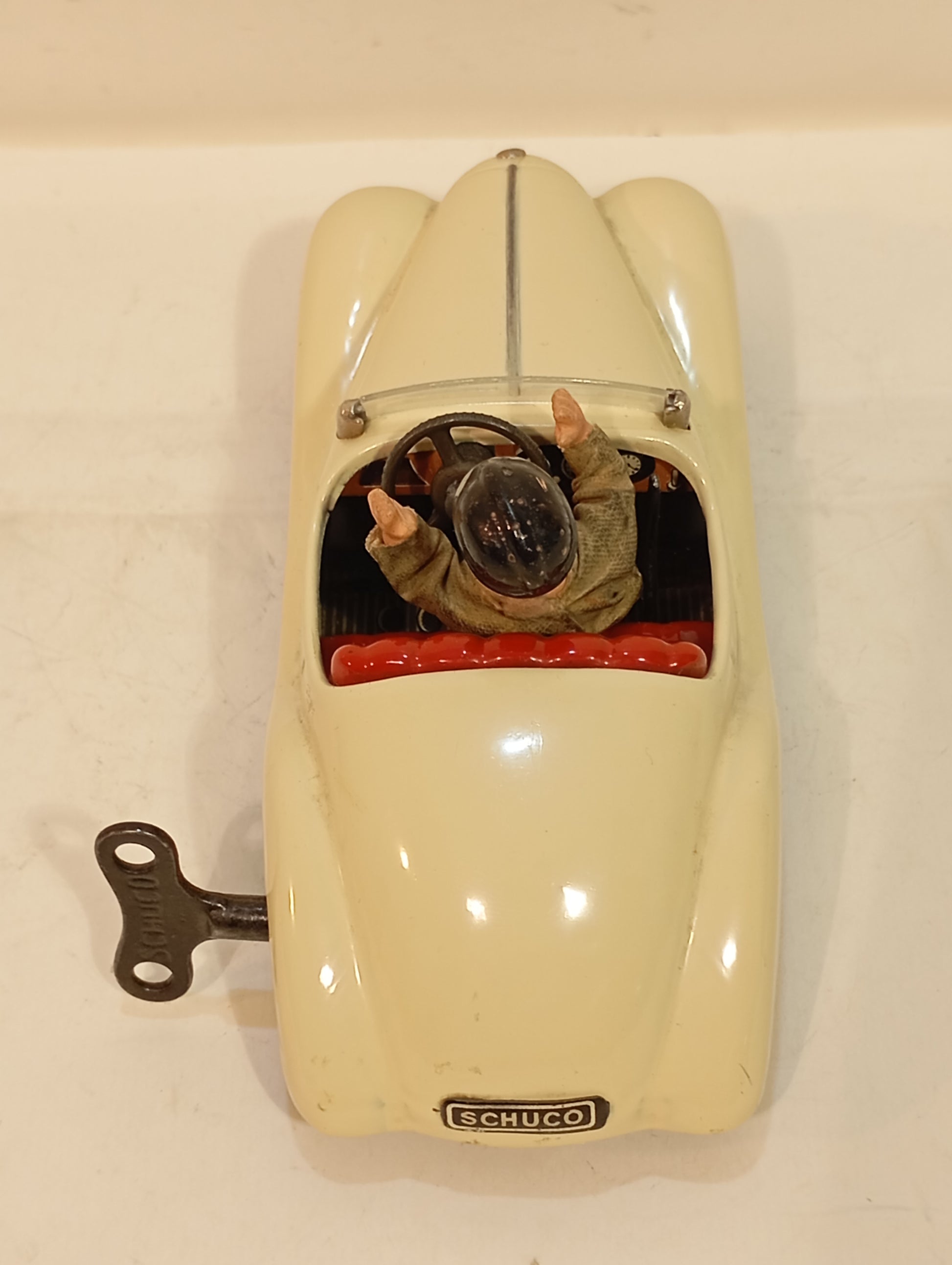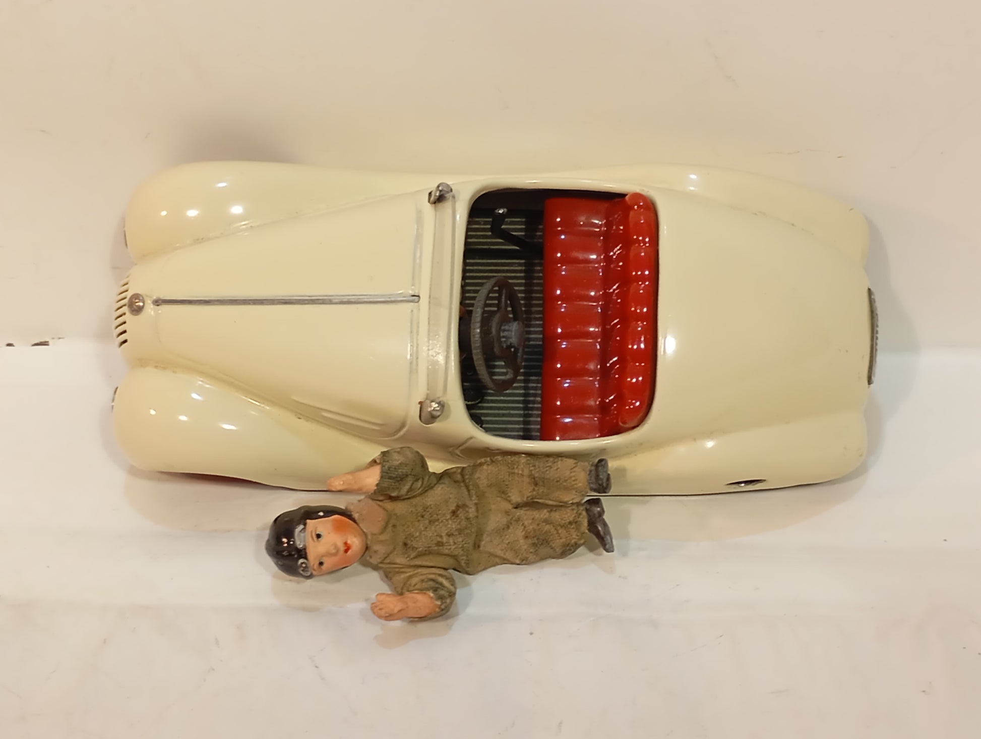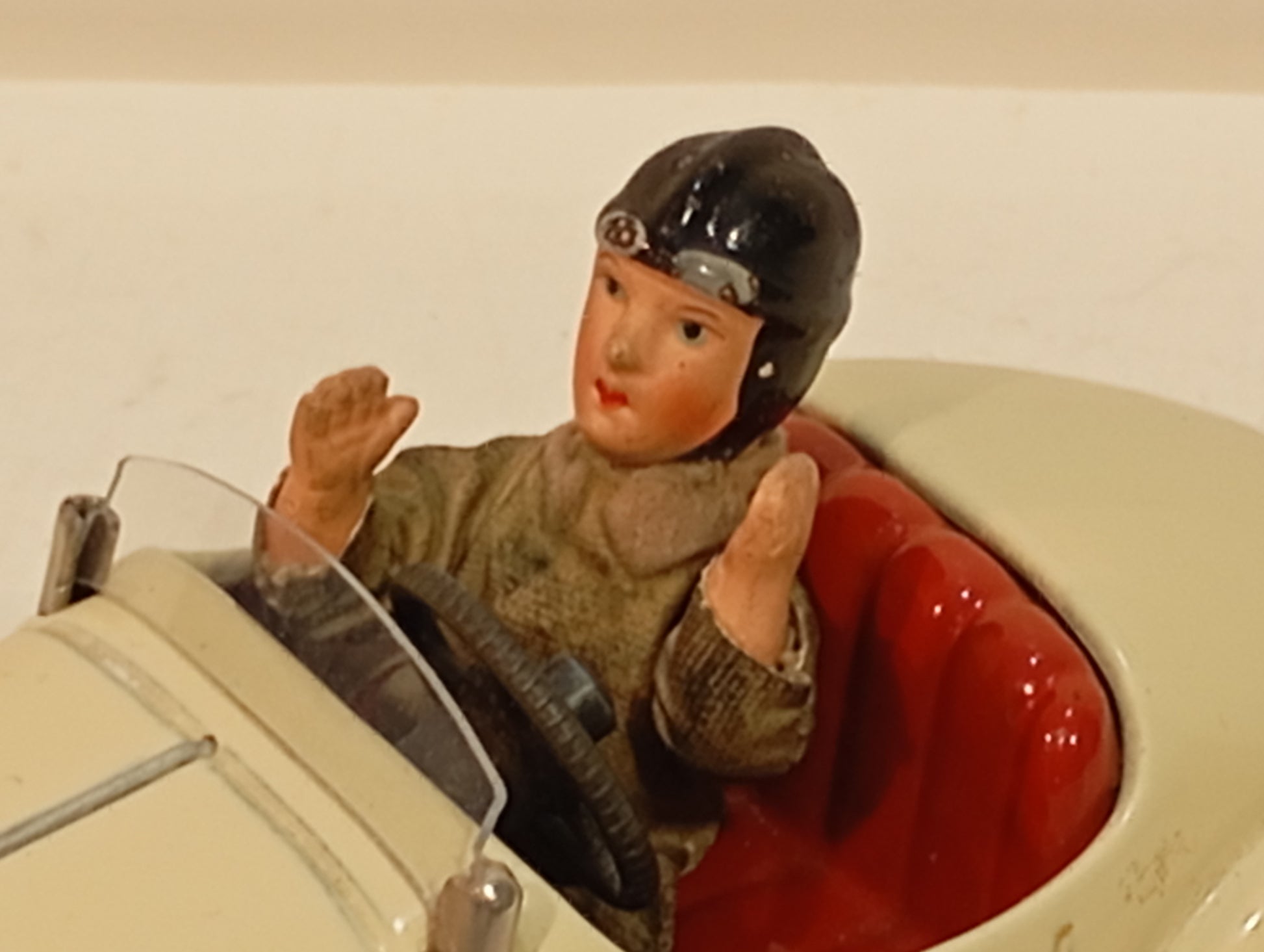 Mit der heißbegehrten originalen Fritz-Fahrerfigur, um die sich so manche Legende rankt. Für diese besondere Figur bin ich vor einigen Jahren sogar einmal 1.000 Kilometer gefahren. Es handelt sich um ein Vorkriegsmodell aus den 1940er Jahren, komplett mit originaler Beschreibung. Das Fahrzeug befindet sich in neuwertigem Zustand, beide Uhrwerke funktionieren einwandfrei. Originaler Schlüssel und Beschreibung sind selbstverständlich vorhanden. Unberührter Originalzustand – besser geht es kaum. Höhe: 14 cm.
