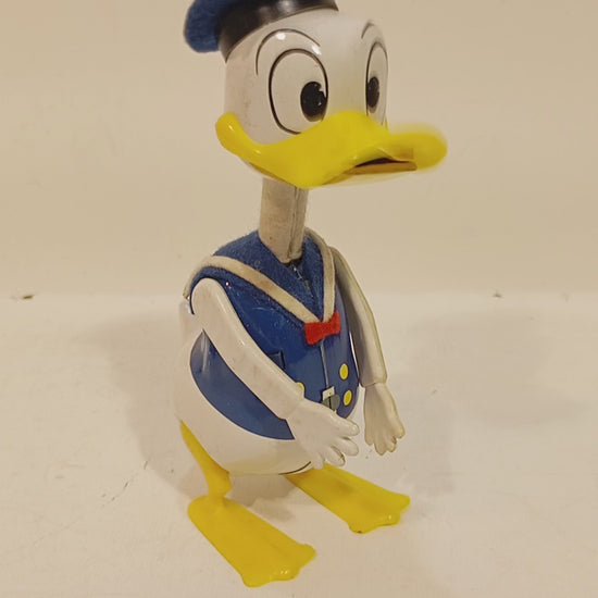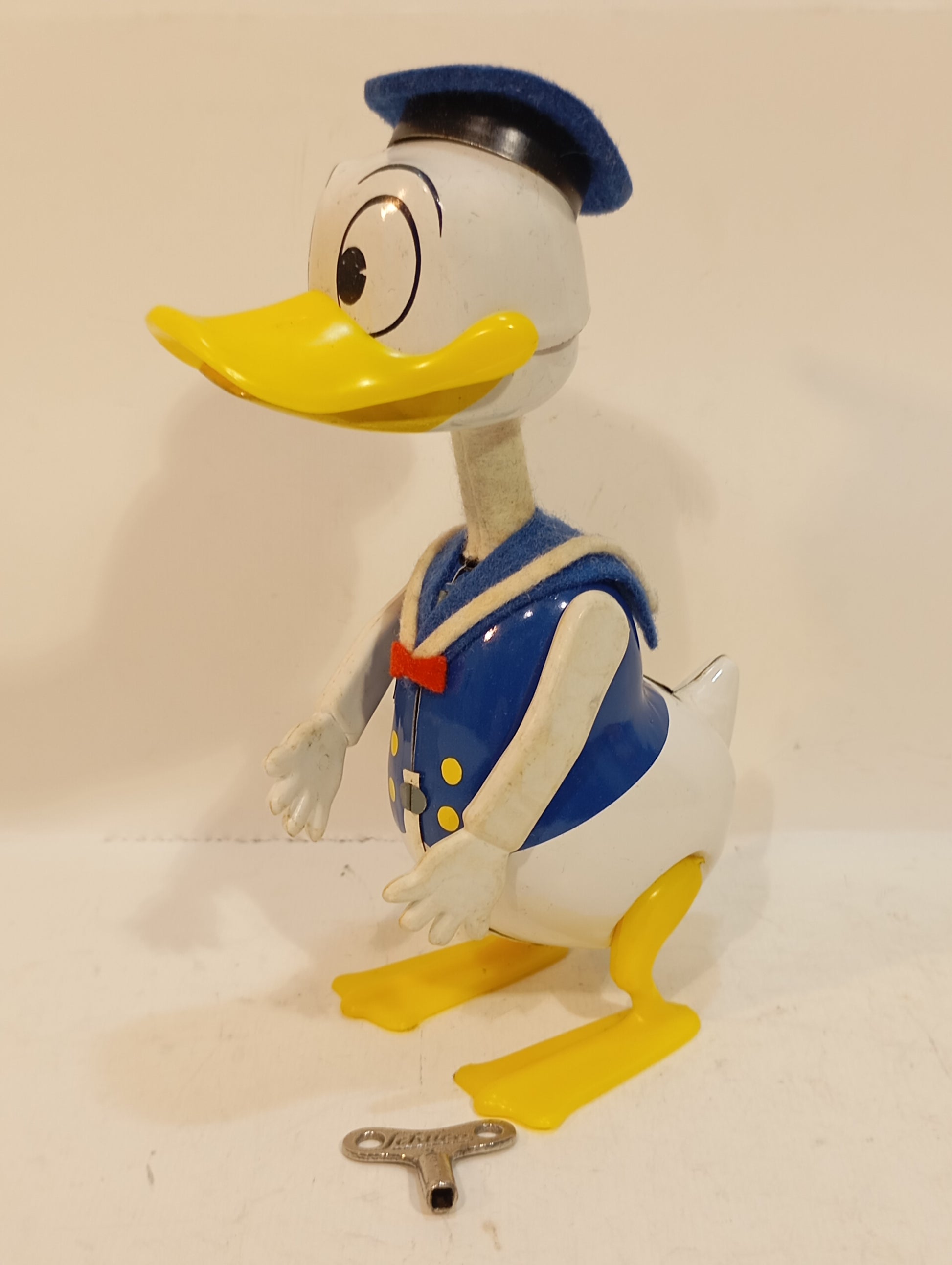 Donald Duck aus den 1960er-Jahren, mit gelbem Schnabel und gelben Füßen. Spätere Ausführung in perfektem Originalkarton. Die Figur selbst ist makellos, das Uhrwerk funktioniert einwandfrei. Höhe: 16 cm.