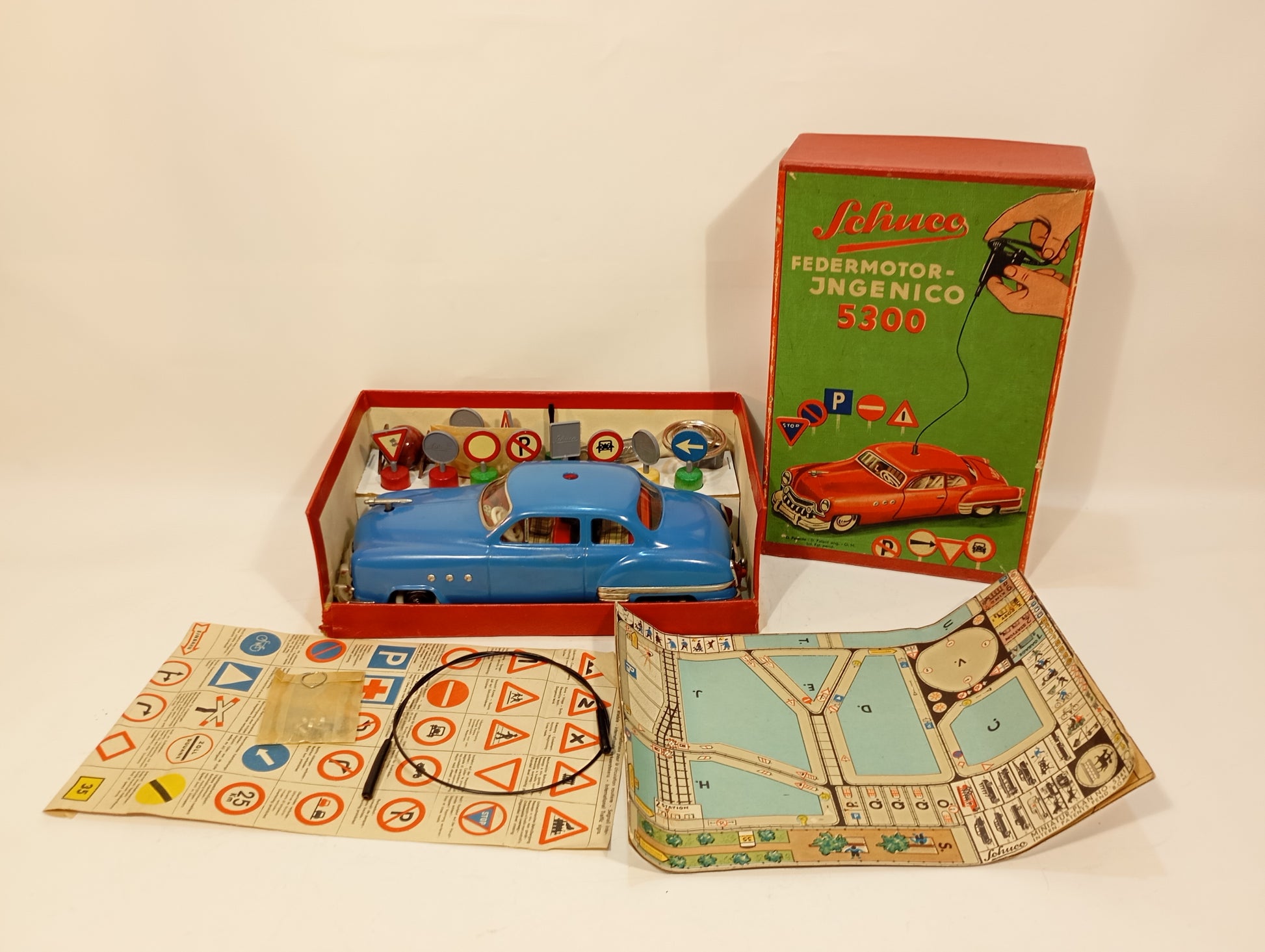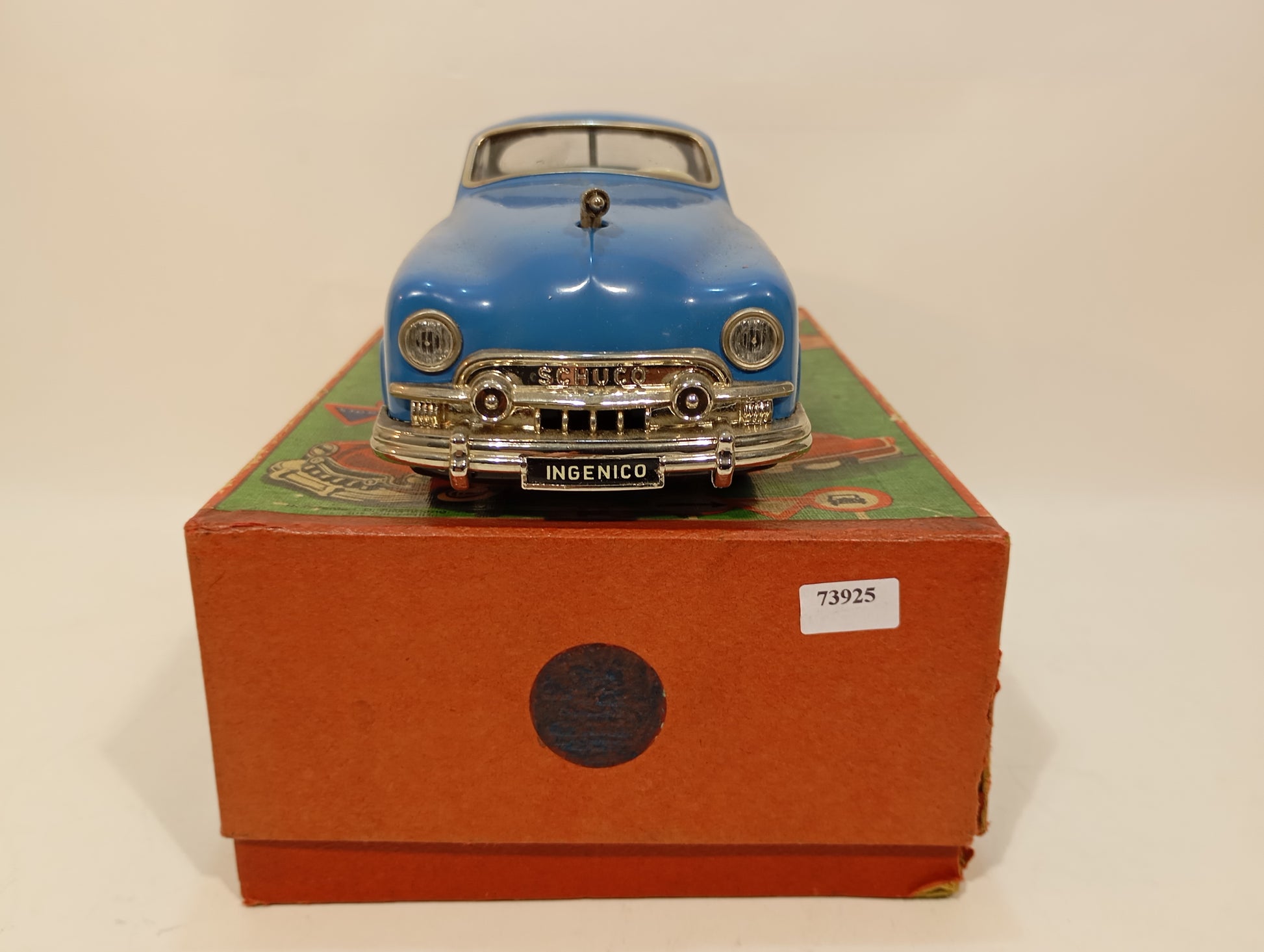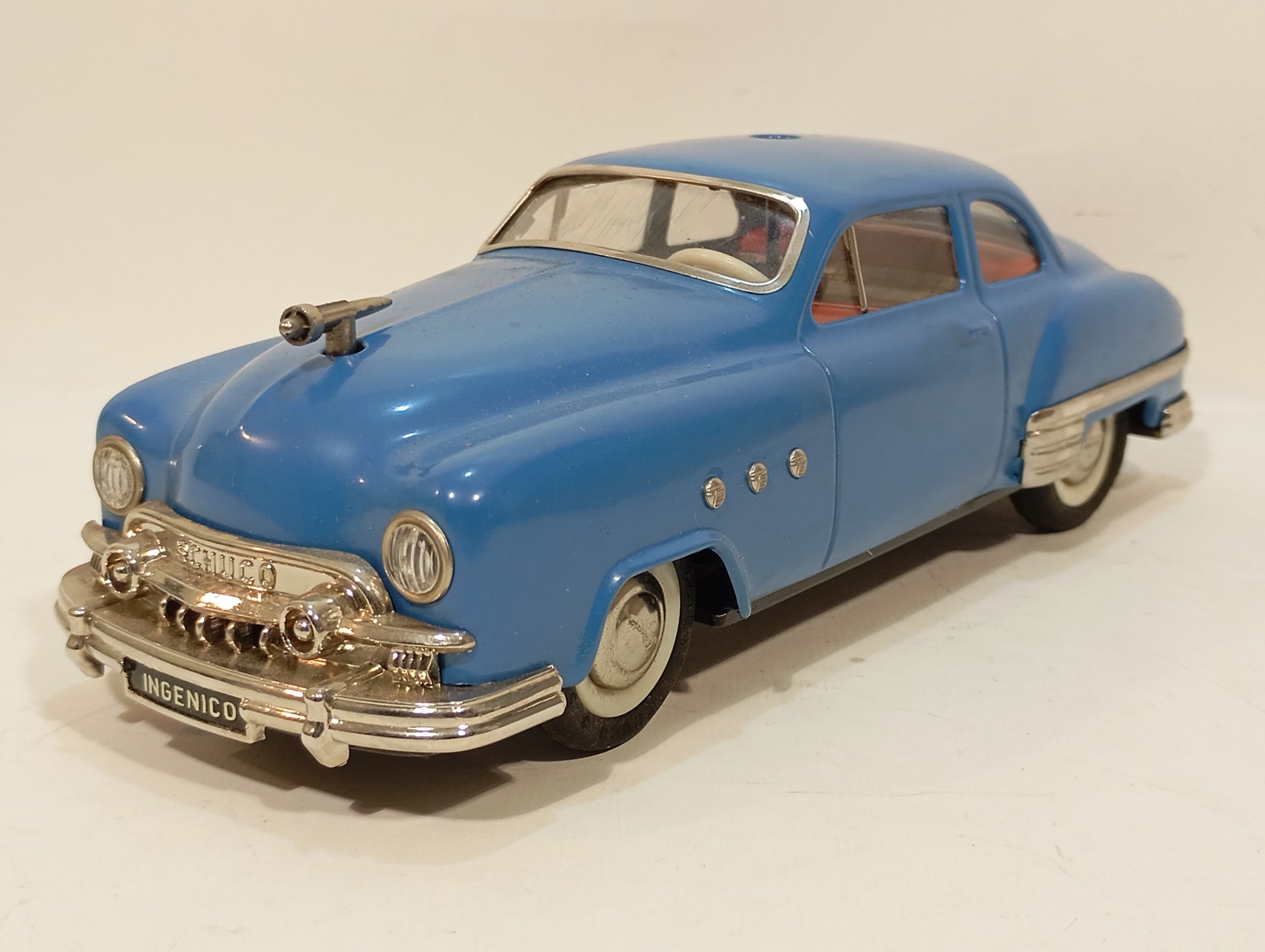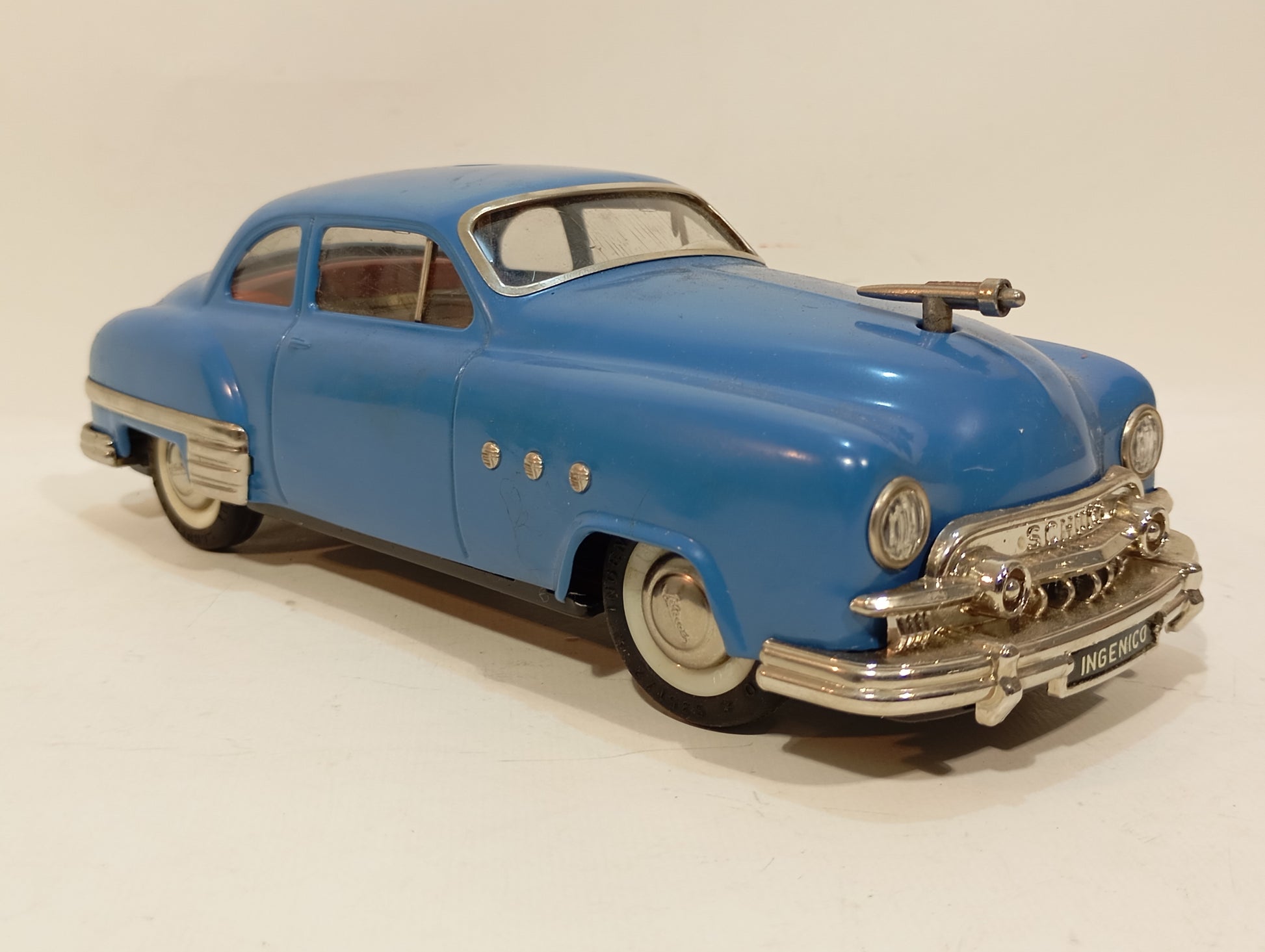 Eine echte Rarität in dieser seltenen Farbgebung (Babyblau), zusätzlich beeindruckend durch den nahezu perfekten Originalzustand. Der Lack ist noch werkseitig matt und leichtes Wachs ist sogar noch zu fühlen. Es handelt sich um die Variante mit Uhrwerksmotor, der natürlich funktioniert (Vor/Rückwärts + Start/Stop). Sämtliches originales Zubehör ist vorhanden. Der Originalkarton befindet sich in einem fast neuwertigen Zustand, lediglich mit minimalem Kantenabrieb und einem kleinen Einriss an einer Seite. Das Stück stammt aus den 50er Jahren. Besonders begehrt sind die Uhrwerksversionen des Schuco Ingenico, da sie nur selten angeboten werden. Länge: 22 cm.