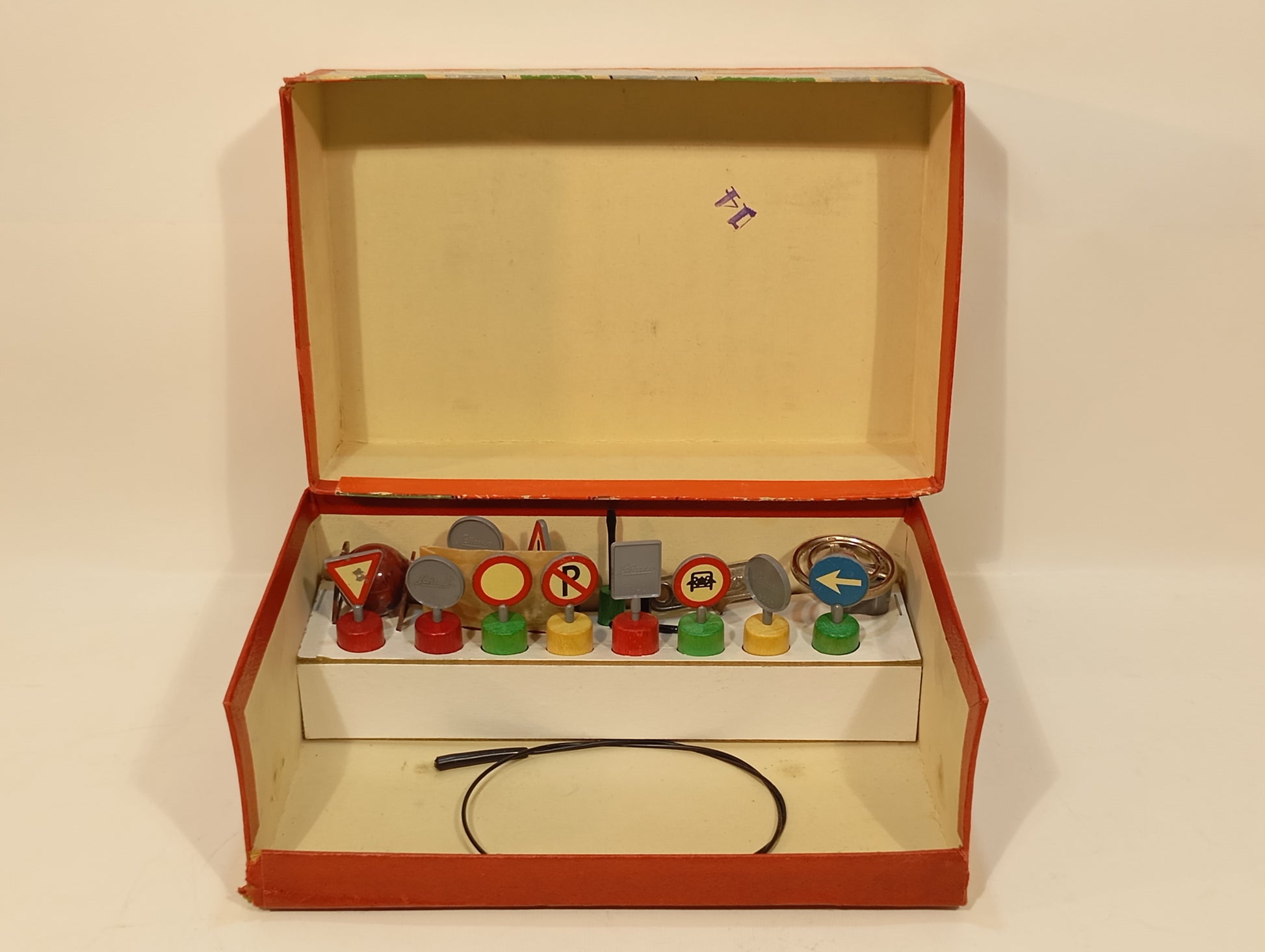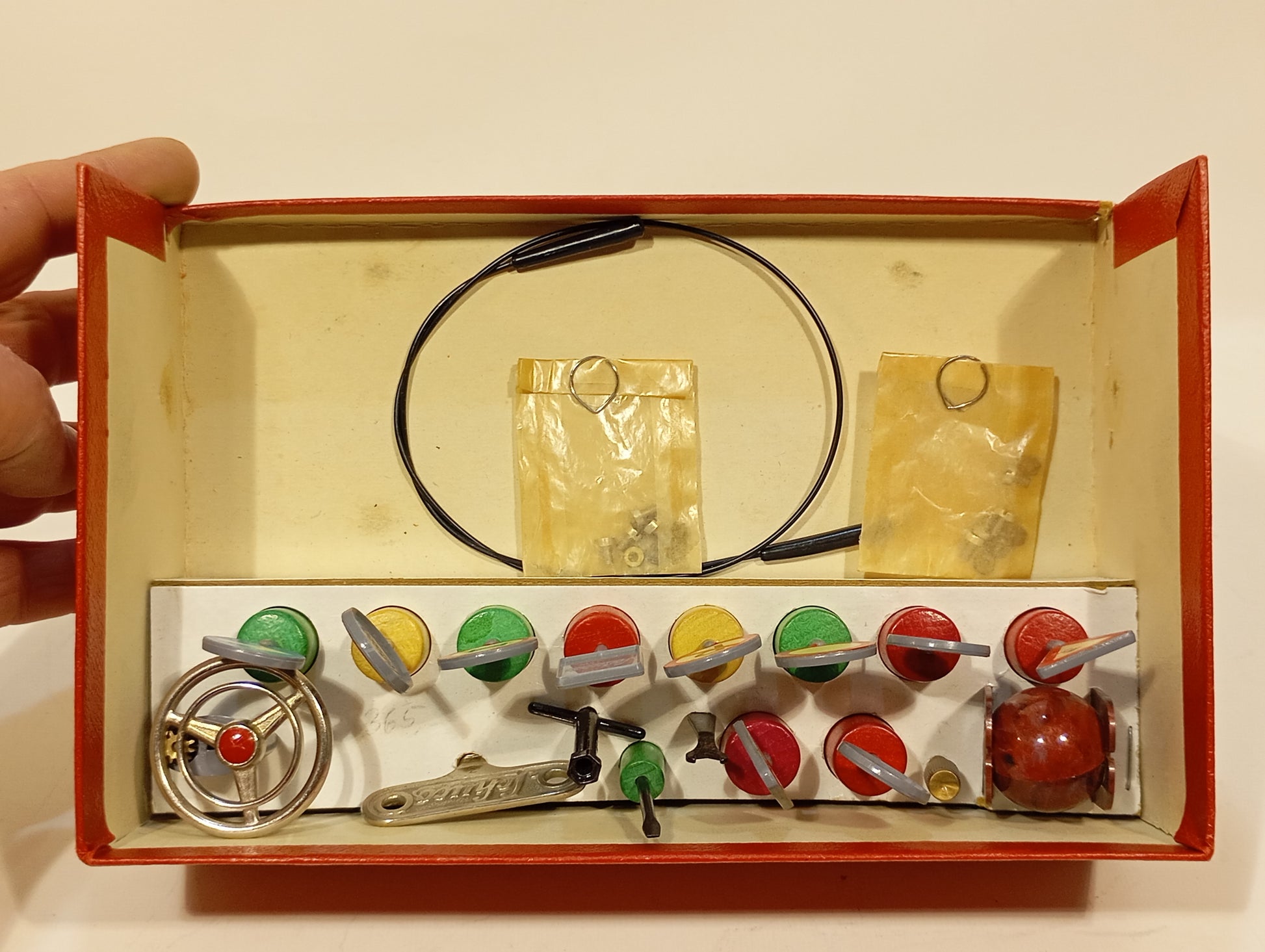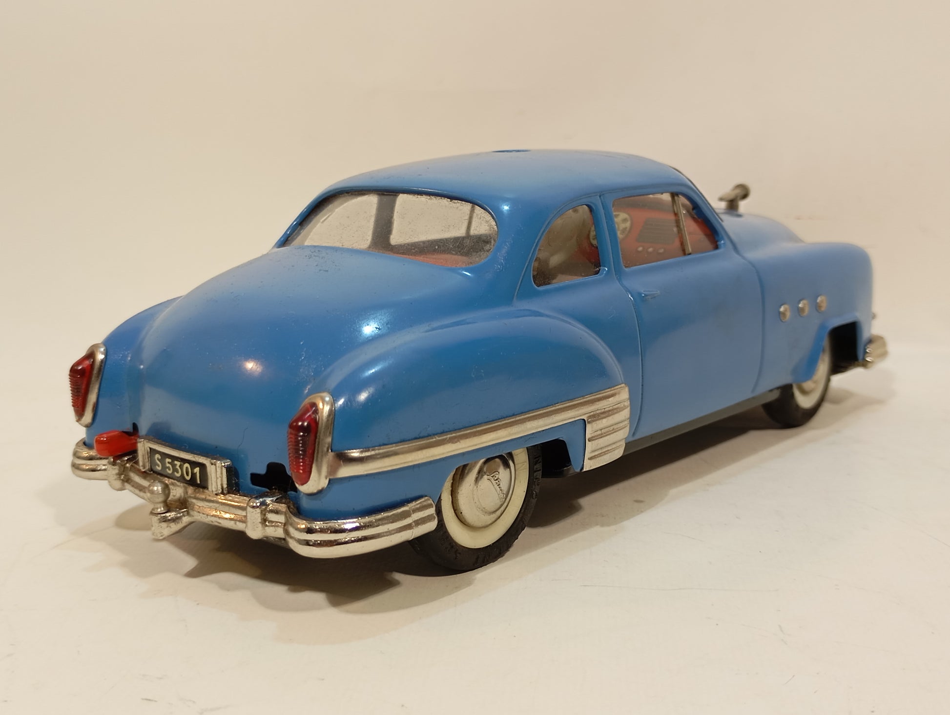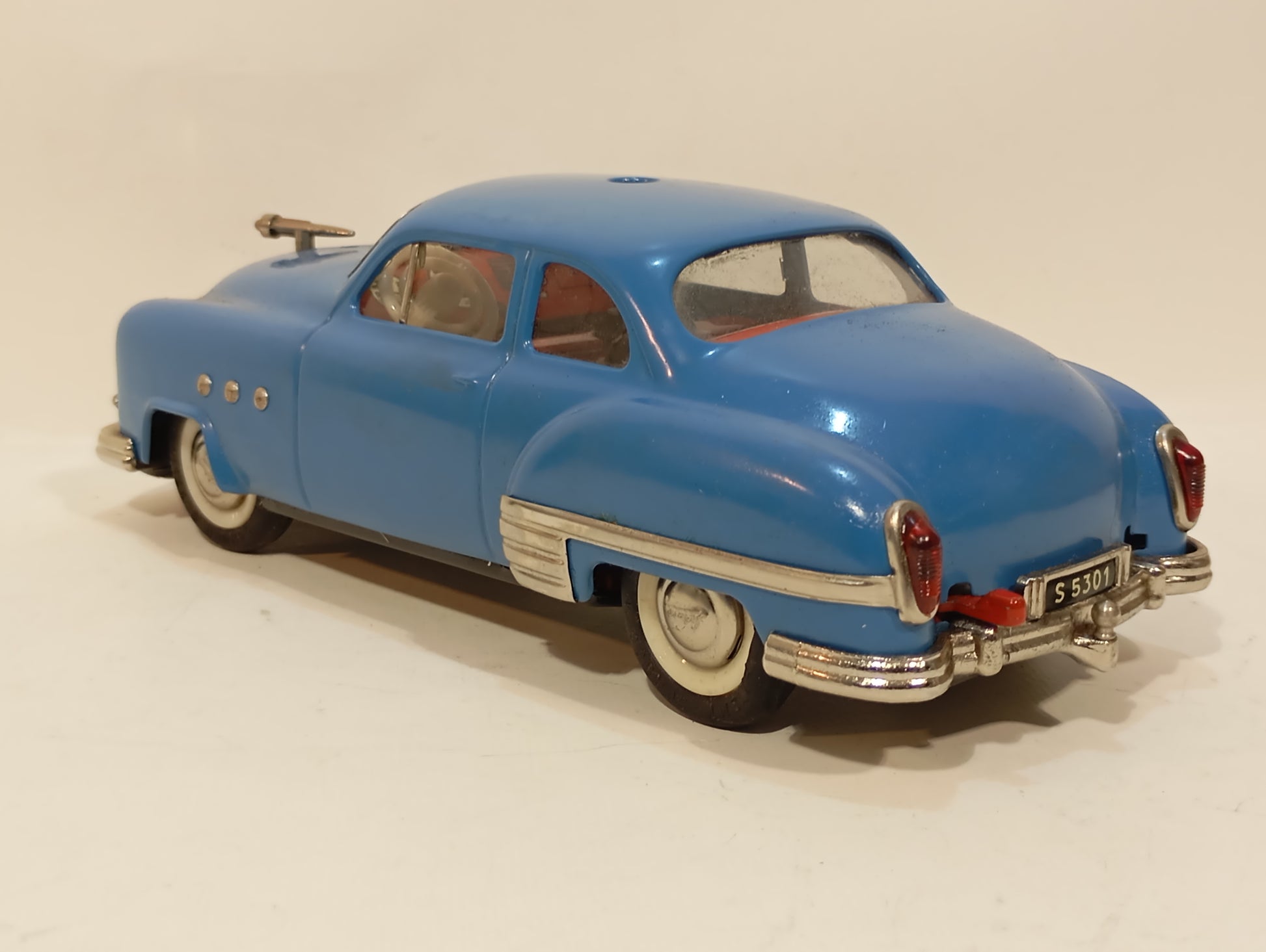 Eine echte Rarität in dieser seltenen Farbgebung (Babyblau), zusätzlich beeindruckend durch den nahezu perfekten Originalzustand. Der Lack ist noch werkseitig matt und leichtes Wachs ist sogar noch zu fühlen. Es handelt sich um die Variante mit Uhrwerksmotor, der natürlich funktioniert (Vor/Rückwärts + Start/Stop). Sämtliches originales Zubehör ist vorhanden. Der Originalkarton befindet sich in einem fast neuwertigen Zustand, lediglich mit minimalem Kantenabrieb und einem kleinen Einriss an einer Seite. Das Stück stammt aus den 50er Jahren. Besonders begehrt sind die Uhrwerksversionen des Schuco Ingenico, da sie nur selten angeboten werden. Länge: 22 cm.